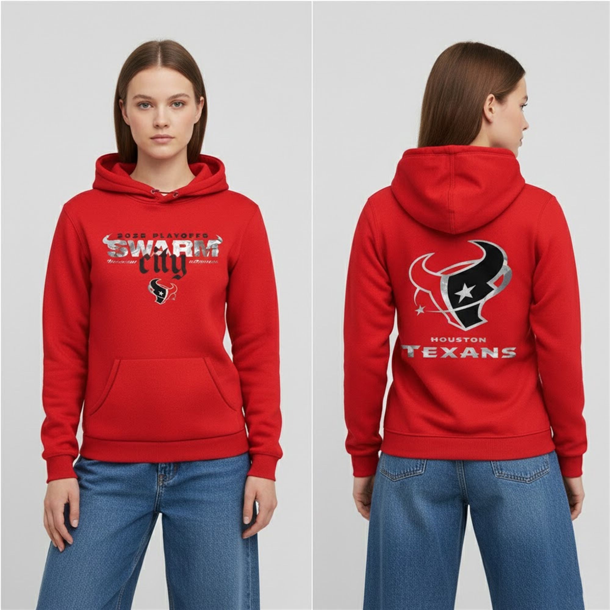 In late December 2025, a fan-captured video from the “Bull Pen” section went viral on TikTok, showing thousands of fans engaging in a synchronized “Swarm” chant while wearing this specific red hoodie. The visual of a united “Red Sea” jumping in unison caught the attention of major sports networks and even Texans players, who started wearing the hoodie during post-game press conferences. It became the symbol of the team’s “us against the world” mentality, turning a simple piece of merchandise into a mandatory icon of the 2025 playoff push.