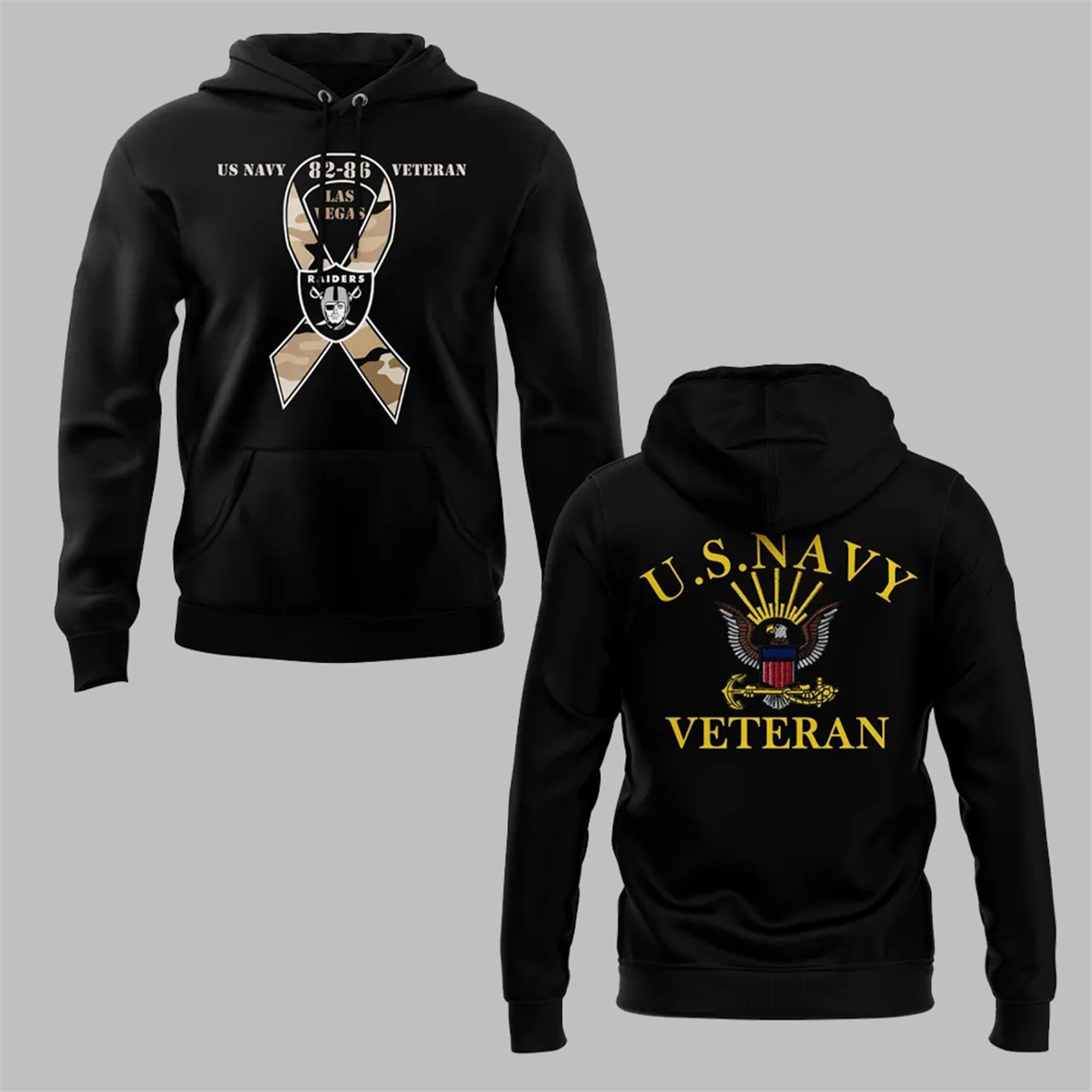 This Las Vegas Raiders US Navy Veteran Shirt is a powerful emblem of two profound commitments: one to your country and one to your team. Meticulously designed, it seamlessly merges the iconic symbols of the U.S. Navy with the unmistakable identity of the Las Vegas Raiders. The front of the shirt features a striking awareness ribbon, rendered in a rugged desert camouflage pattern, symbolizing resilience and remembrance. Encased within this ribbon is the fierce Las Vegas Raiders shield, a logo synonymous with dedication and a renegade spirit. The text “US NAVY,” “VETERAN,” and the specific service years “82-86” frame the design, making it an exclusive tribute to your specific era of service. The back completes the homage with a bold “U.S. NAVY VETERAN” crest, featuring a majestic eagle and anchor, ensuring your pride is visible from every angle.