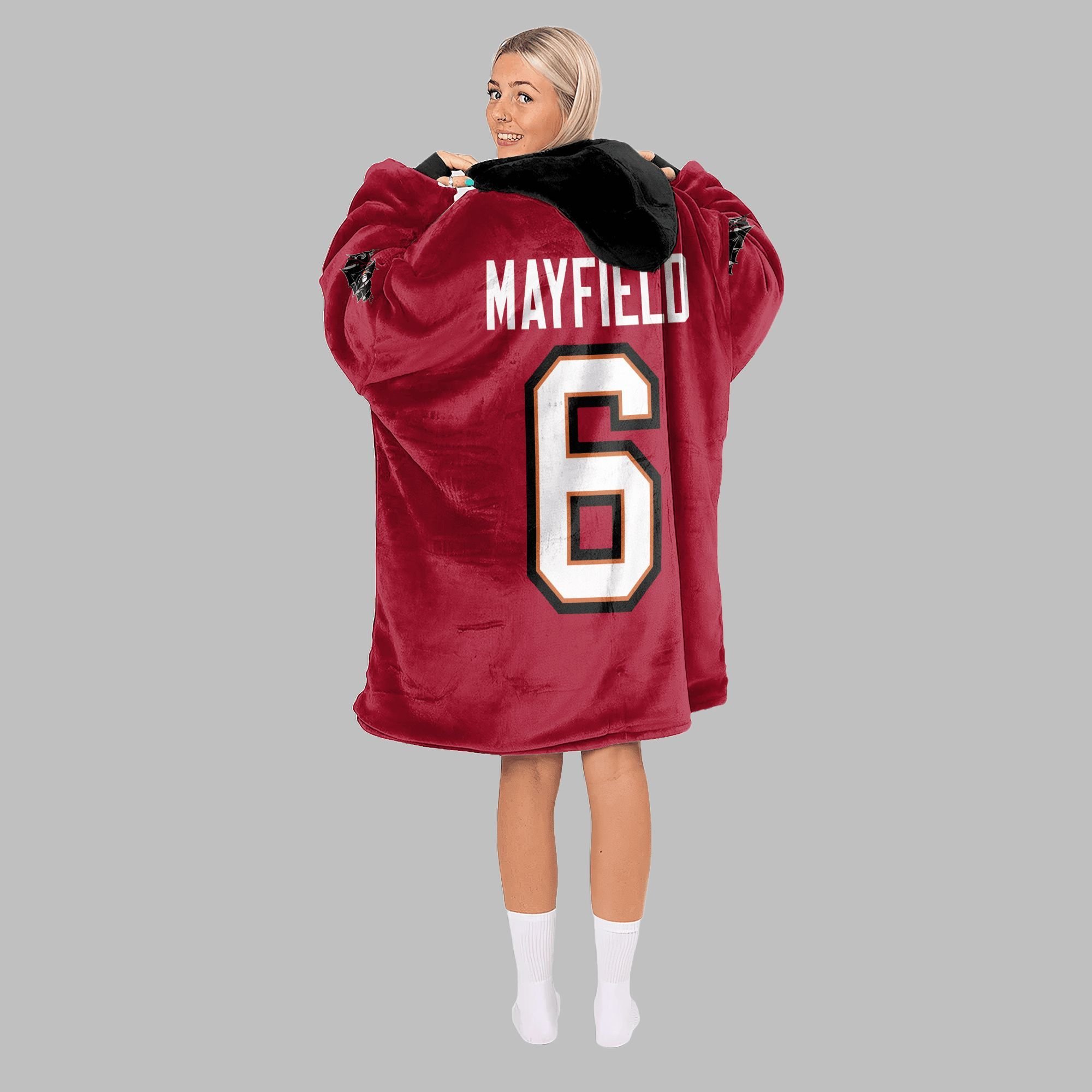 Celebrate every touchdown, every crucial first down, and every victory in a cocoon of warmth. This wearable blanket is your personal comfort zone for the entire 2025 season. It’s designed for the dedicated fan who endures every high and low of the game. The front proudly displays the iconic “Raise the Flags” slogan and the Tampa Bay Buccaneers team crest, making your loyalty unmistakable. The back is a full-scale tribute to the Bucs’ field general, featuring “MAYFIELD” and his #6 in bold, jersey-style lettering, so everyone knows whose side you’re on.