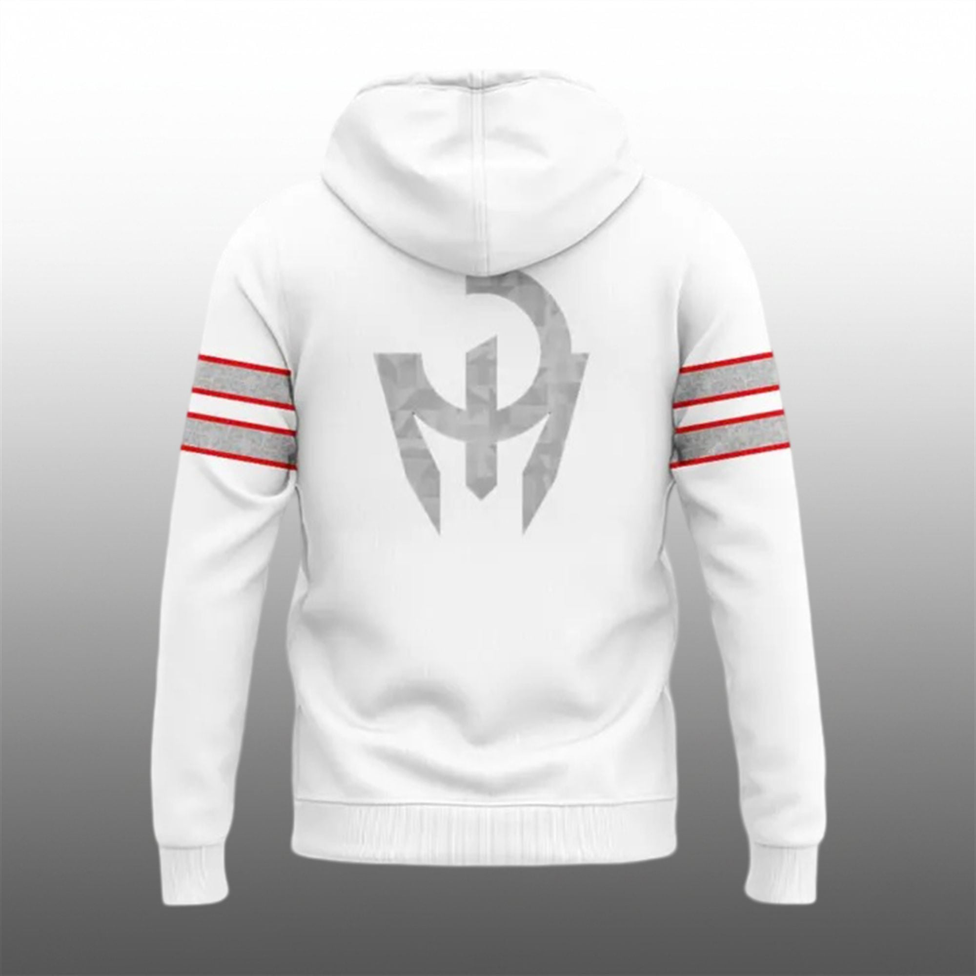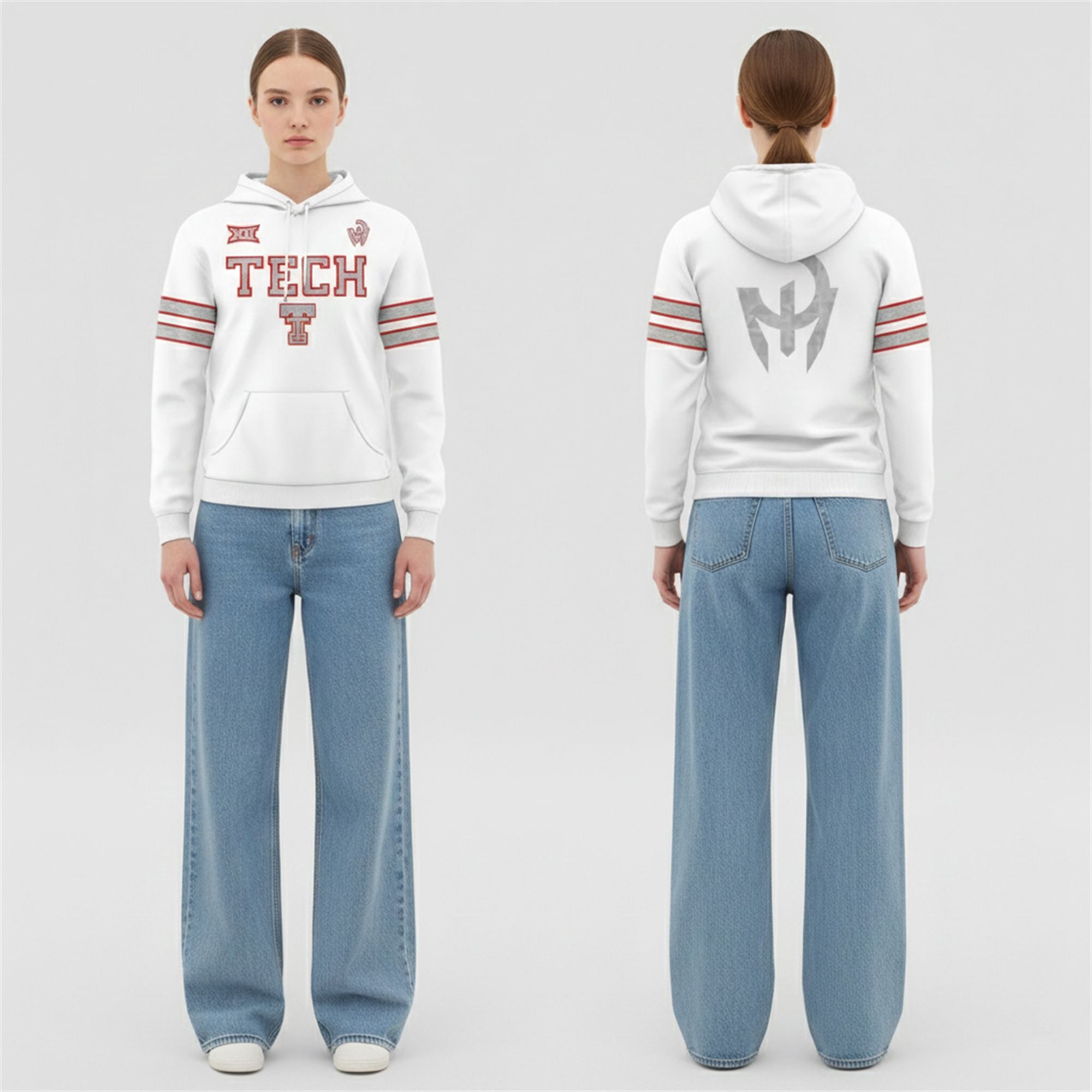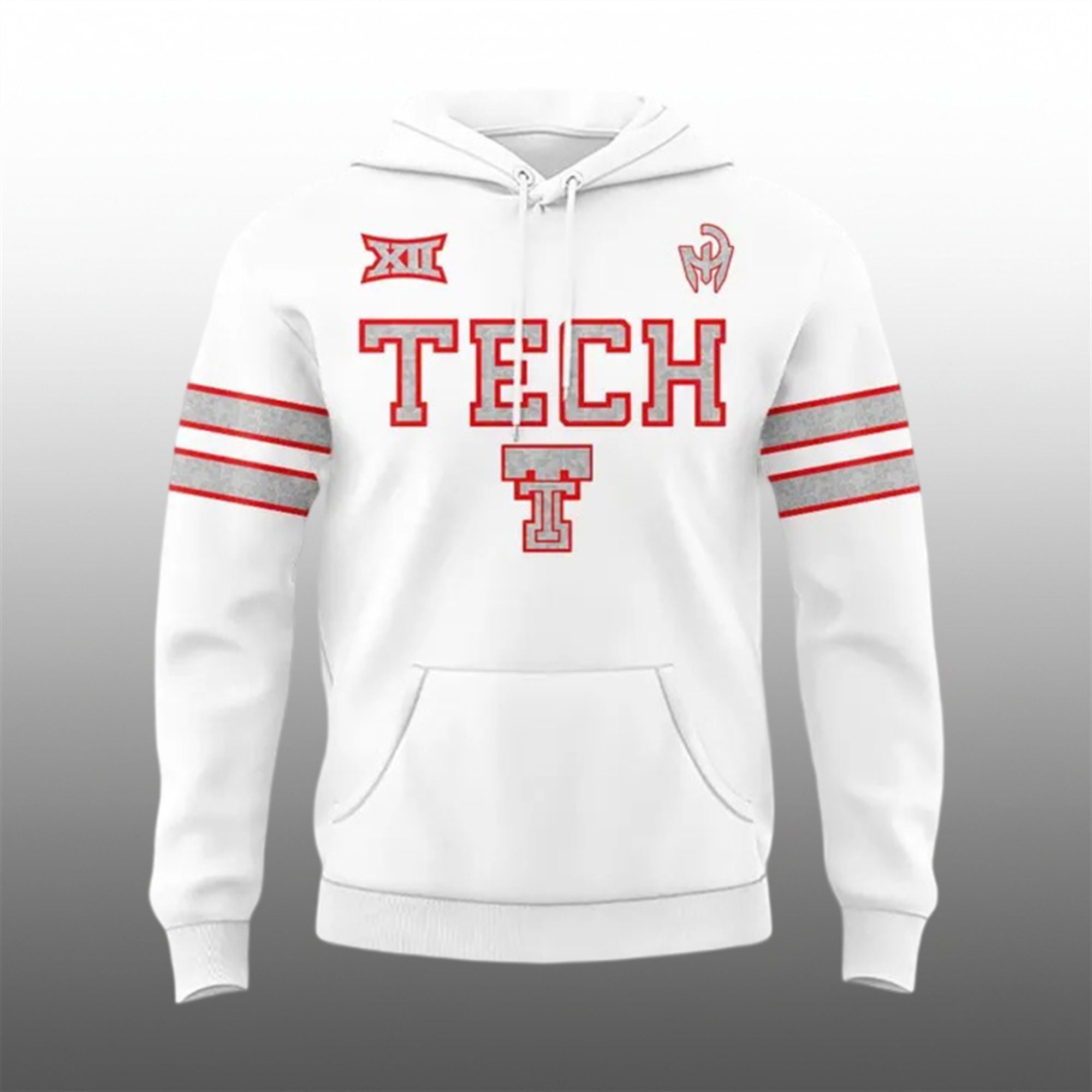 The 2025 Cold Front Hoodie is a masterclass in modern sports design. The base is a brilliant, snow-white fabric that serves as the canvas for the metallic and “Power Red” accents. Across the chest, the bold “TECH” wordmark is rendered in a galvanized grey finish with a striking red outline, mimicking the bevel-inspired typography of the on-field jerseys. The iconic “Double T” logo sits proudly below, grounding the futuristic design in deep-rooted tradition. Sleek grey and red striping on the sleeves adds an athletic, varsity-inspired touch that breaks up the white silhouette without cluttering the clean visual profile.