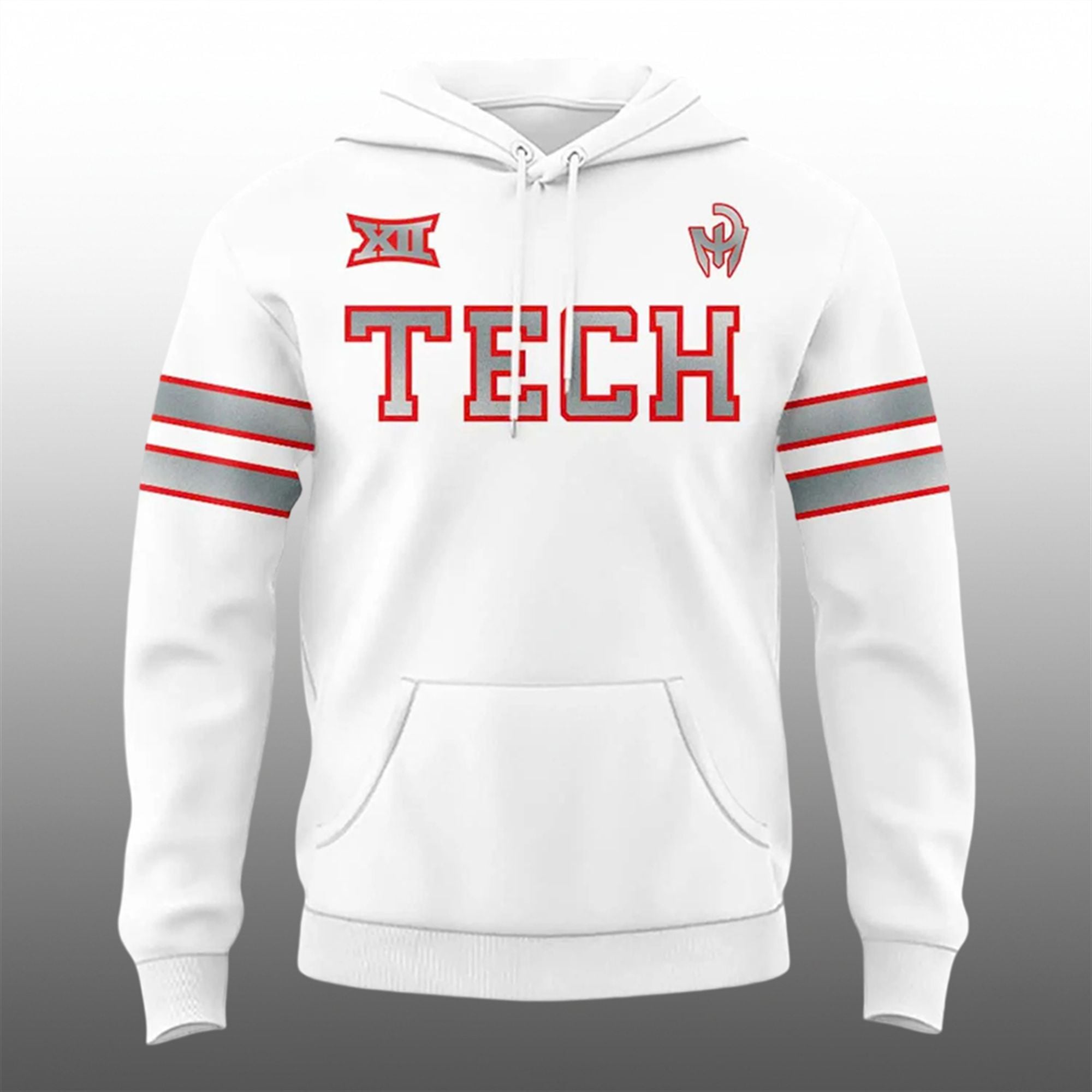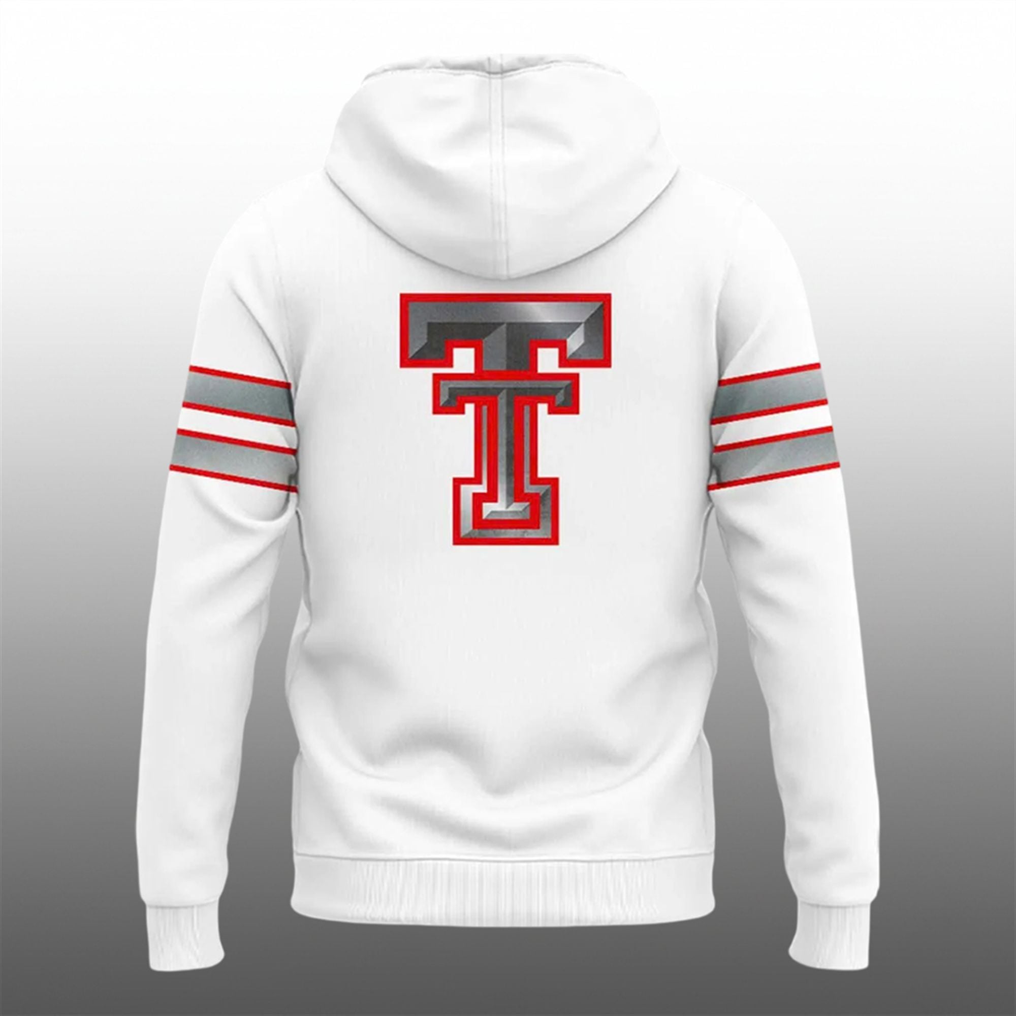 As the temperature drops, the heat turns up on Red Raiders fashion. Introducing the 2025 Red Raiders x Patrick Mahomes Cold Front Hoodie. Moving away from the standard black and red, this striking all-white silhouette features metallic silver accents and bold “TECH” lettering that commands attention.