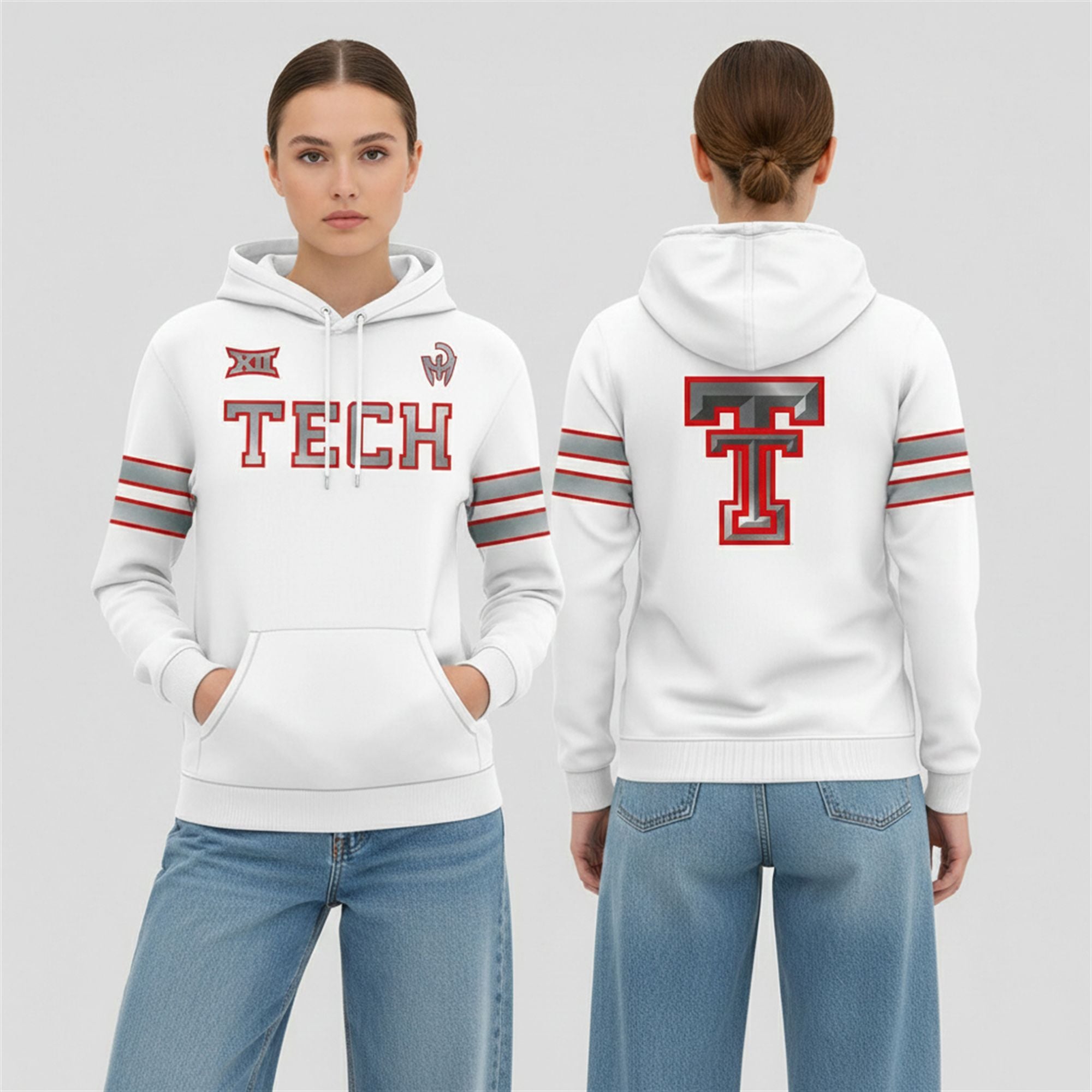 Visually, the hoodie is stunning. It features a pristine “Ice White” base that serves as the perfect canvas for the bold red and metallic silver graphics. Across the chest, “TECH” is emblazoned in a collegiate block font with a sharp 3D-style outline, flanked by the Big 12 logo on the right chest and Patrick Mahomes’ signature Gladiator logo on the left. The sleeves feature dual racing stripes in red and grey, adding a sporty, retro-athletic feel. The back of the hoodie showcases a massive, metallic-textured “Double T” logo, ensuring your allegiance is visible from every angle.