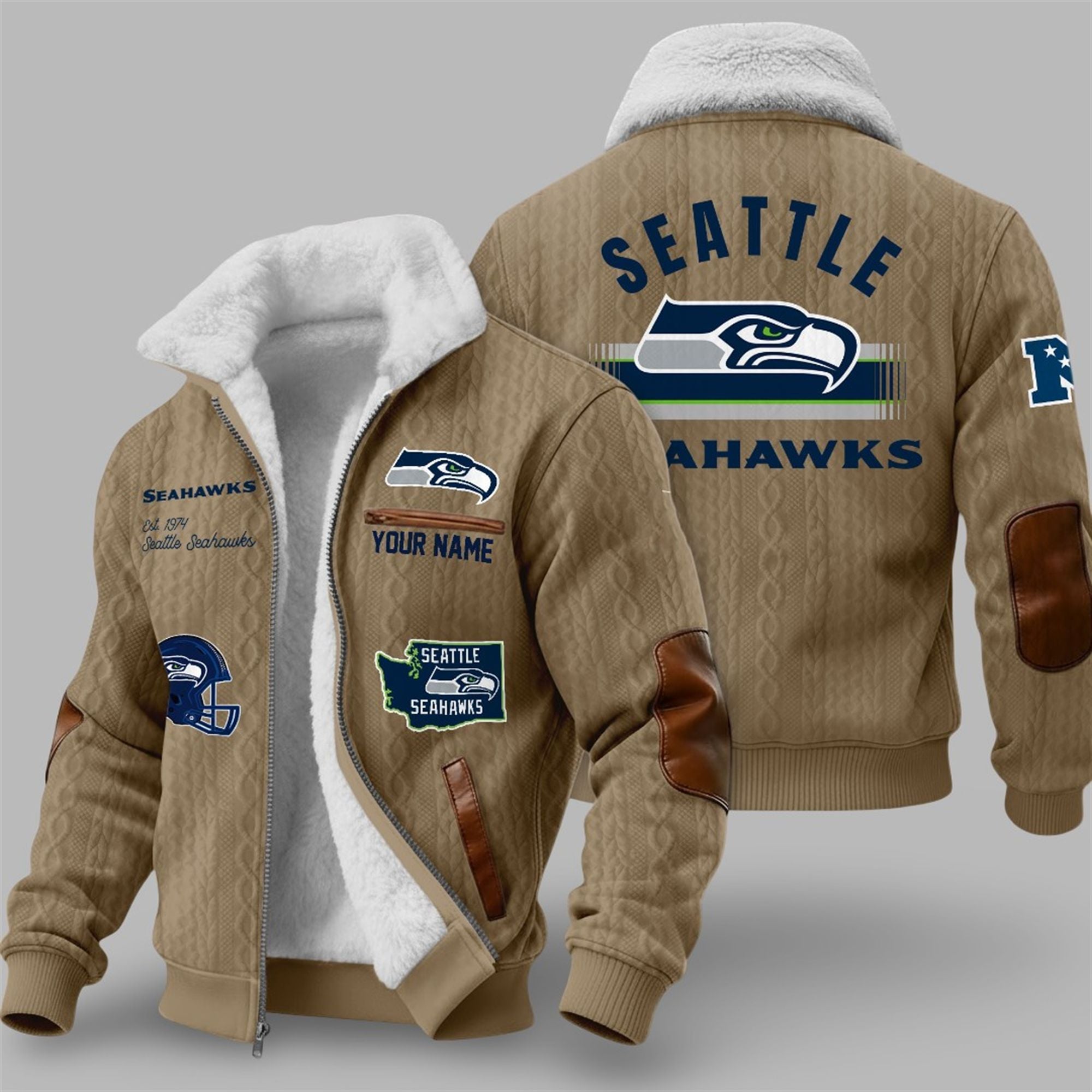As temperatures drop across the Pacific Northwest, stay insulated without sacrificing style. The design proudly displays the Seahawks’ modern “aggressive hawk” logo across the back and chest, anchored by the bold “SEATTLE SEAHAWKS” typography. Special attention has been paid to the details: rich brown leather patches on the elbows and pocket trims add a rugged, masculine touch that contrasts beautifully with the deep Navy Blue body.