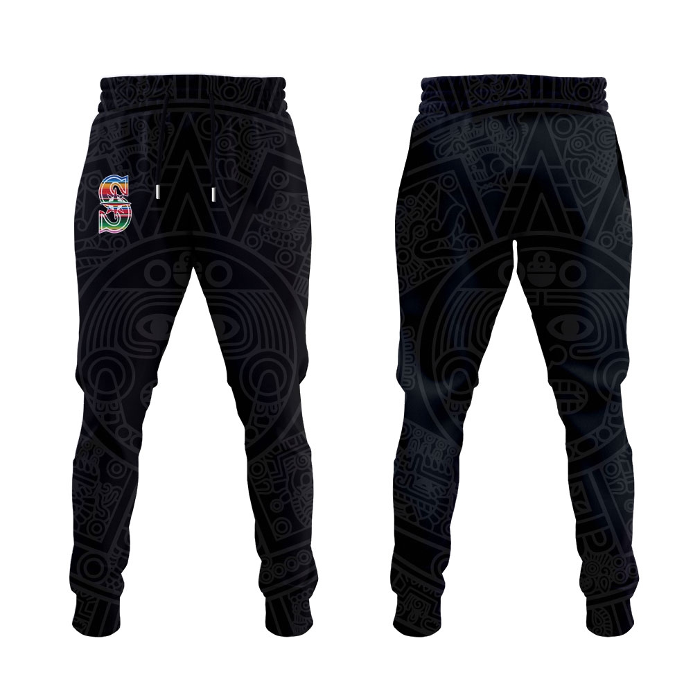 A prominent feature on one sleeve is the iconic Mexican flag, a direct and proud representation of the heritage being celebrated. The back of the jersey showcases a large Mariners “S” logo, uniquely stylized with the same colorful sarape-like pattern filling its contours. Furthermore, a subtle, intricate pattern graces the background fabric of the jersey, possibly inspired by ancient Mesoamerican art or Aztec designs, adding a layer of depth and cultural reverence to the overall aesthetic.