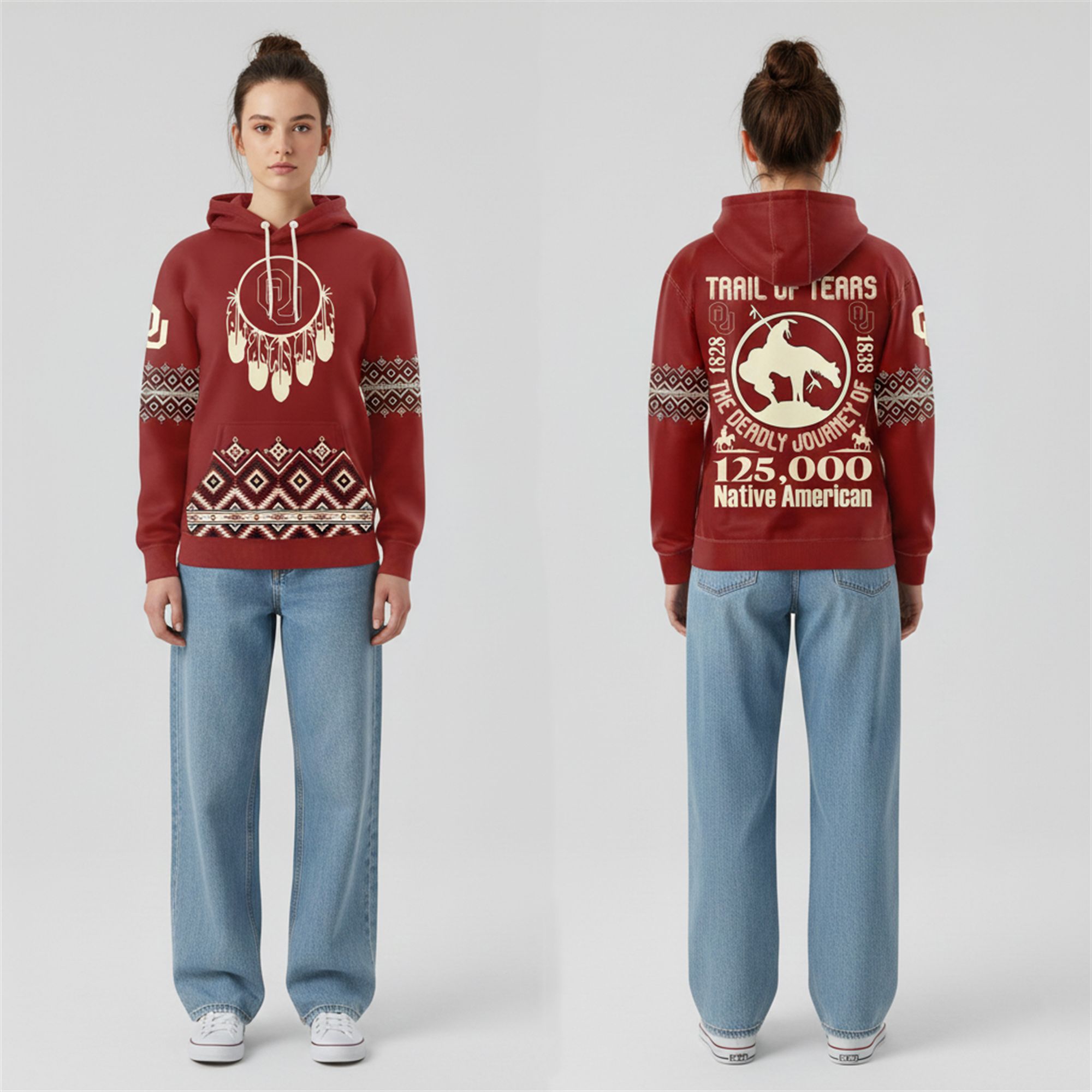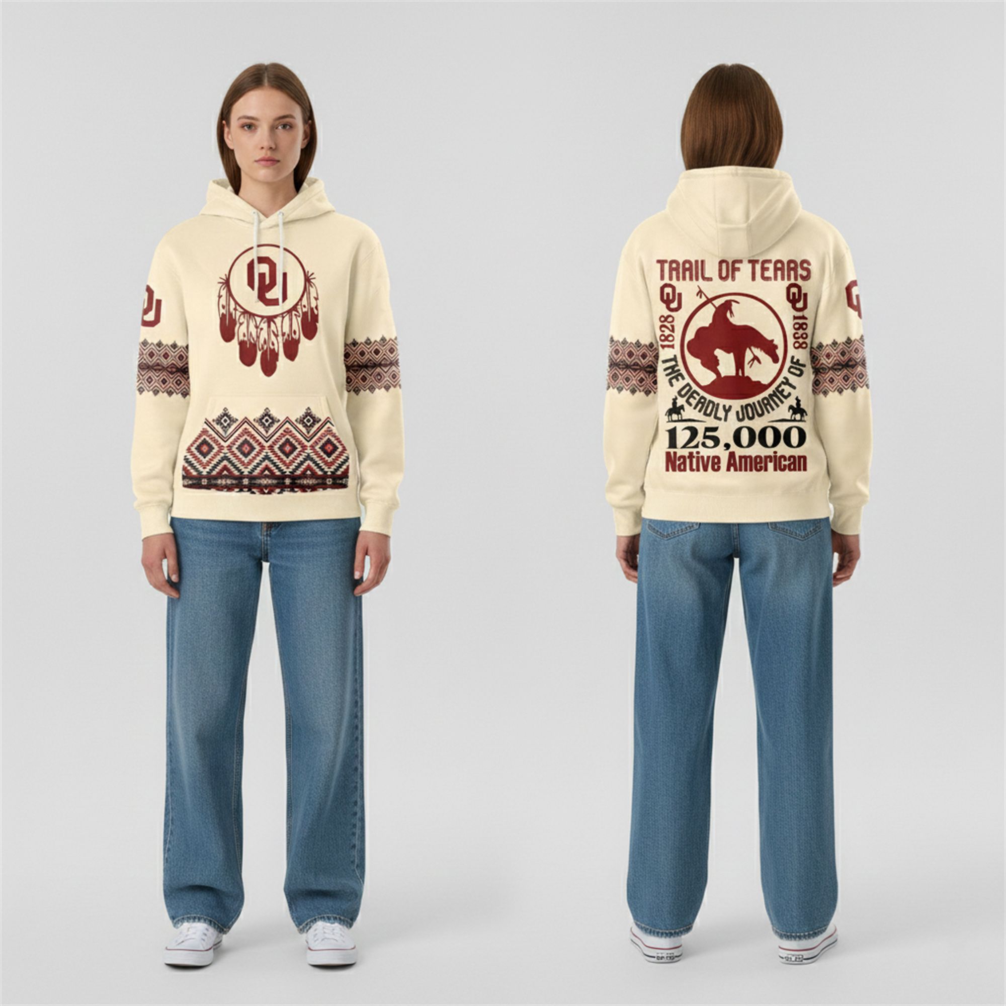 The back of the hoodie delivers its most powerful message. It features a large, distressed-style graphic commemorating the Trail of Tears (1828-1838). The design includes a silhouette of a weary rider on horseback—the “End of the Trail” imagery—framed by the text “The Deadly Journey of 125,000 Native American.” This hoodie serves as a memorial to the displacement and endurance of the tribes that shaped Oklahoma (historically known as Indian Territory).