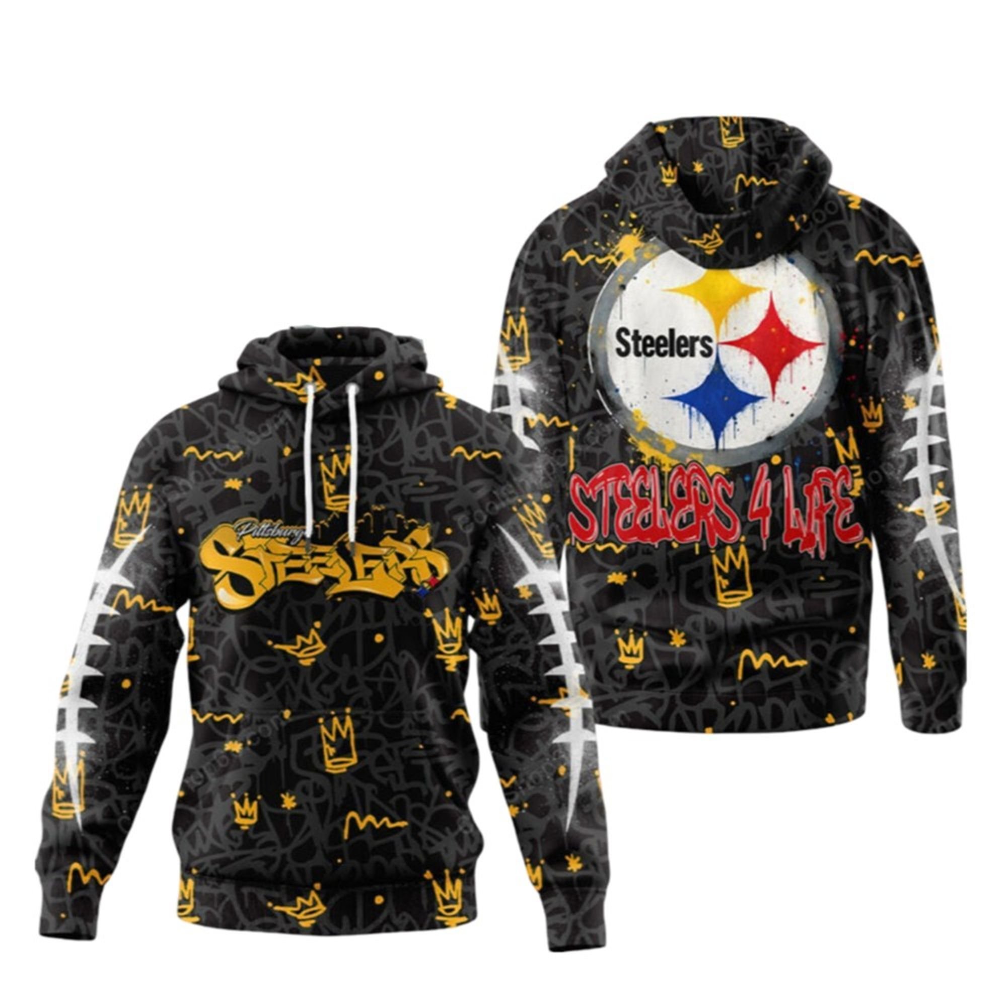 The front of the hoodie explodes with a vibrant, gold-script “Steelers” logo, designed in a premium, stylized graffiti font. The back makes an even bolder statement, featuring the iconic Steelers hypocycloid logo reimagined with an artistic, spray-paint splatter effect. Underneath, the powerful “STEELERS 4 LIFE” motto is emblazoned in a striking red and white graffiti script, leaving no doubt about where your allegiance lies. The design is completed with unique, spray-painted accent marks running down both sleeves, adding an extra layer of attitude.