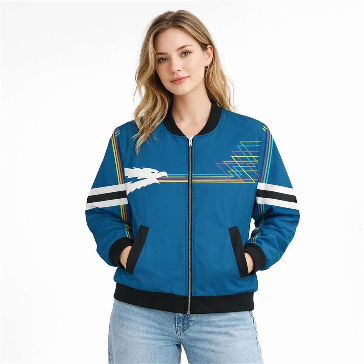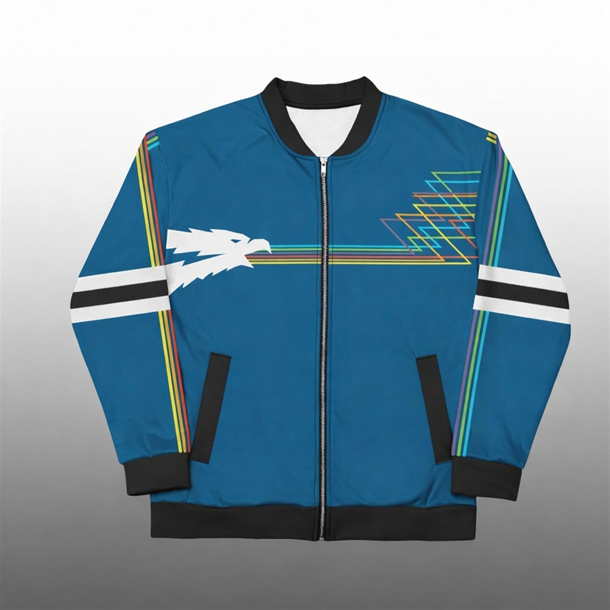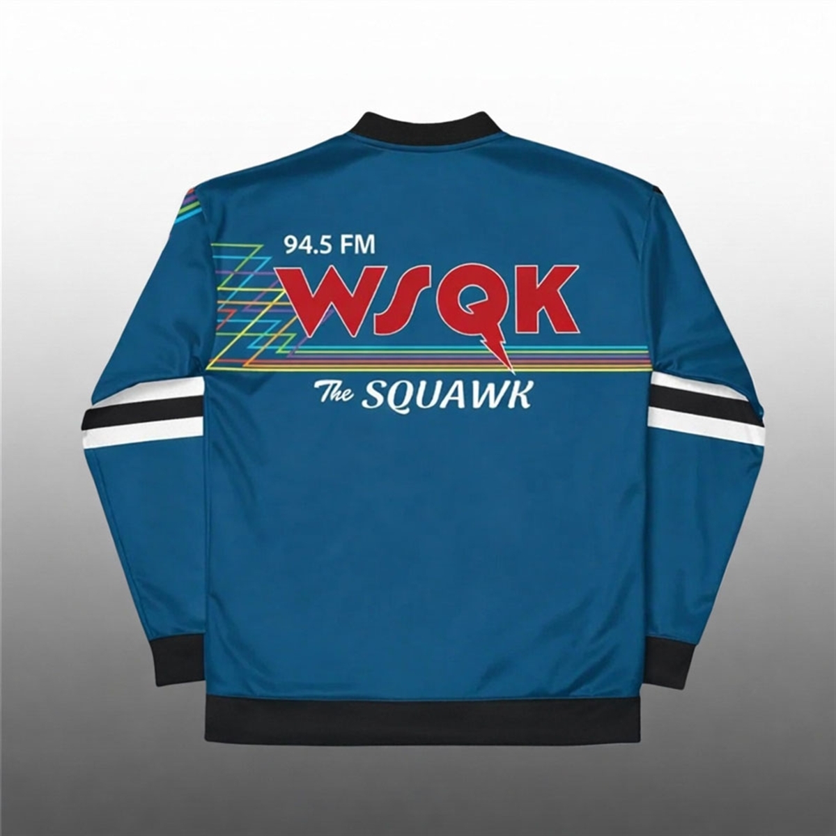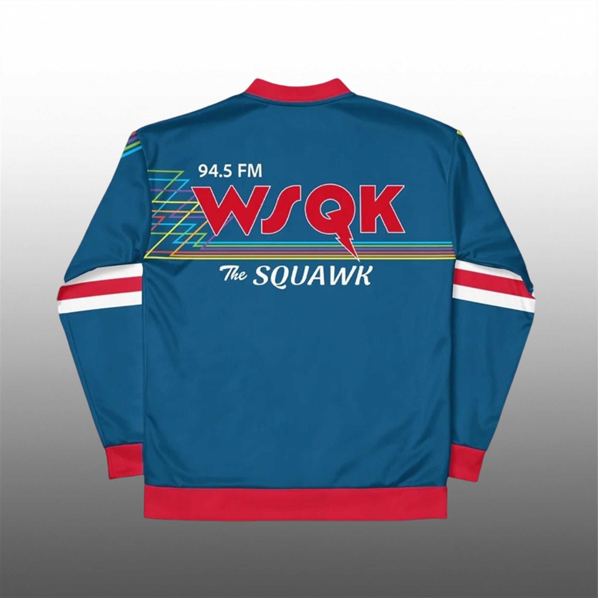 The standout feature is the intricate graphic work. The front showcases a stylized white eagle mascot—”The Squawk“—trailing a spectrum of neon rainbow lightning, a hallmark of 80s graphic design. The back features the station’s call letters WSQK in bold, block typography, split by a lightning bolt, sitting atop the “The SQUAWK” moniker. Flanked by geometric zig-zag spectrum lines on the sleeves and chest, this jacket screams retro-tech cool.