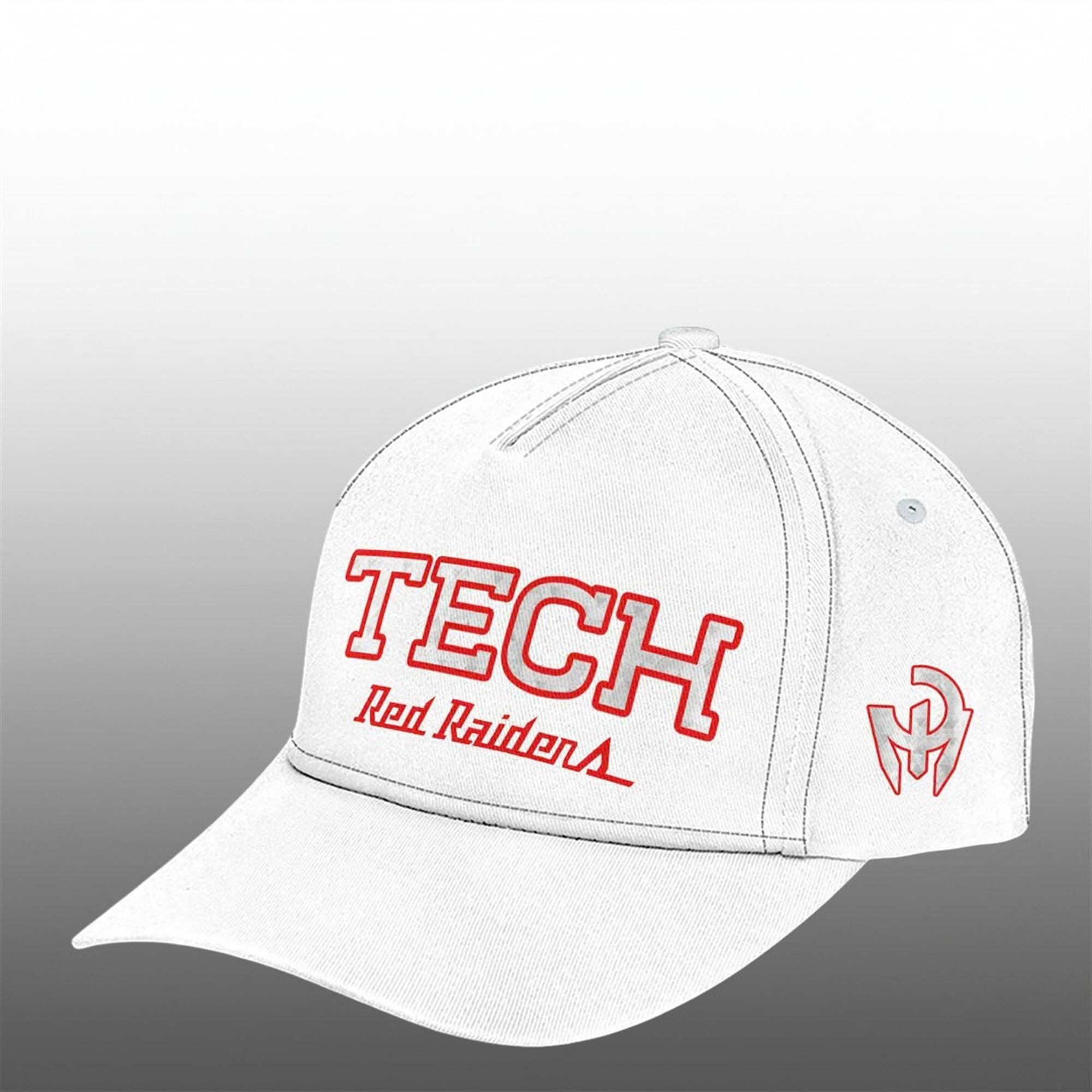 The front of the shirt features a bold, athletic aesthetic. The word “TECH” is emblazoned across the chest in a large, block font filled with a “Galvanized Iced” texture—a silver, diamond-like pattern that catches the eye and simulates a metallic sheen. Flanked by the Big 12 logo and the classic Double T, the design is grounded by the “Red Raiders” script in deep scarlet, creating a sharp contrast against the clean white fabric.