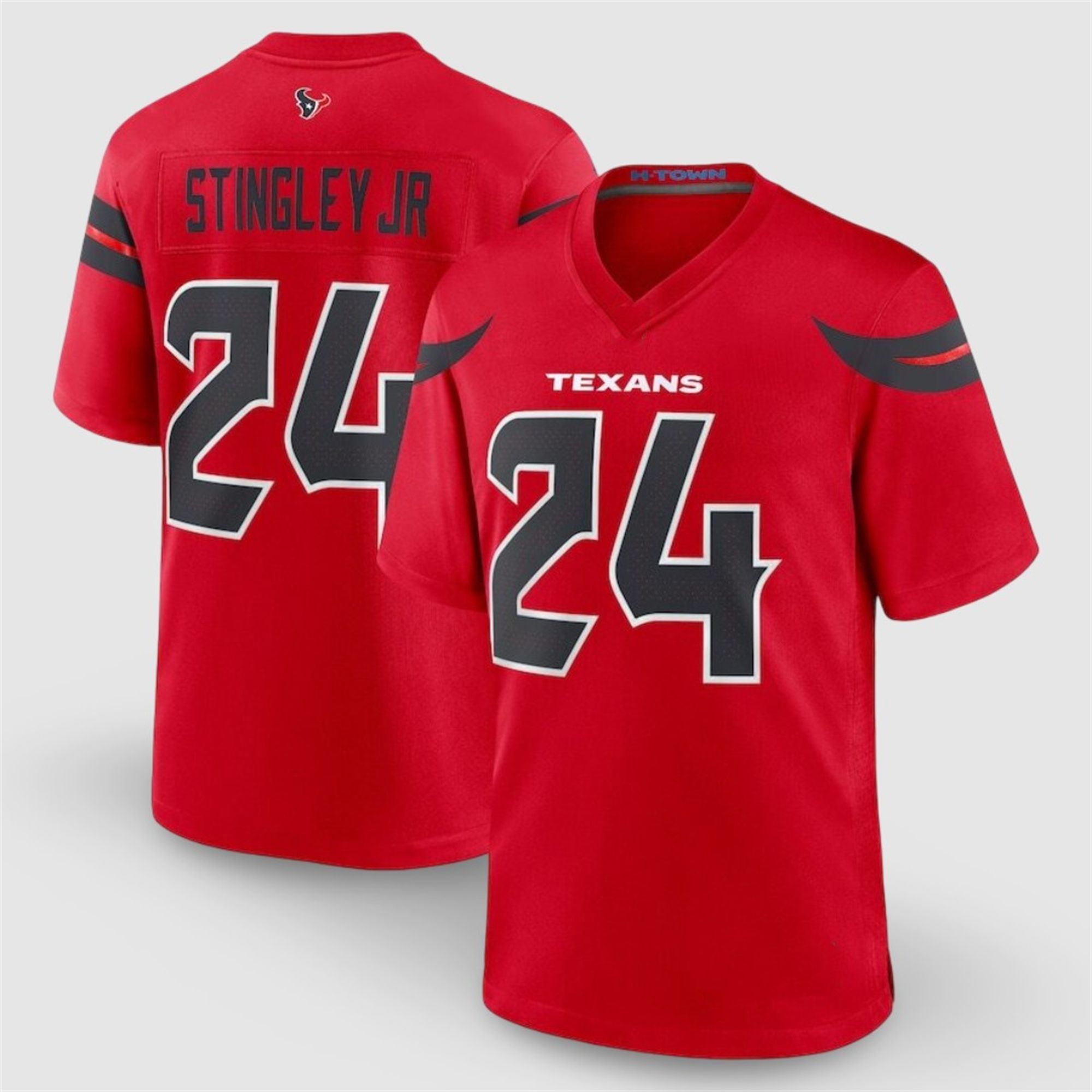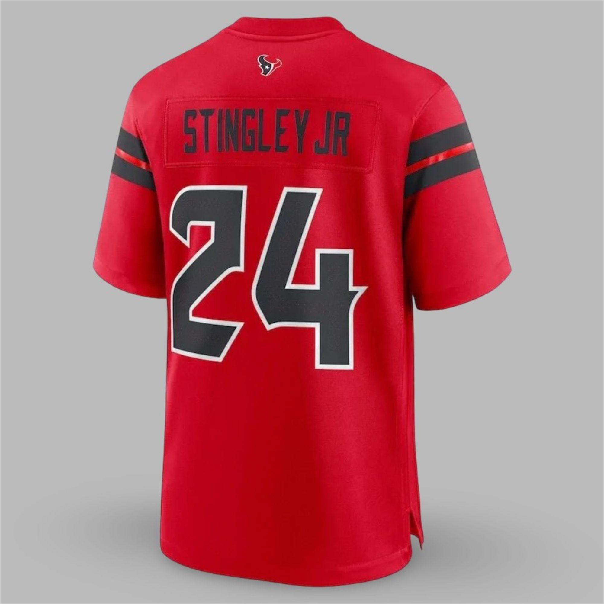 The base is a vibrant, high-impact “Battle Red” that demands attention. The design moves away from traditional striping, opting instead for the dynamic “Bullhorn” shoulder stripes that mimic the Texans’ logo, creating a fierce, forward-moving aesthetic. The front proudly displays “TEXANS” in the modern typographic font, while the back features “STINGLEY JR” and his signature number 24 in a sharp, contrasting Deep Steel Blue with Liberty White outlines.