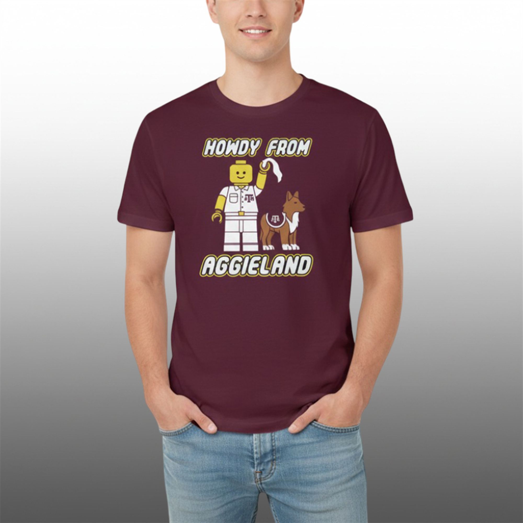 Looking for the perfect unique gift for the Texas A&M fan who has everything? The Howdy From Aggieland Minifigure Shirt is a fresh, fun take on collegiate merchandise that stands out from the sea of standard block-letter tees.