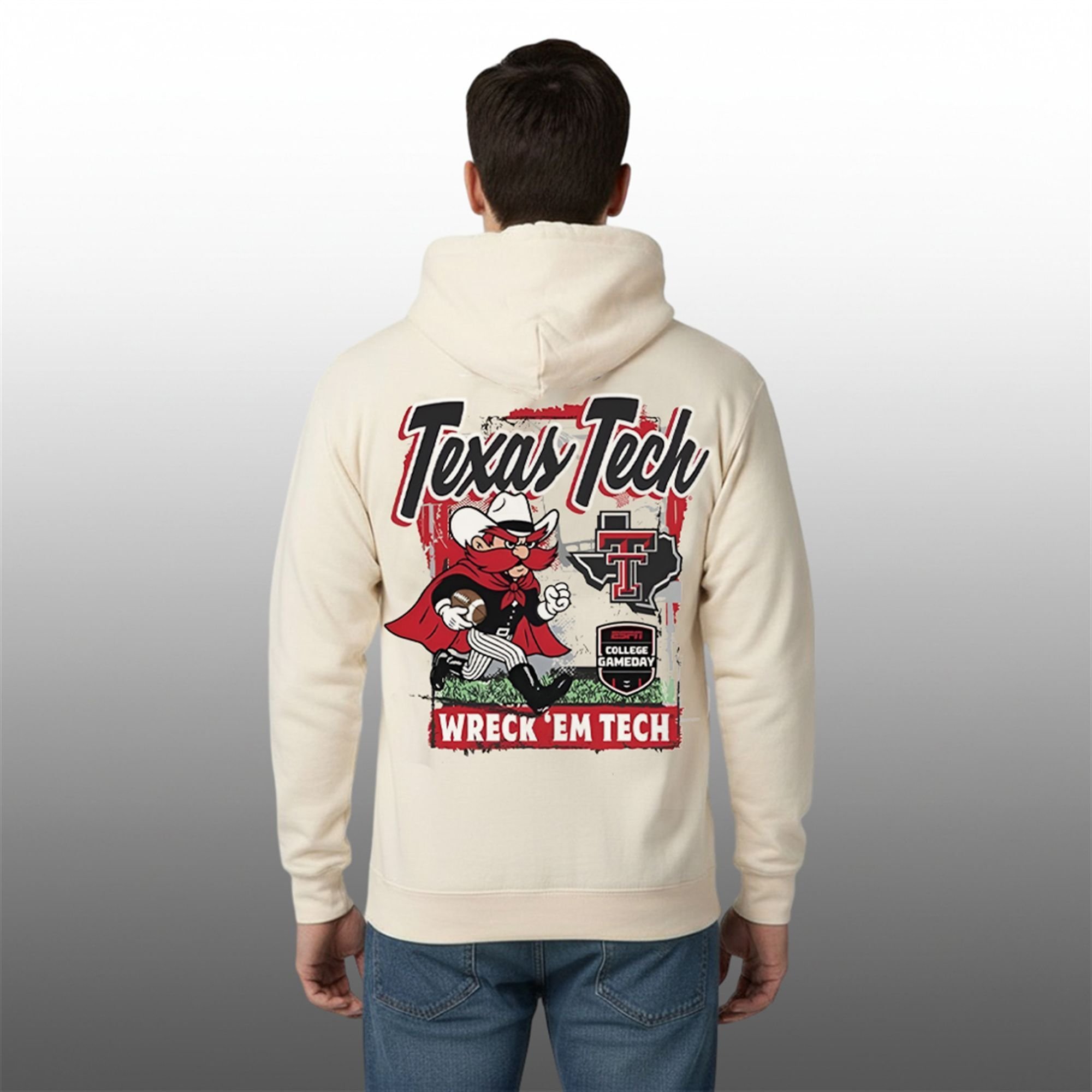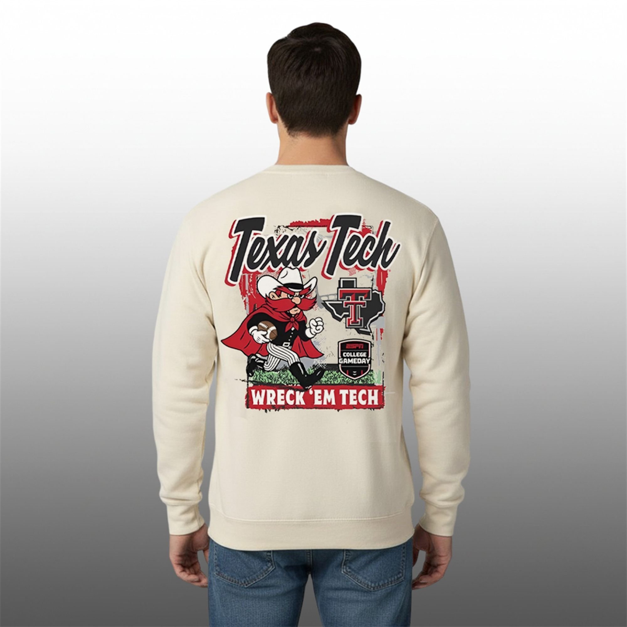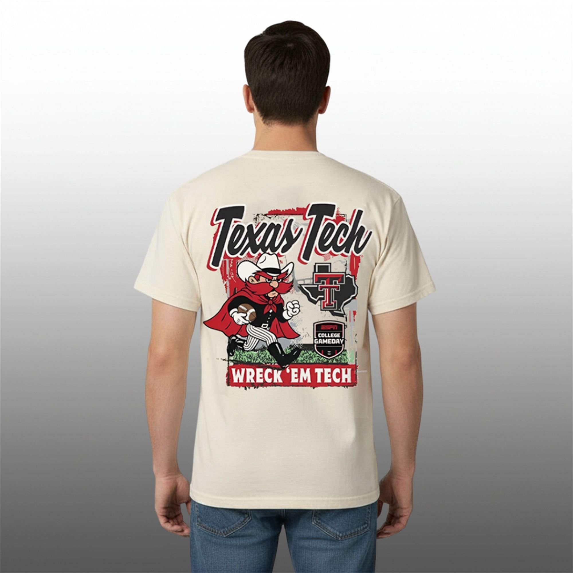 At the heart of the graphic is the legendary Raider Red, captured in full stride with a football in hand, showcasing the grit and determination of the team. Above him, the “Texas Tech” name is emblazoned in a stylized, retro script, while the powerful “WRECK ‘EM TECH” slogan anchors the design at the bottom. The graphic is flanked by the iconic Double T logo and a “College Gameday” shield, letting everyone know you’re ready for the big game. Printed on a classic, natural-colored tee, this red and black design pops with undeniable school spirit.