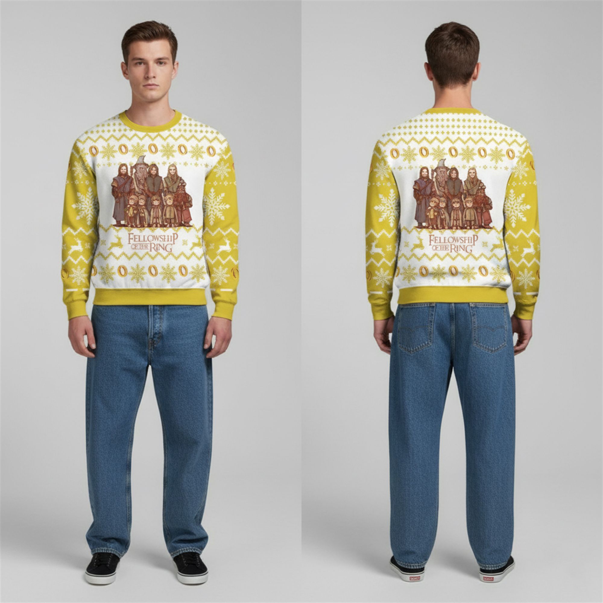 This isn’t just a piece of clothing; it is a wearable piece of art for the true Ringer. The Lord of the Rings Fellowship Ugly Sweater features a vibrant, full-coverage print that captures the spirit of the first installment of the legendary trilogy.