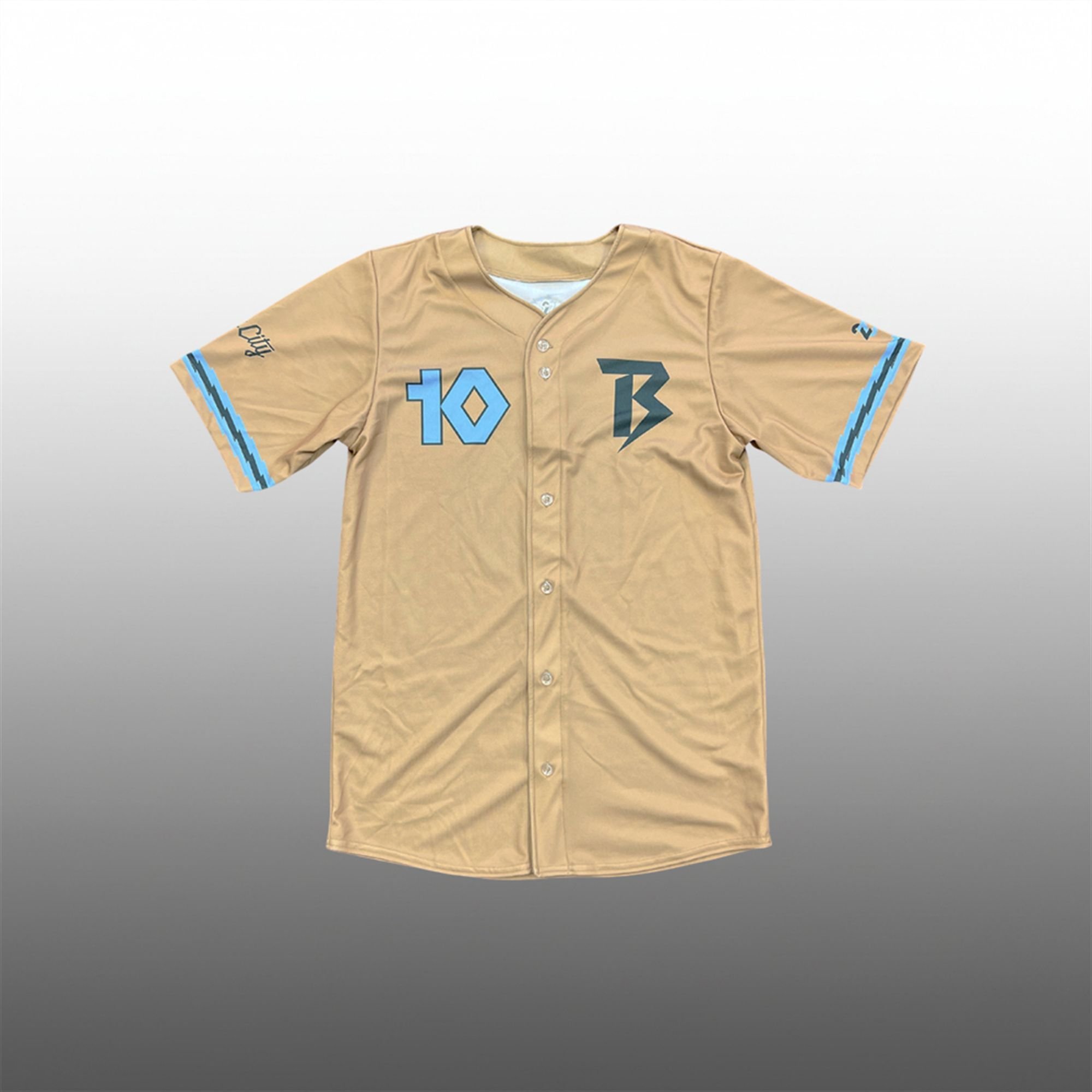 This jersey is all about the details. The front features the iconic, stylized “B” ThunderBolts logo on the left chest, perfectly balanced by Workman’s number “10” in a bold, light blue font on the right. The light blue trim on the sleeves and the “CITY” wordmark (partially visible in images) add a sharp, professional contrast that pops against the tan base.