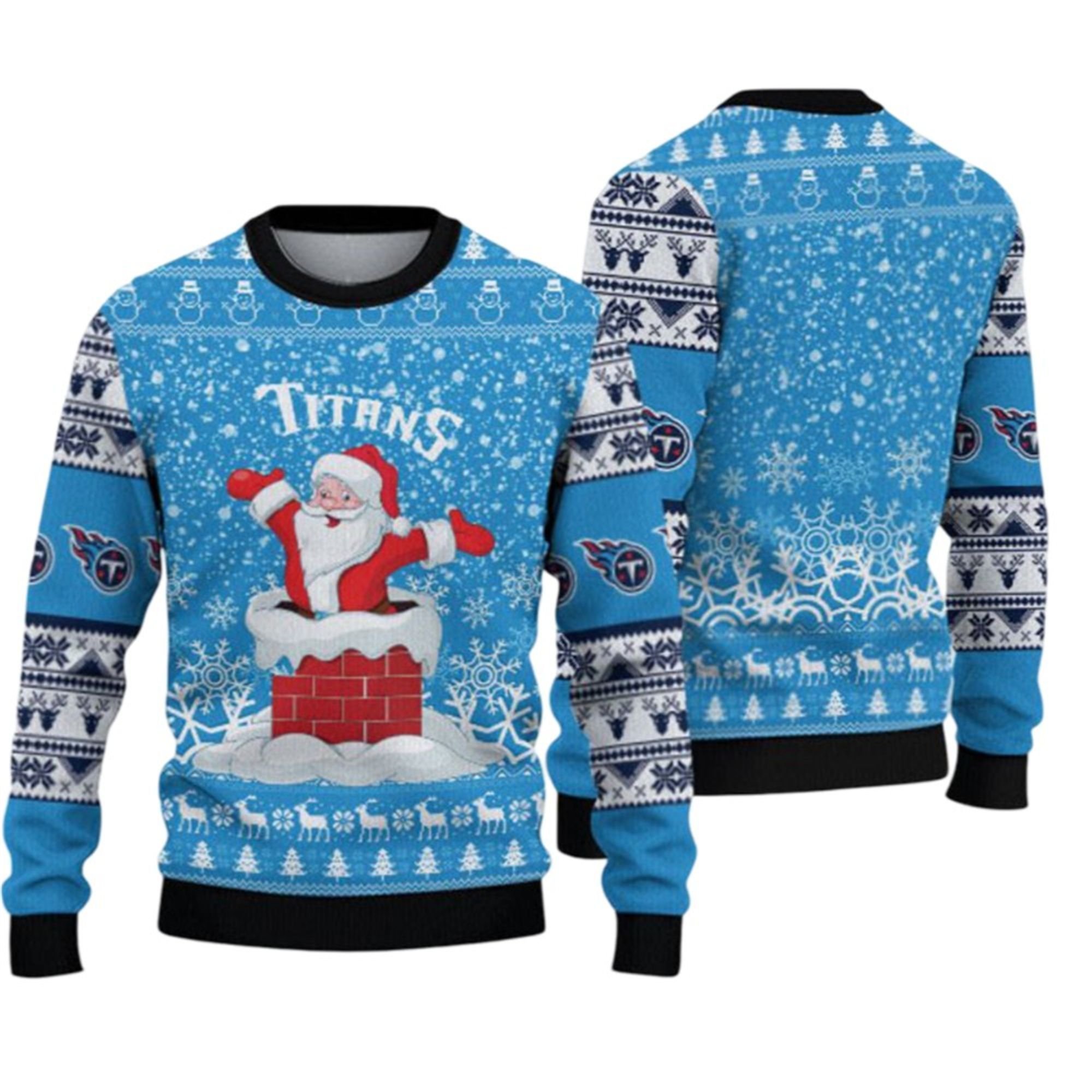 The sweater’s design is a festive touchdown. Front and center, a cheerful Santa Claus—decked out in his classic red suit—is caught mid-action, joyfully popping out of a chimney. Above him, the iconic “Titans” wordmark is proudly knit into the design, displayed against a snowy, festive backdrop. This makes it crystal clear where your allegiance lies, even when you’re caroling. The entire garment is wrapped in the unmistakable, vibrant ‘Titans Blue,’ ensuring you stand out in any crowd.