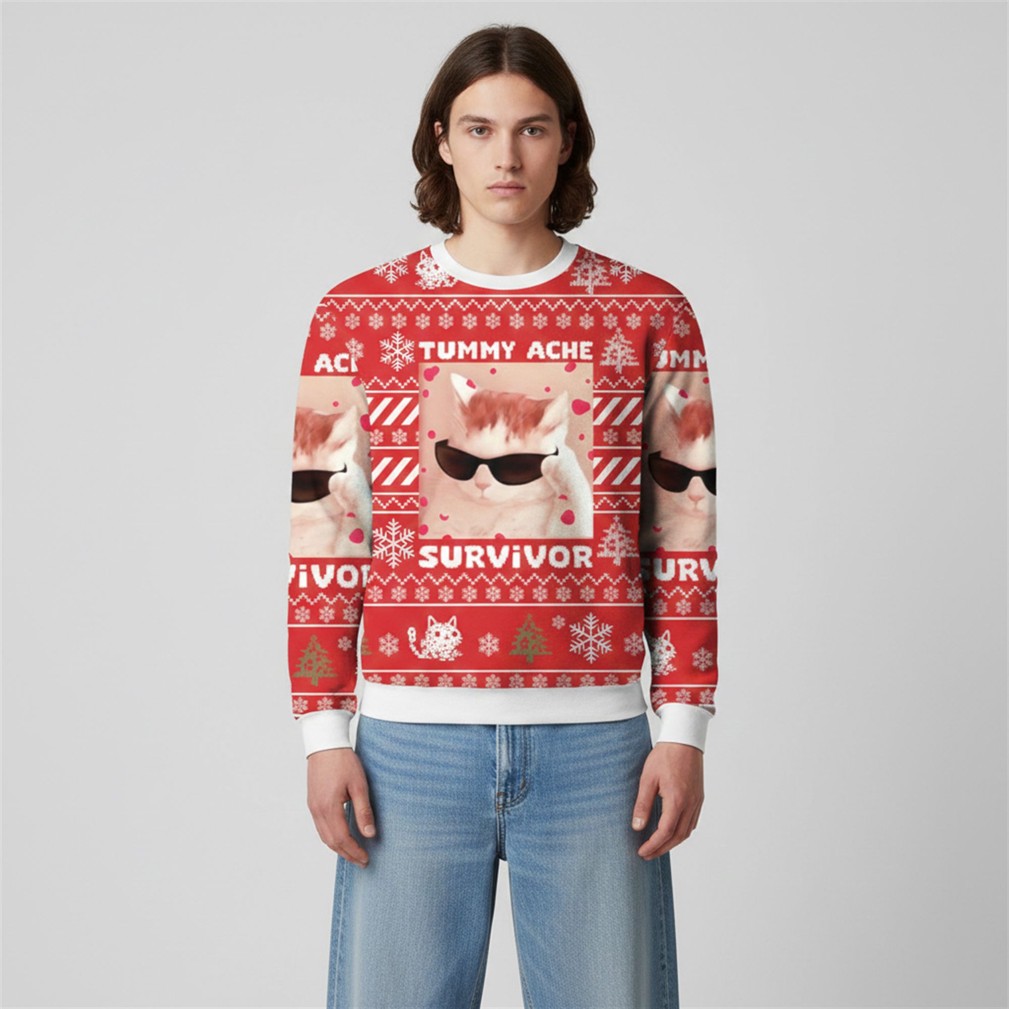 The design features a vibrant, all-over faux-knit print in classic holiday red. Adorned with pixelated snowflakes, Christmas trees, and geometric borders, it mimics the look of grandma’s hand-knitted gifts. However, the centerpiece is what sets it apart: a high-definition graphic of a stoic, white-and-ginger cat wearing dark sunglasses, framed by the bold declaration: “TUMMY ACHE SURVIVOR.”