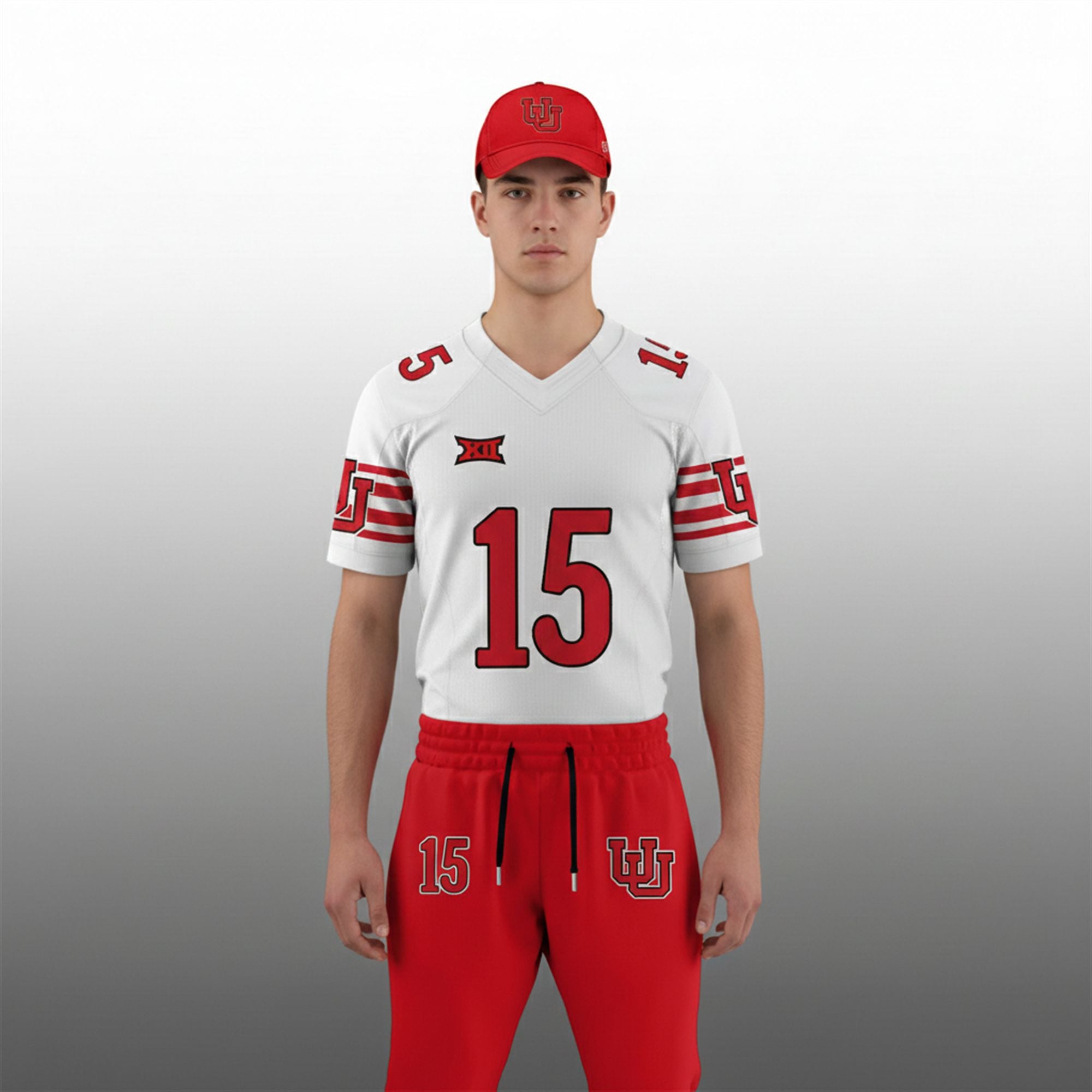 Designed for the devoted member of “The MUSS” and the casual collector alike, this jersey features a crisp, all-white body accented by bold, retro-inspired red stripes on the sleeves—a nod to Utah’s gritty gridiron past. The chest proudly displays the red #15, honoring the dynamic playmaker Byrd Ficklin, while the shoulder bears the Big 12 Conference patch, marking Utah’s new era of competition.