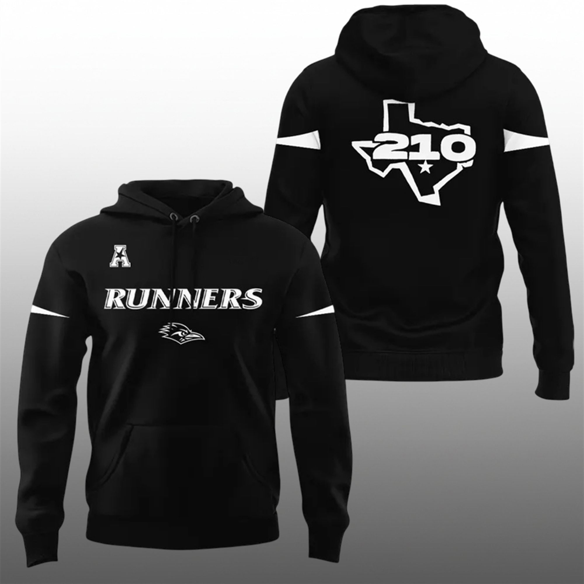 This hoodie features a sleek, all-black colorway that serves as the perfect canvas for the high-contrast white graphics. The front design is anchored by the bold “RUNNERS” wordmark in a classic collegiate serif font, sitting proudly above the iconic Roadrunner bird head logo—a symbol of speed and tenacity. On the wearer’s right chest (left side when viewing), the prominent “A” logo with the star signifies UTSA’s status as a powerhouse in the American Athletic Conference (AAC).