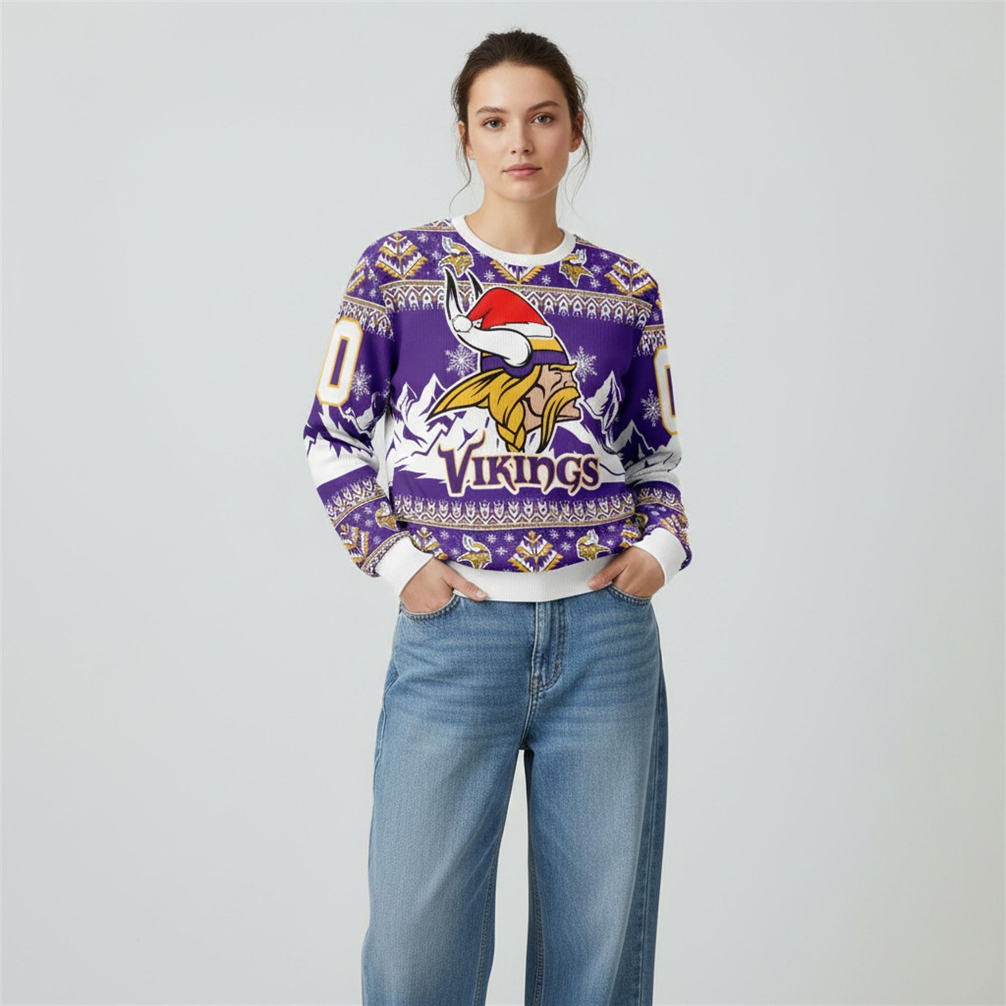 Celebrate the 2025 holiday season with a thunderous “SKOL!” by wearing the sweater. Designed for the fan who lives and breathes Minnesota football, this garment is a masterclass in festive fan apparel. The design features a bold, high-definition graphic of the Vikings’ Norseman logo donning a festive Santa hat, instantly signaling that you are ready for both battle and holiday cheer.