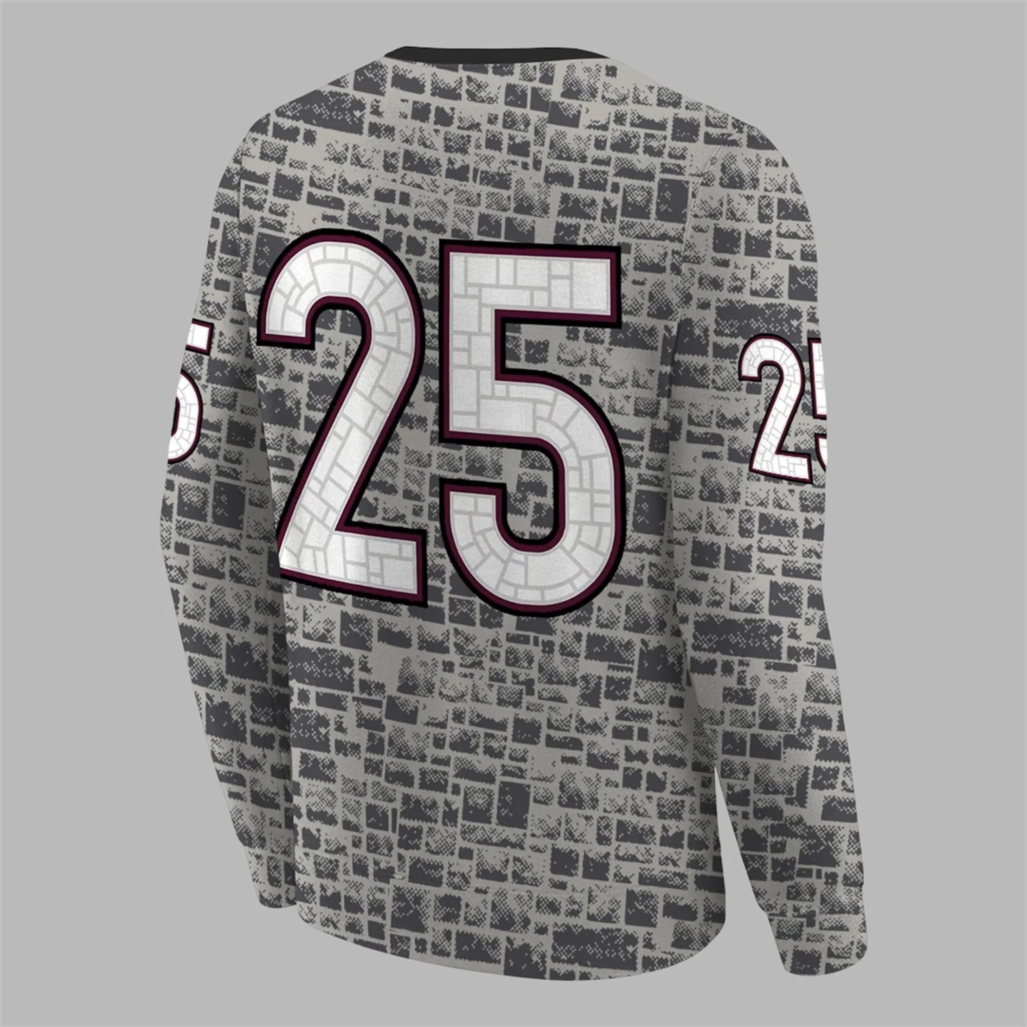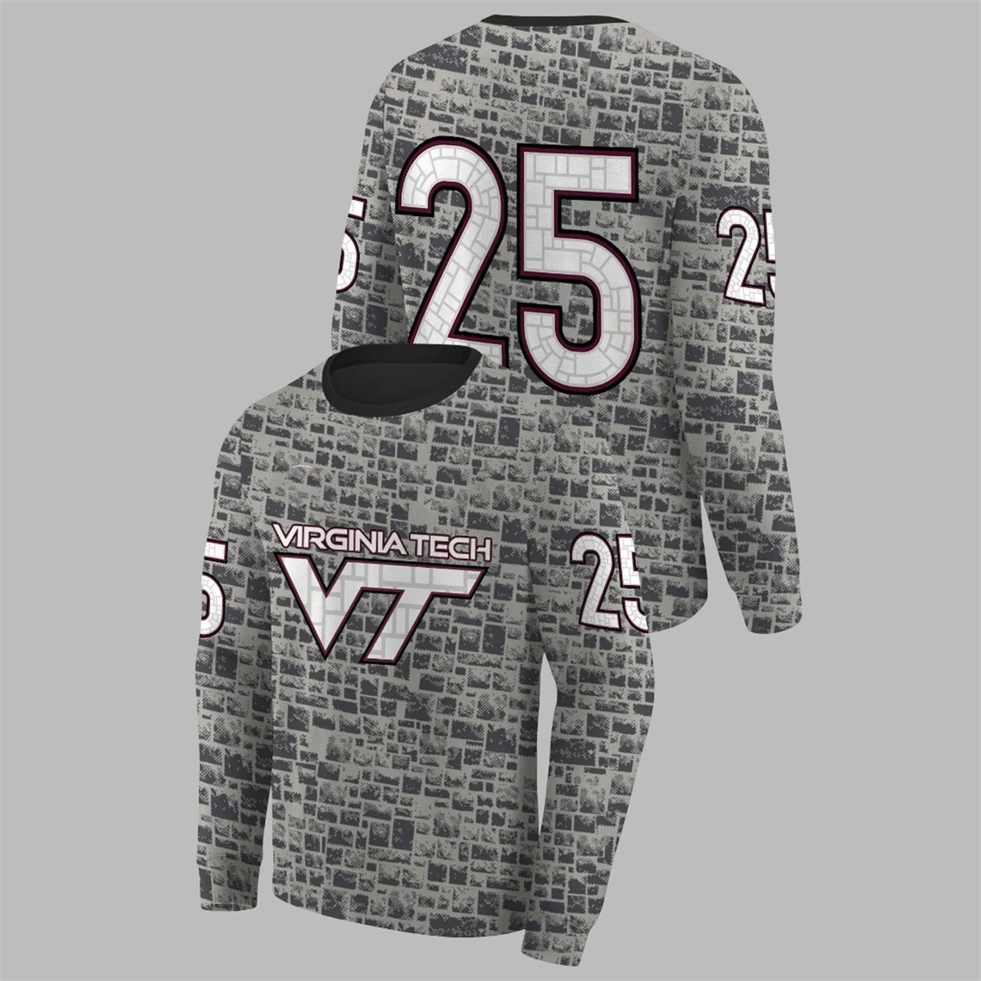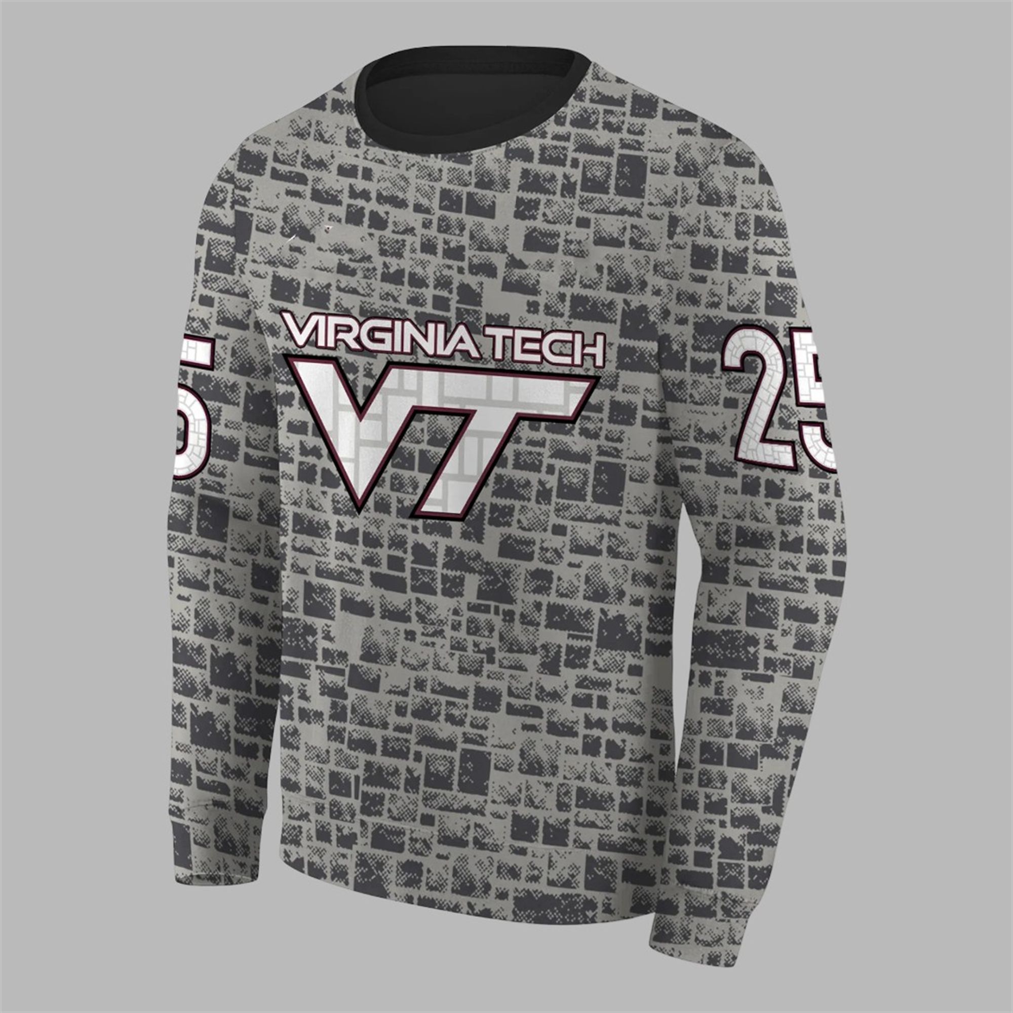 Designed for the 2025 athletic calendar, this apparel piece features a 360-degree all-over graphic print that mimics the grey, dolomite limestone texture found on almost every building on the VT campus. The front proudly displays the “Virginia Tech” wordmark and the “VT” logo with a stone-inlay effect, while the back features a massive, jersey-style number “25.” This design choice not only celebrates the current year but represents a quarter-century of gridiron evolution.