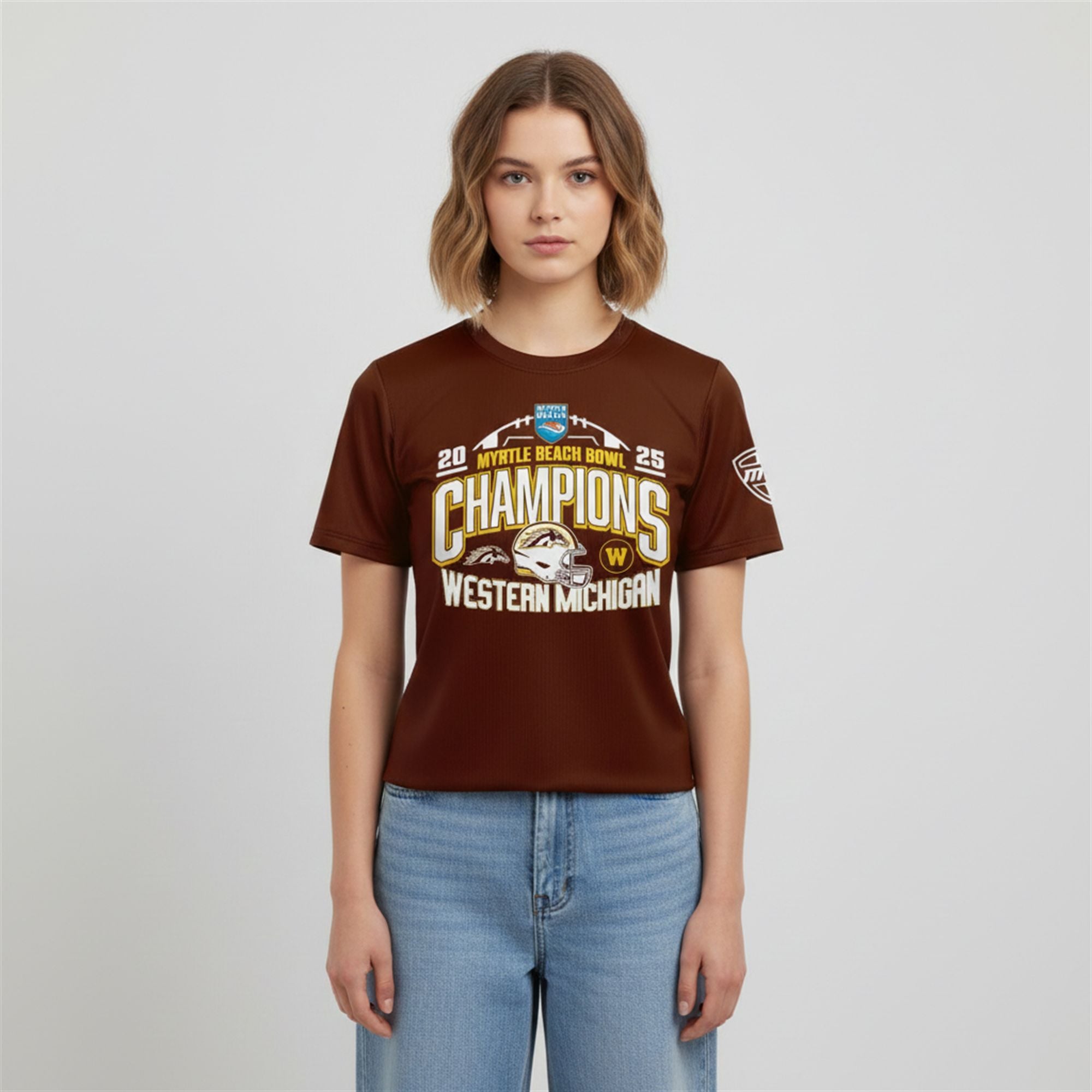 The shirt is more than just apparel; it is a wearable trophy for the dedicated fan base. Designed to capture the energy of Western Michigan’s dominant postseason run, this shirt features bold, high-definition graphics that proudly display the “Champions” title alongside the Myrtle Beach Bowl logo.