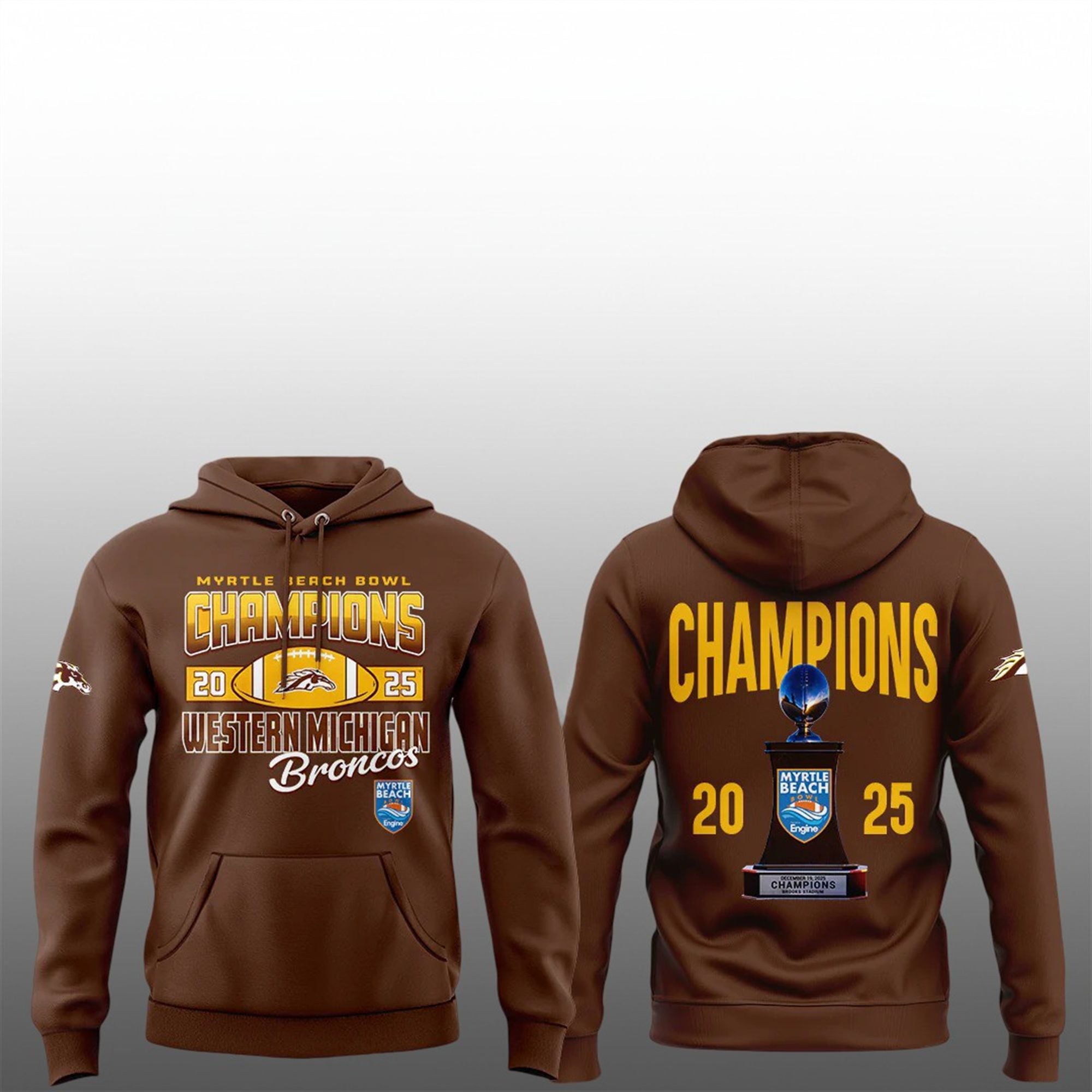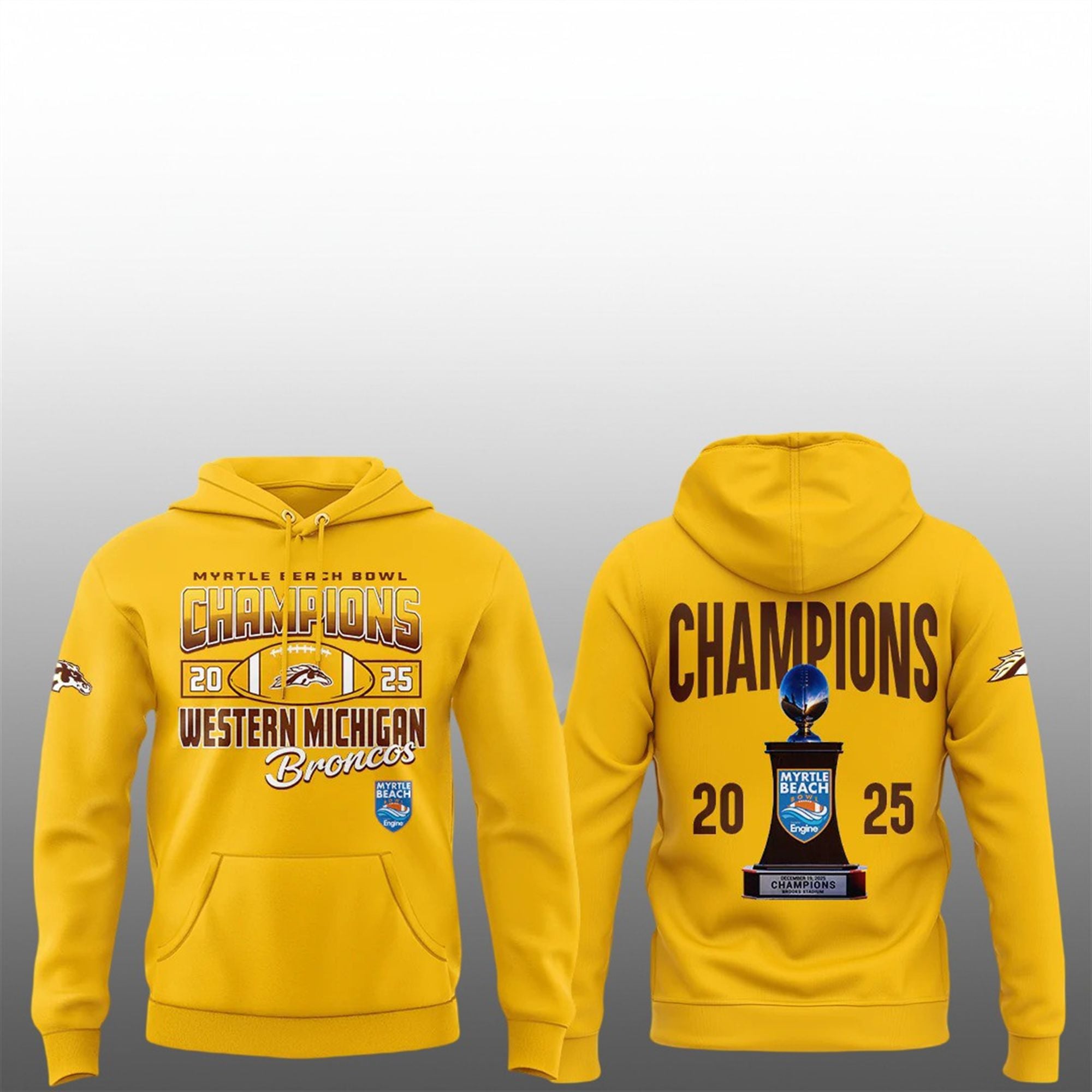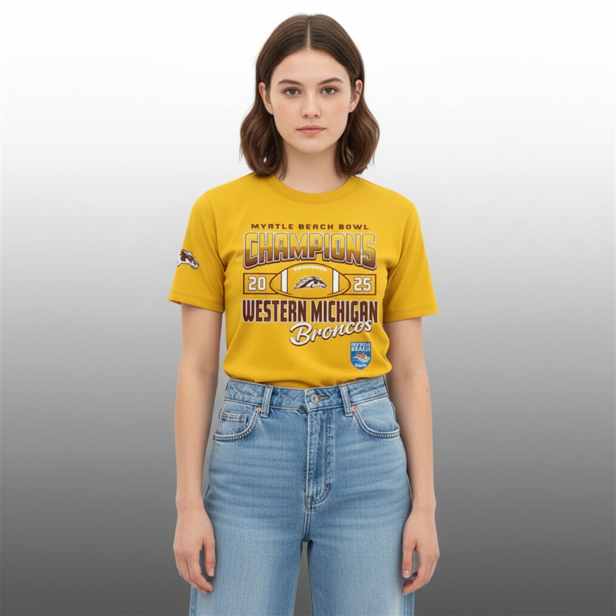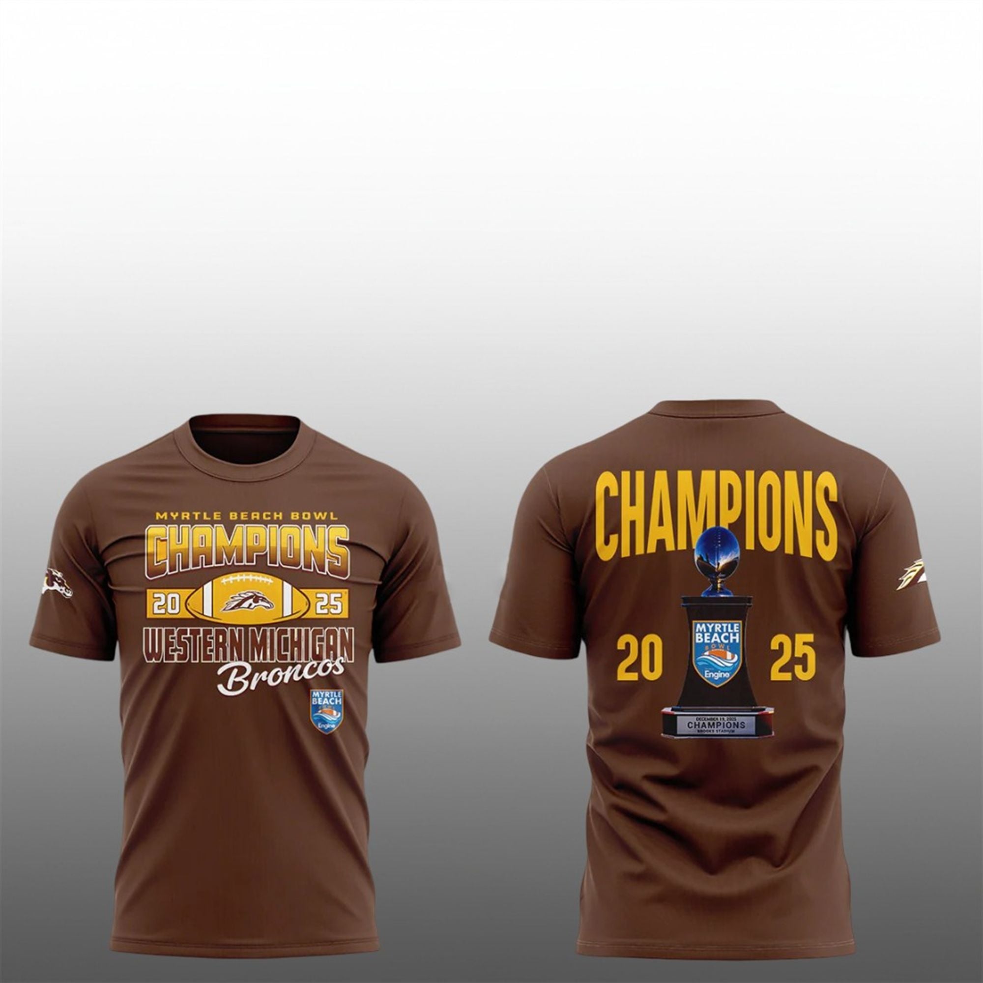 The Front: Features a bold, dynamic graphic centered around a stylized football and the Western Michigan Bronco logo. The text proudly declares “Myrtle Beach Bowl Champions 2025,” flanked by the “Western Michigan Broncos” script in the team’s classic typography.