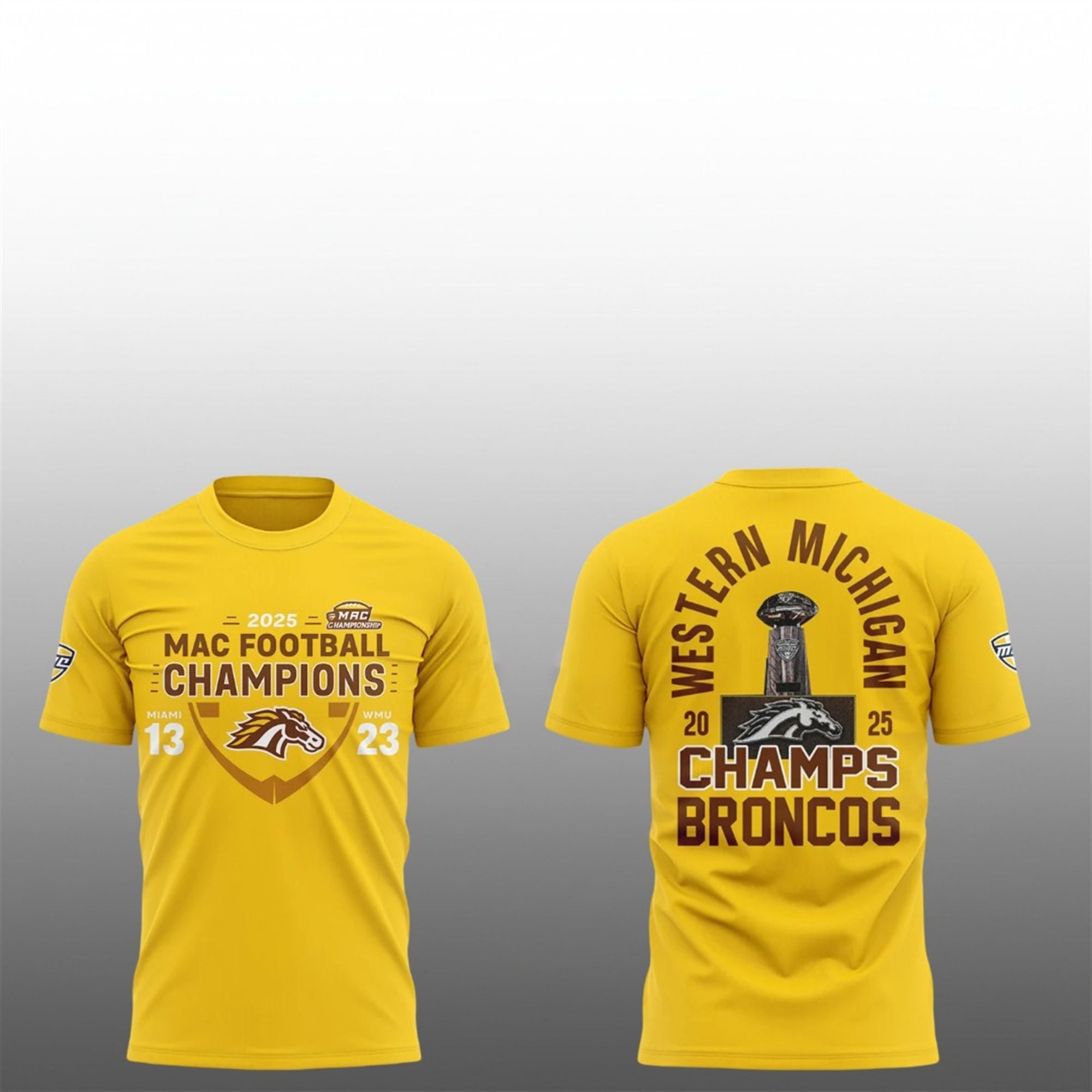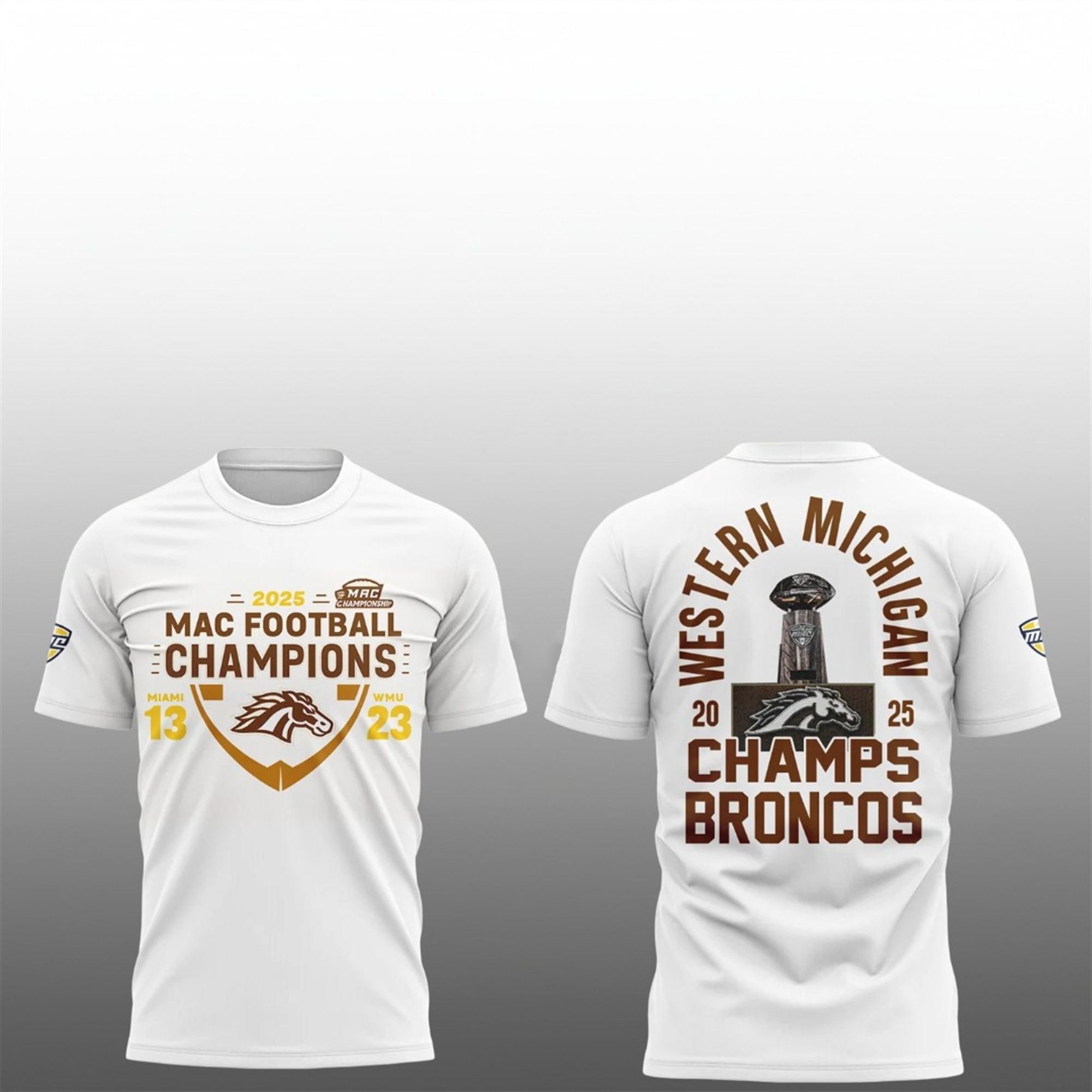 The shirt is a piece of fan gear designed to immortalize the Broncos‘ return to glory. The front design proudly displays the final scoreboard: Miami 13 – WMU 23, freezing in time the moment the clock hit zero and the celebration began. The back features a striking “Western Michigan 2025 Champs” graphic centered around the coveted MAC Championship trophy, ensuring your fandom is visible from every angle.