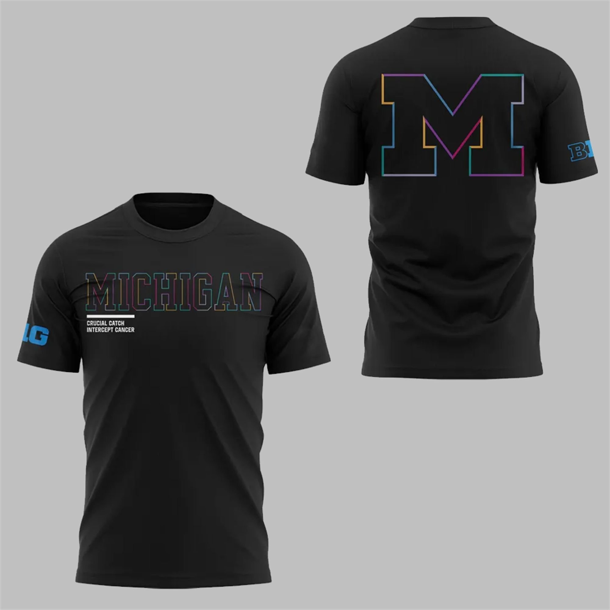 Show the world where your loyalty lies with the 2025 Wolverines Crucial Catch Shirt. This piece of apparel is more than just a way to support your team; it’s a declaration of solidarity and a contribution to one of the most important battles we face. Designed in collaboration with the Big Ten Conference and the Crucial Catch initiative, this shirt blends iconic Wolverines pride with the powerful message of cancer awareness. The sleek black base provides the perfect canvas for the vibrant, multi-color gradient that outlines the bold “MICHIGAN” text on the front and the classic block “M” on the back. Situated just below the chest wordmark, the “CRUCIAL CATCH INTERCEPT CANCER” slogan serves as a constant reminder of the shirt’s vital mission.