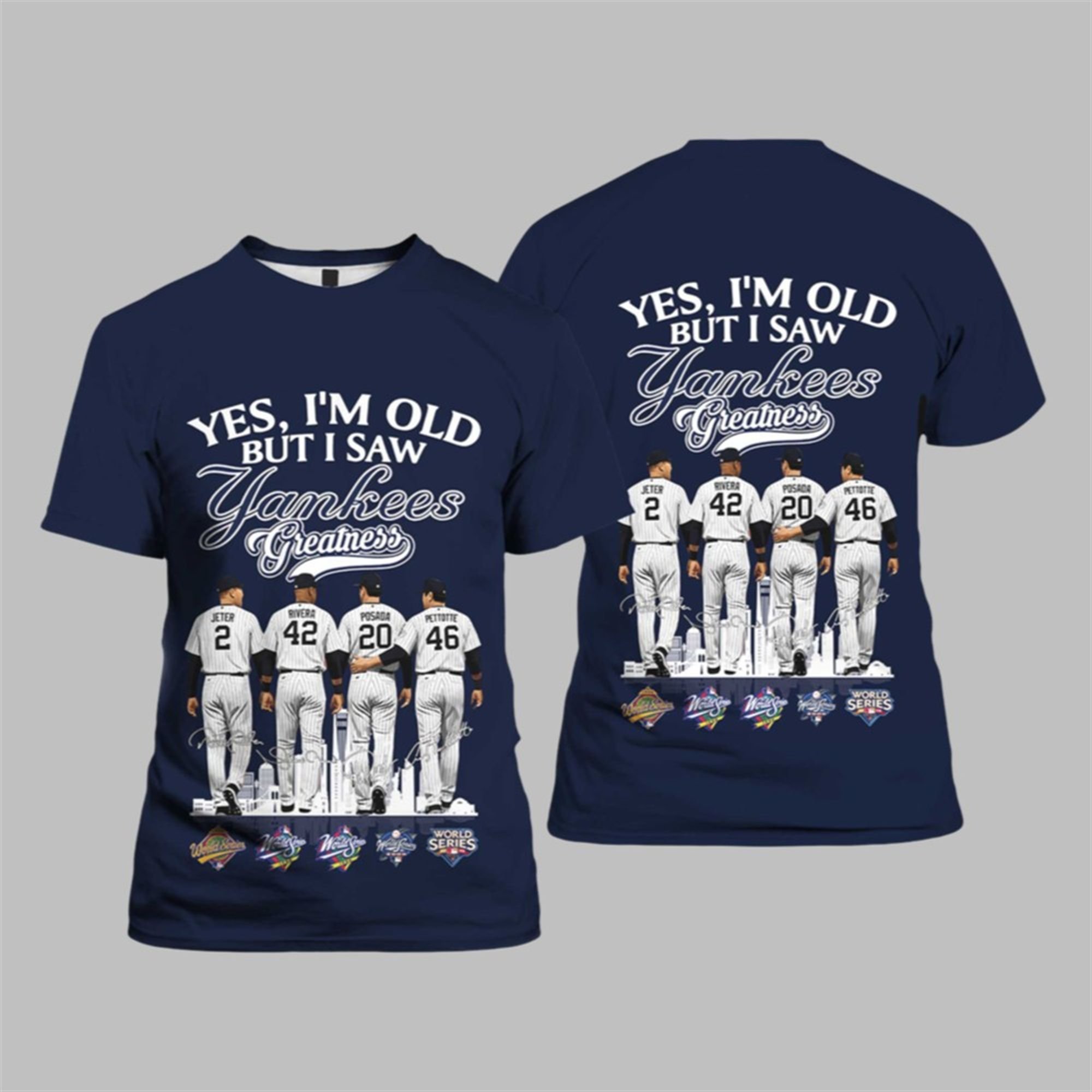 This isn’t just a t-shirt; it’s a testament. The shirt is meticulously designed to honor one of the most dominant forces in sports history. The front and back feature a powerful graphic of the legendary Core Four—Derek Jeter (2), Mariano Rivera (42), Jorge Posada (20), and Andy Pettitte (46)—walking off into the pinstriped sunset, forever immortalized. The bold, declarative text, “YES, I’M OLD BUT I SAW Yankees Greatness,” resonates with every fan who feels a surge of pride recalling that golden era.