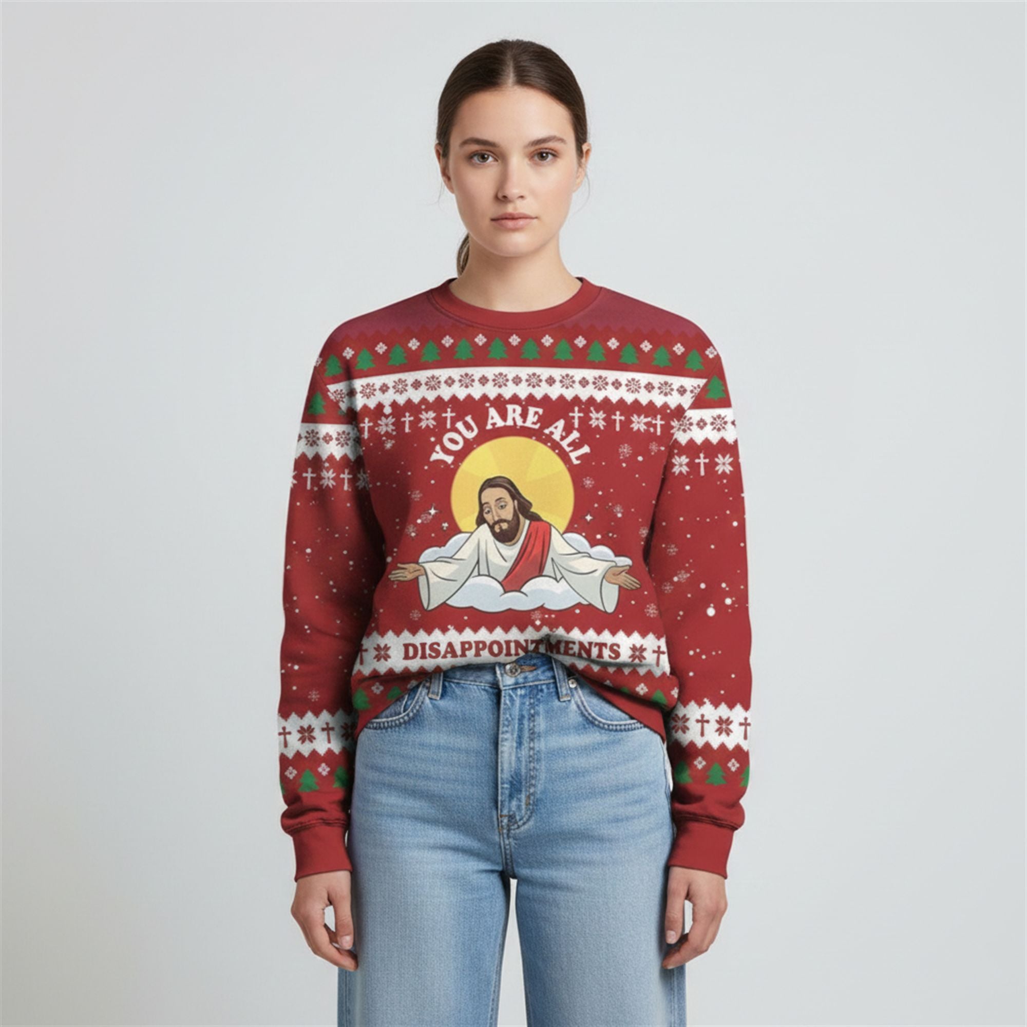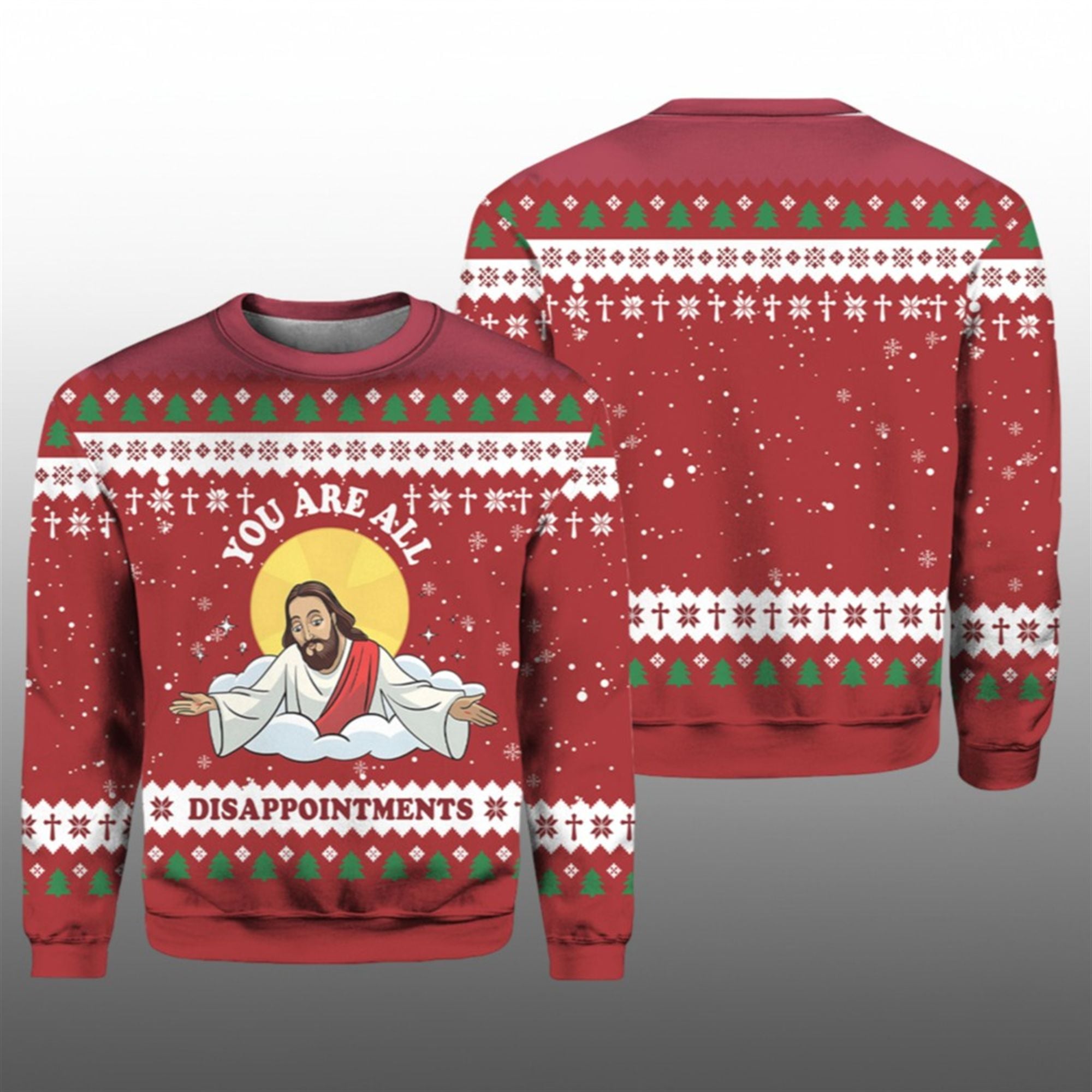 The design features a vibrant, deep red backdrop simulating a classic Nordic knit pattern. It includes festive rows of evergreen trees and snowflakes, interspersed with subtle cross motifs to keep the theme on point. The centerpiece, however, is the high-definition graphic of a robe-clad figure in the clouds, shrugging with divine resignation. The bold text, “YOU ARE ALL DISAPPOINTMENTS,” is emblazoned above and below the graphic, delivering a punchline that lands perfectly in the age of internet irony.