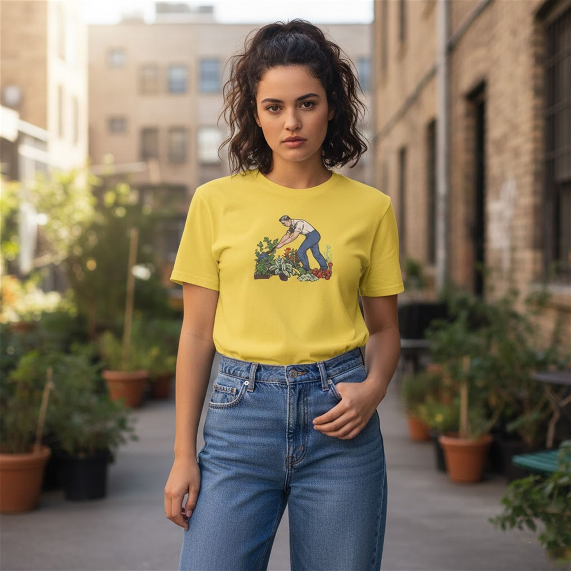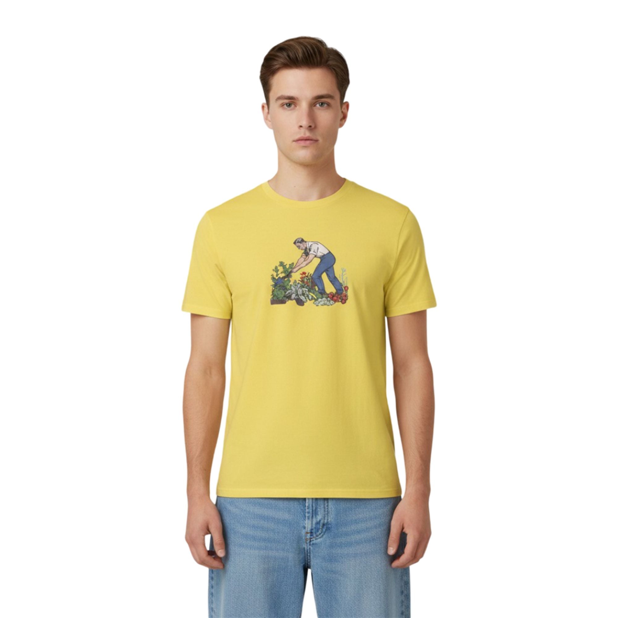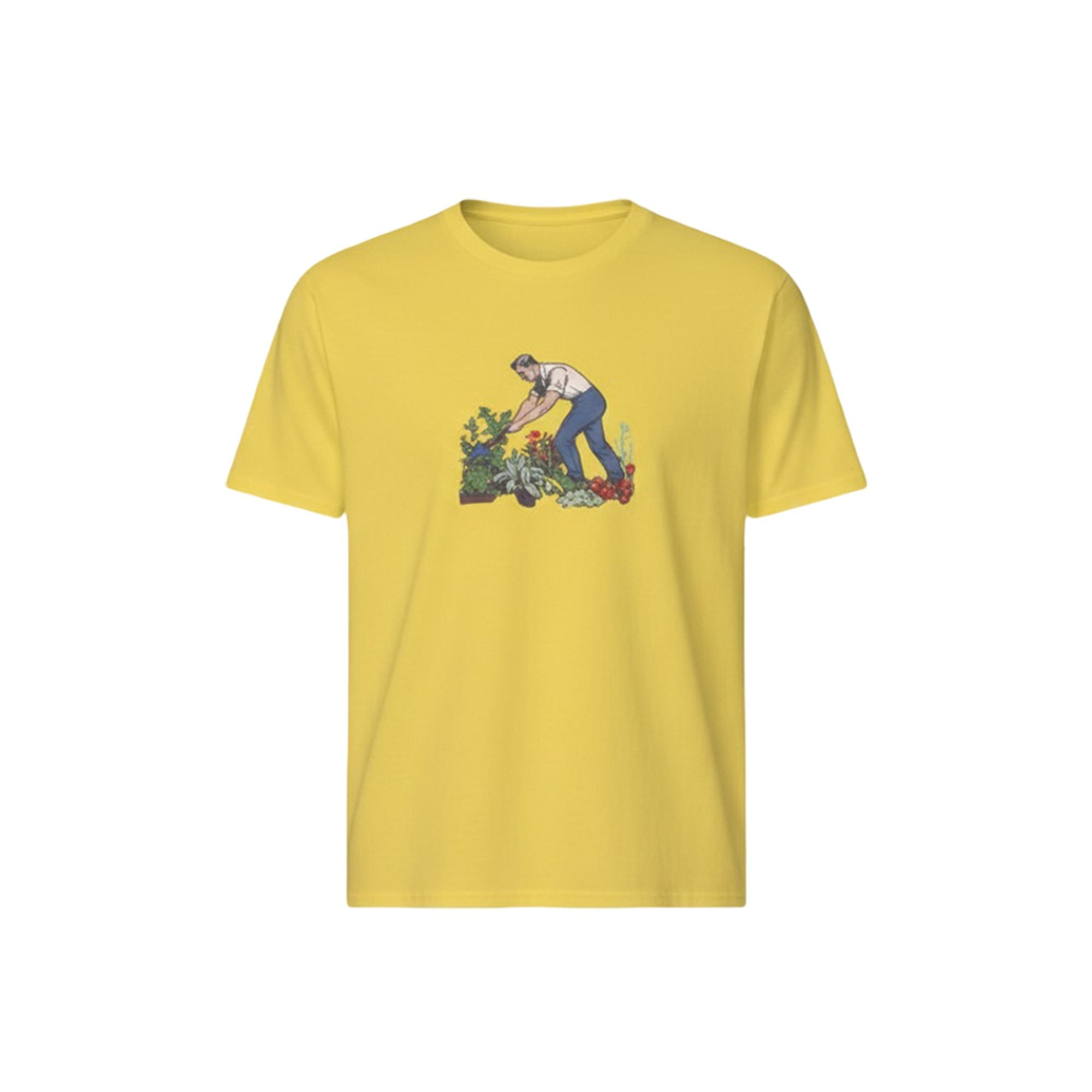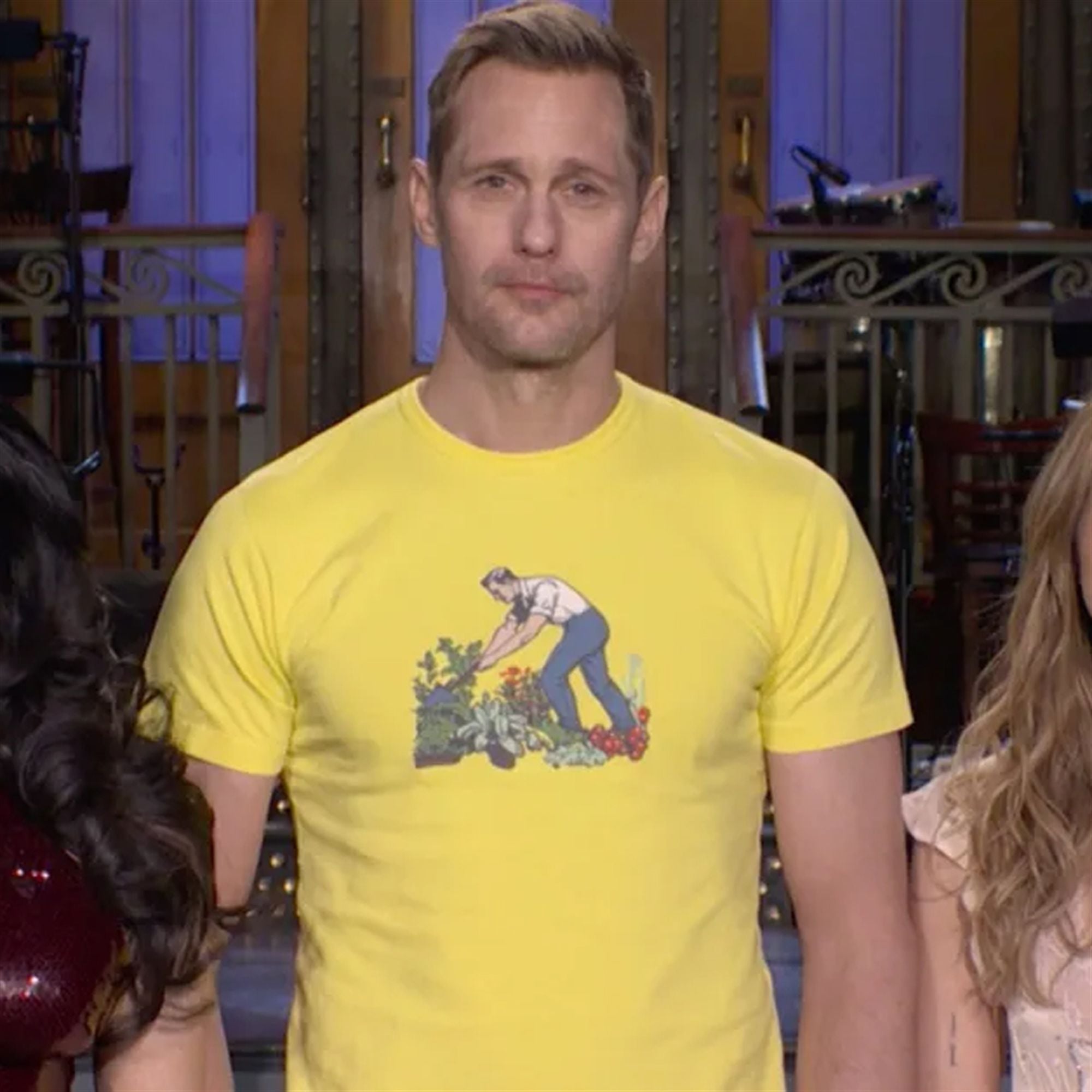 Forget designer logos and complex patterns; the breakout look of the year is a sunny yellow tee, 2026 Alexander Skarsgard SNL Shirt with a man tending to his plants. As seen on Alexander Skarsgård during his iconic SNL hosting gig, this shirt proves that “normcore” has evolved into a powerful fashion statement.
