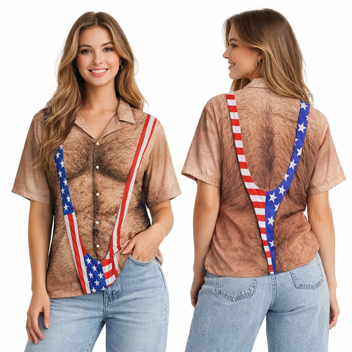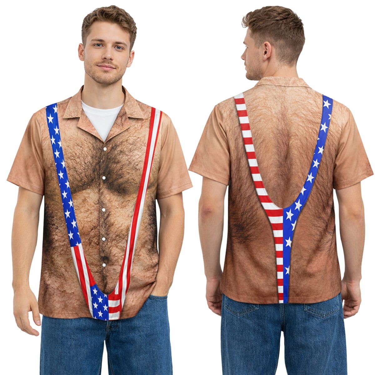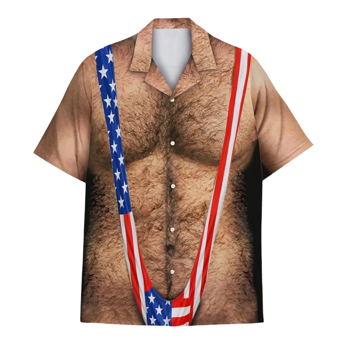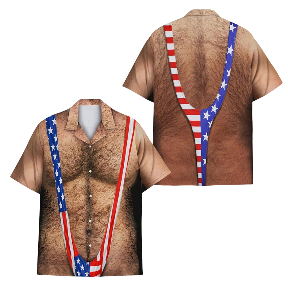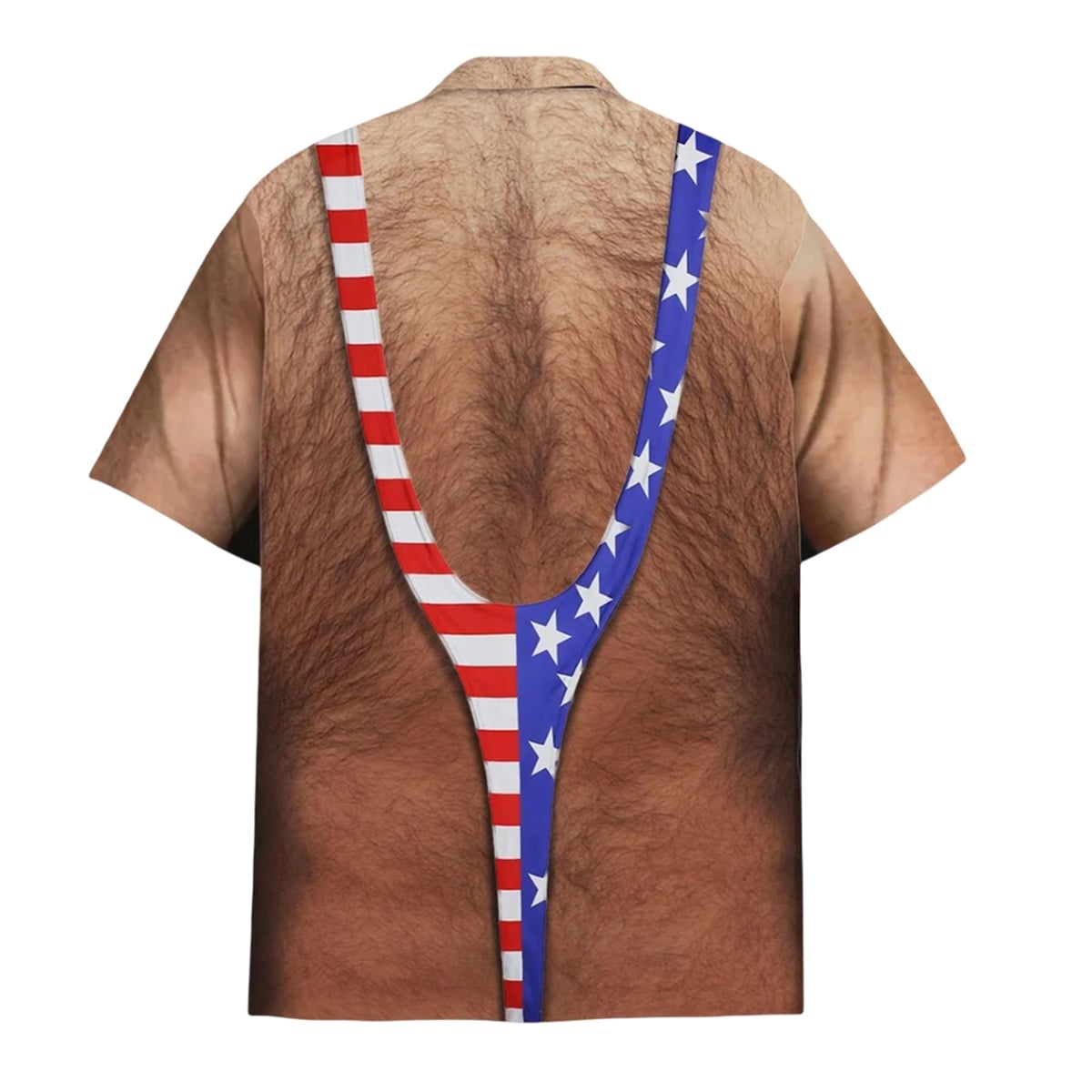This shirt features a highly detailed, photorealistic print that completely transforms the wearer’s torso. The design perfectly mimics a bare, exceptionally hairy male chest and back. Layered over this faux-hairy canvas is the printed image of a tight, V-shaped American flag “mankini” suspender thong. The visual effect is instantaneous and shocking, providing the hilarious illusion of a wildly inappropriate summer outfit while keeping the wearer fully covered. It brings the outrageous energy of classic comedy films straight to your summer holiday events.