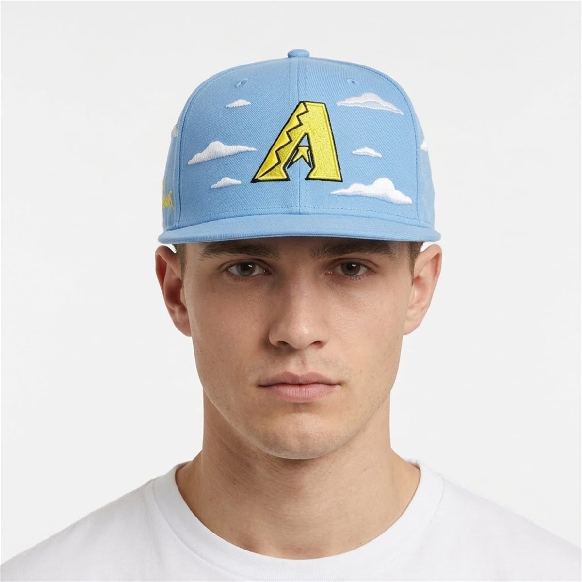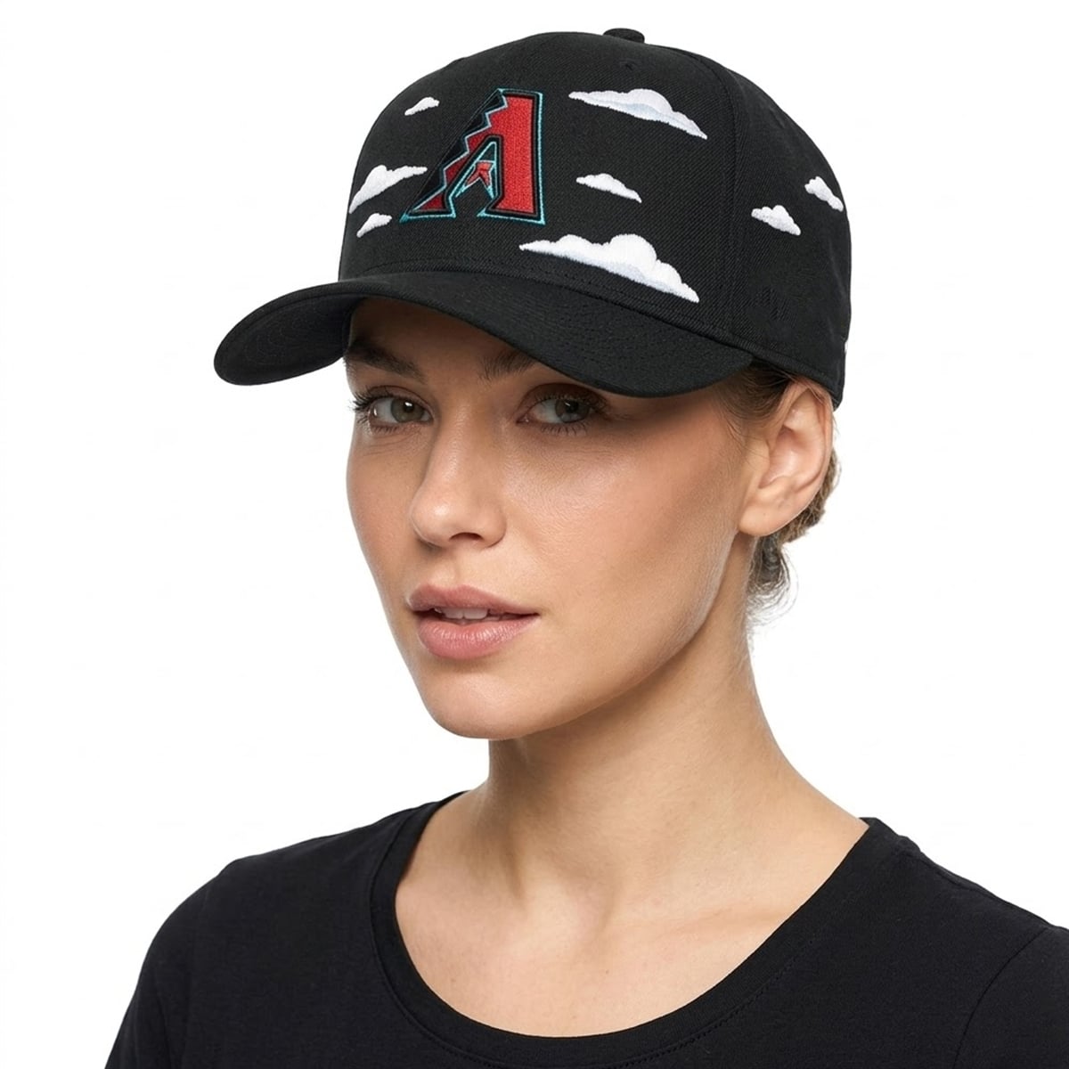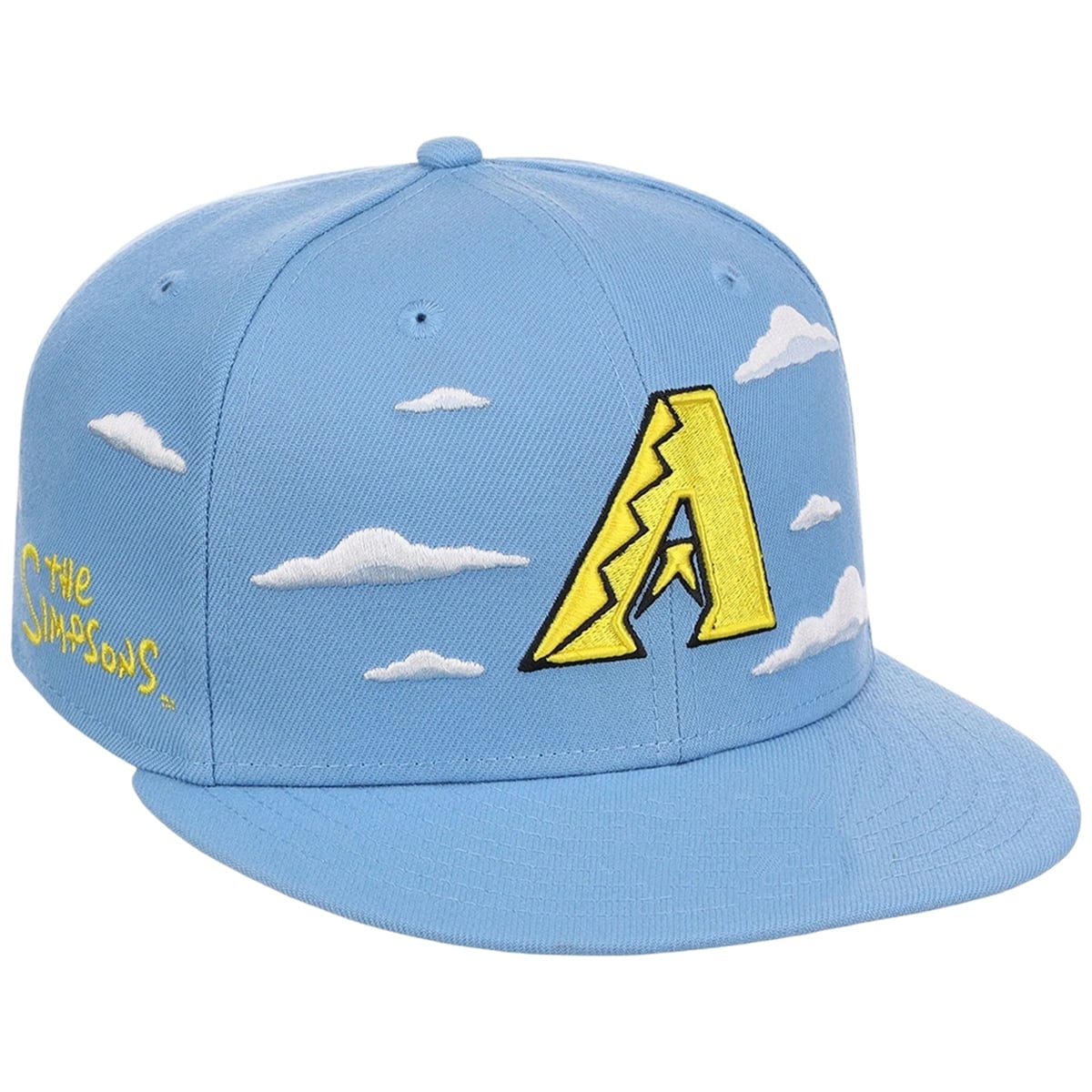 The hat features a profound visual narrative that immediately captures attention. Set against a deep, midnight-black background, the classic Arizona D-backs ‘A‘ logo—rendered in its signature Sedona Red and Teal—takes center stage. However, it is the surrounding environment that elevates this item from standard team gear to a collector’s masterpiece. Fluffy, stylized white clouds, exact replicas of those seen in the legendary opening credits of The Simpsons, float organically around the team insignia. On the side profile, the vibrant, unmistakable yellow trademark logo of The Simpsons provides a brilliant pop of contrasting color. The entire silhouette is designed to be a walking piece of pop art, creating a stunning visual depth that draws the eye and sparks immediate recognition.