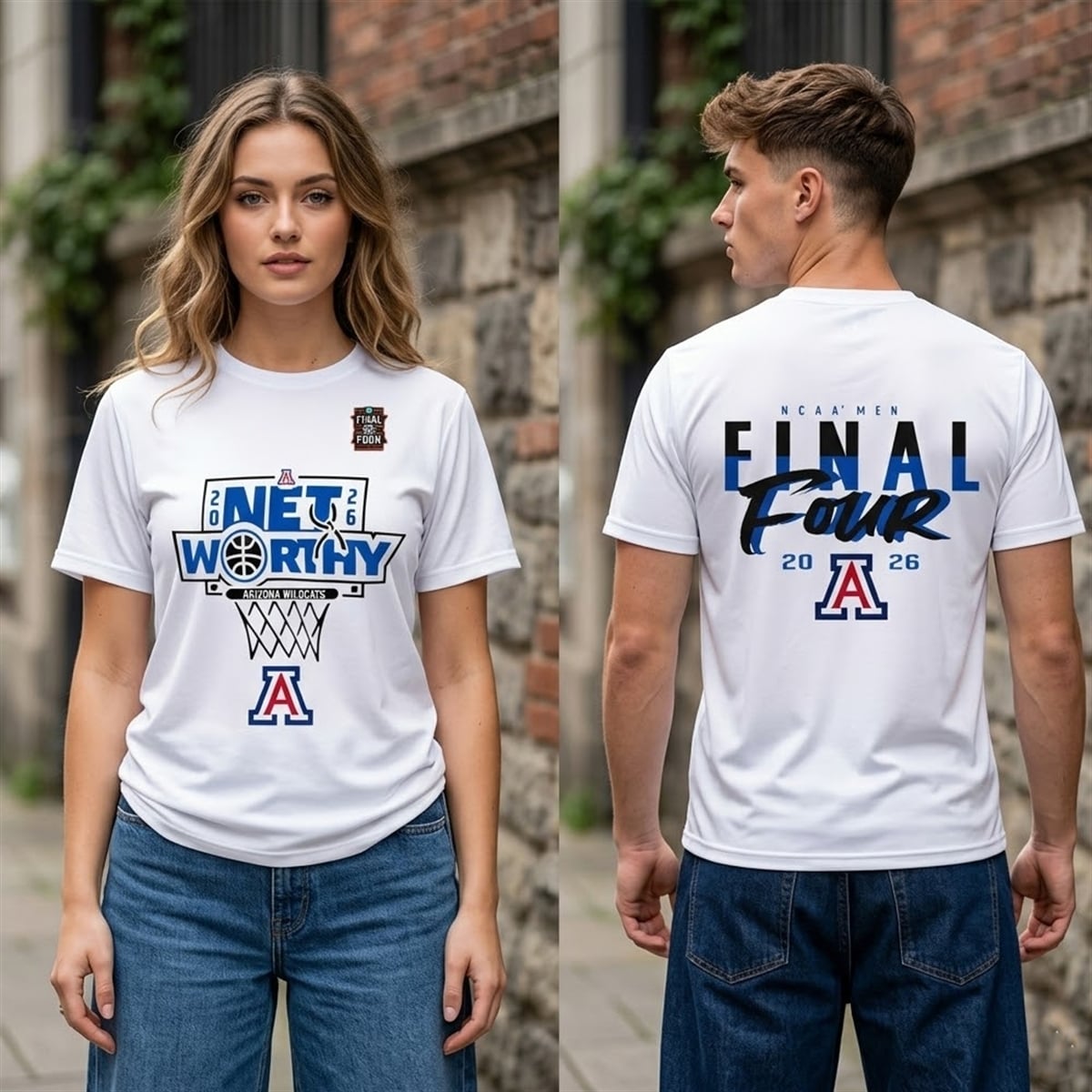 The phrase “Net Worthy” is a clever, dual-meaning rallying cry that captures the essence of the tournament. In college basketball, the ultimate symbol of advancing past regional finals is the ceremonial cutting down of the nets. By branding the team as “Net Worthy,” the design proudly declares that the 2026 Arizona Wildcats have earned their right to climb the ladder and claim the nylon. It is a bold statement of value, victory, and the relentless pursuit of a national championship.