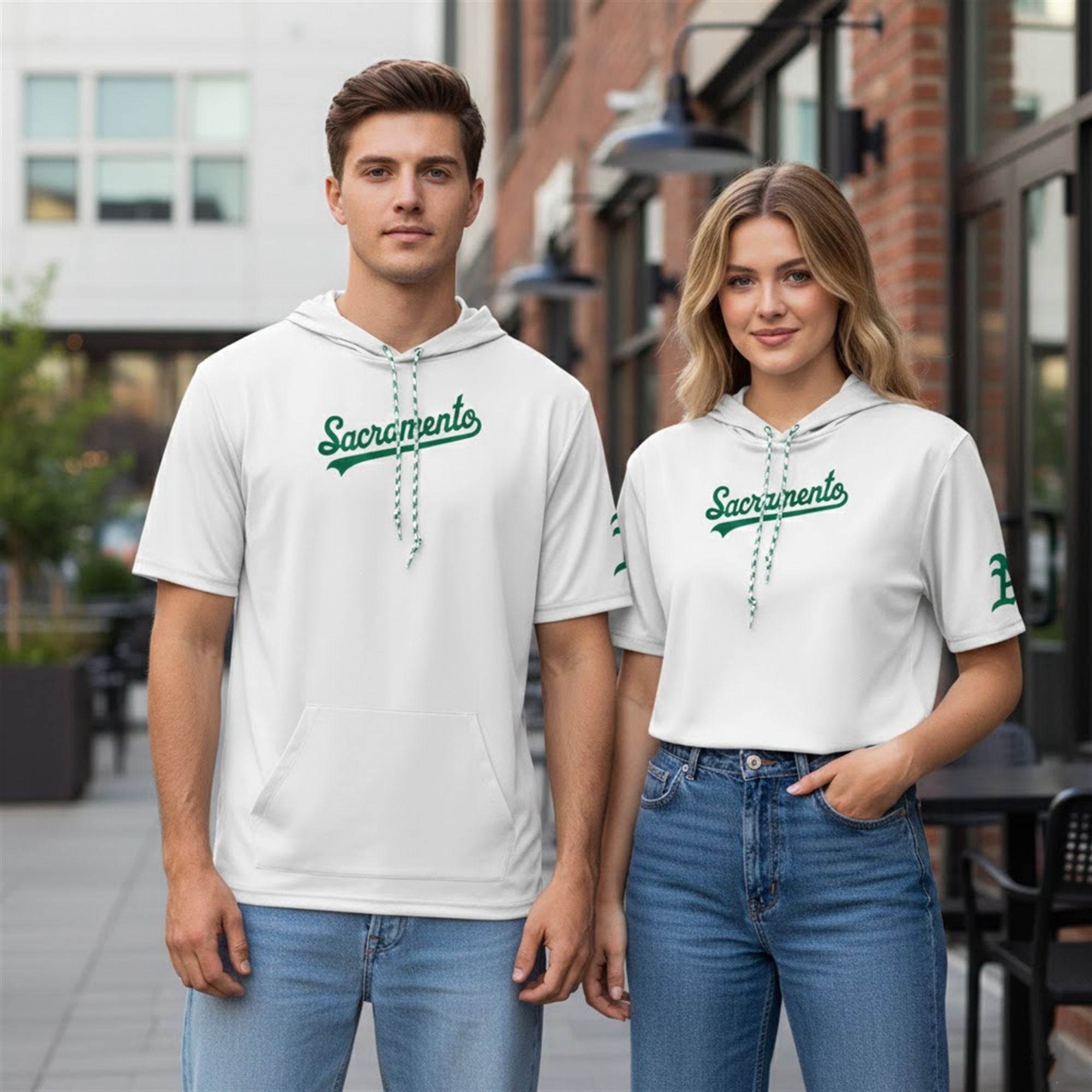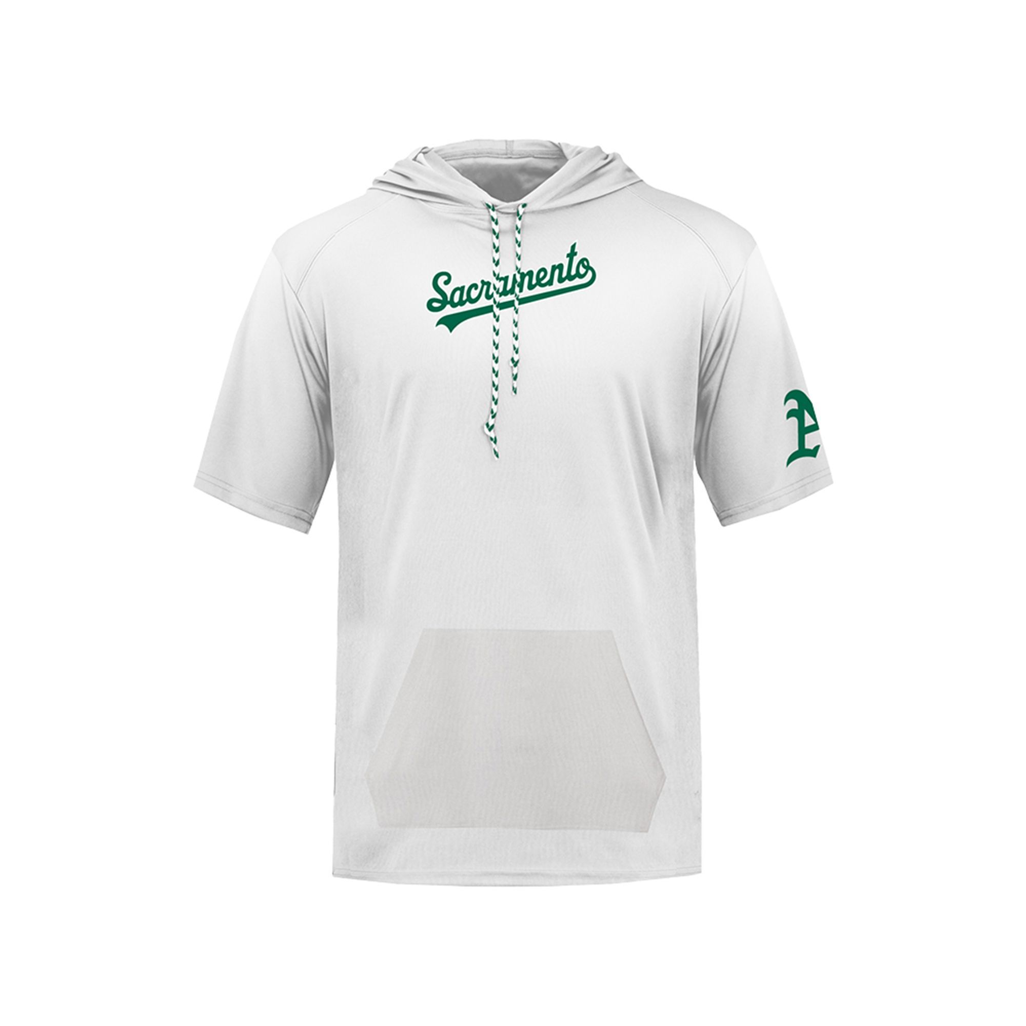 The silhouette itself—a short sleeve hoodie featuring a front kangaroo pocket and distinctive green-and-white patterned drawstrings—offers a modern twist on traditional sports apparel. It caters to the evolving tastes of modern sports fans who favor streetwear-inspired designs over standard graphic tees. By merging the visual identity of the Athletics with their temporary home city, this item serves as a wearable timestamp of the 2026 Major League season.