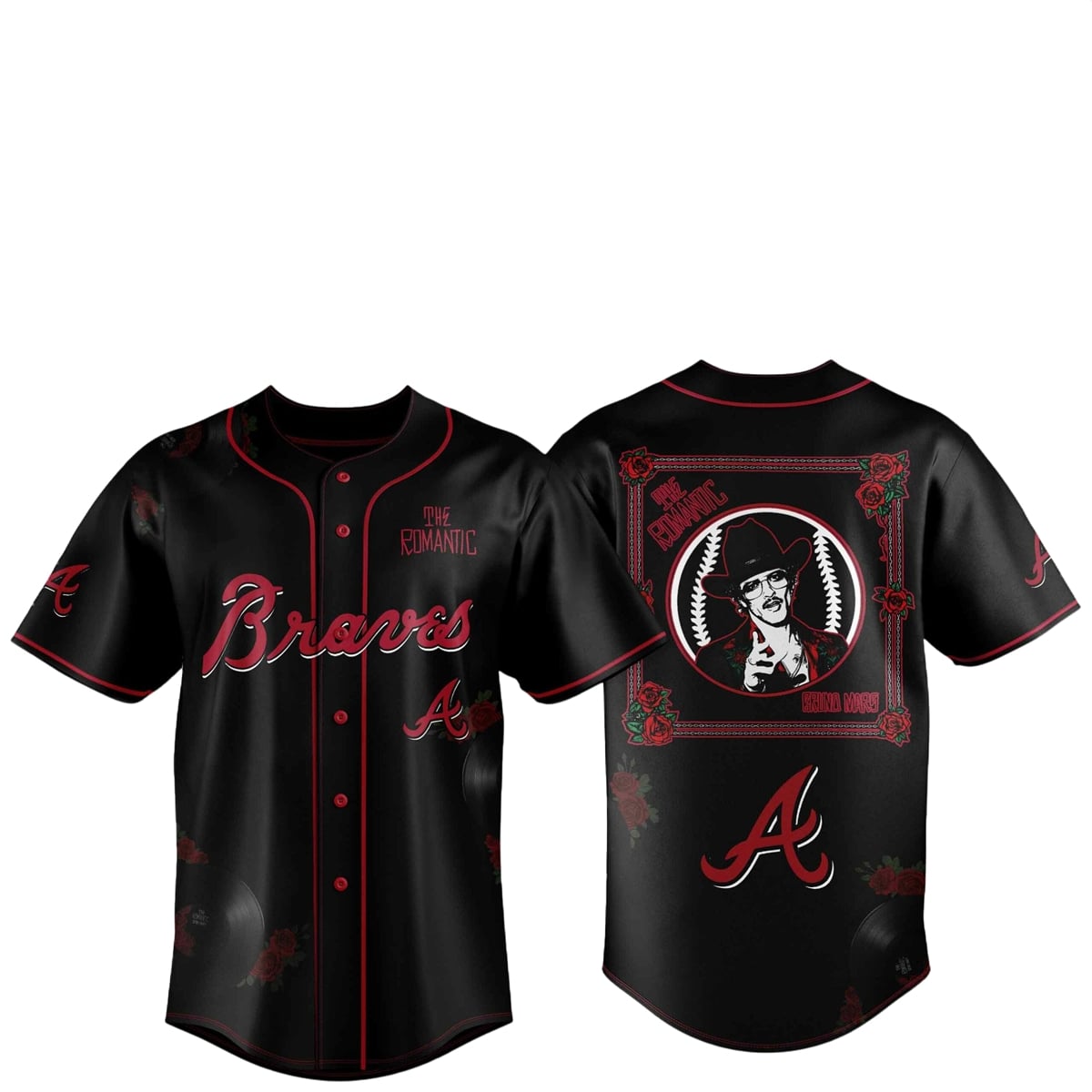 The jersey is a visual masterpiece that blends traditional team branding with custom, artist-specific artwork. The front of the jersey honors baseball tradition, featuring the classic, sweeping red “Braves” script across the chest, complemented by the iconic “A” logo on the lower left and the sleeve. Sitting proudly on the right chest is the stylized “The Romantic” text, immediately tying the piece to the 2026 tour.