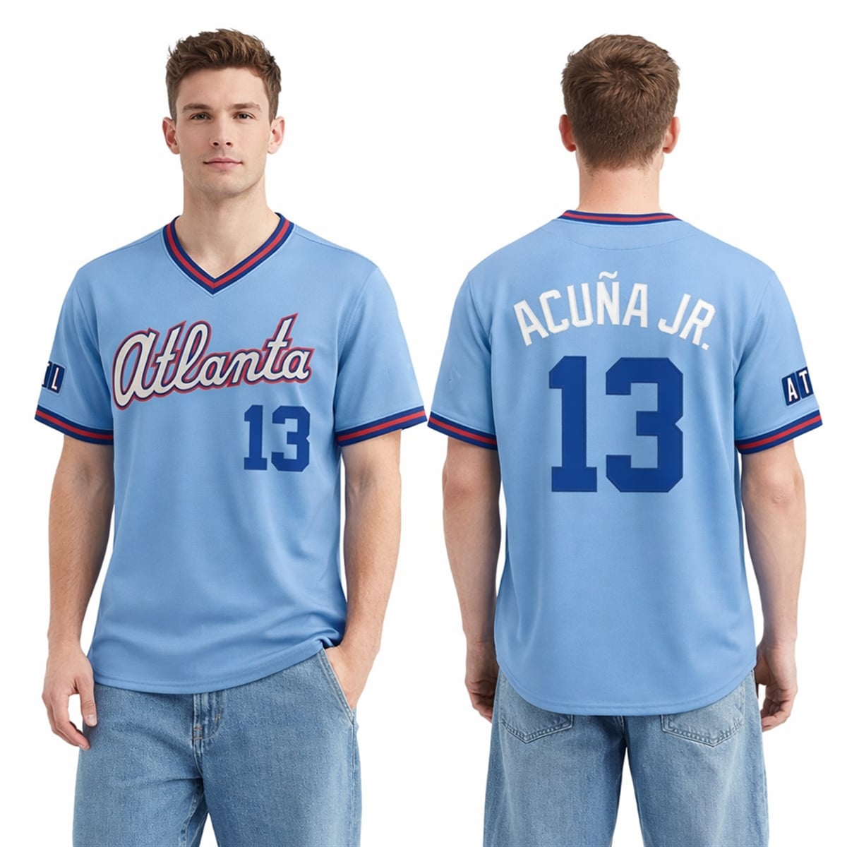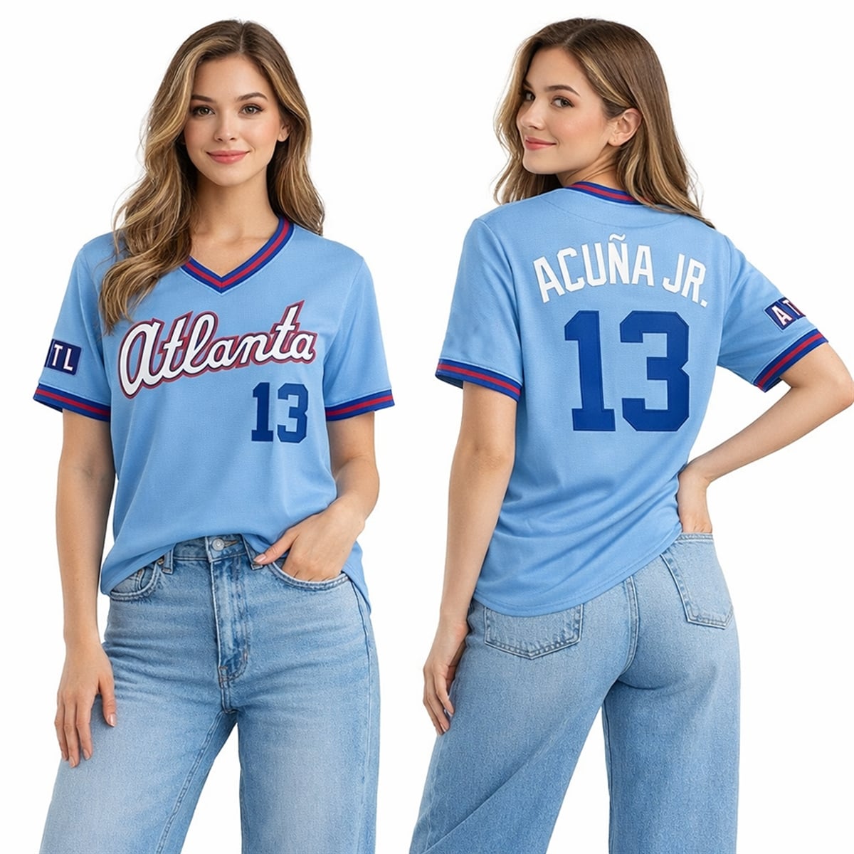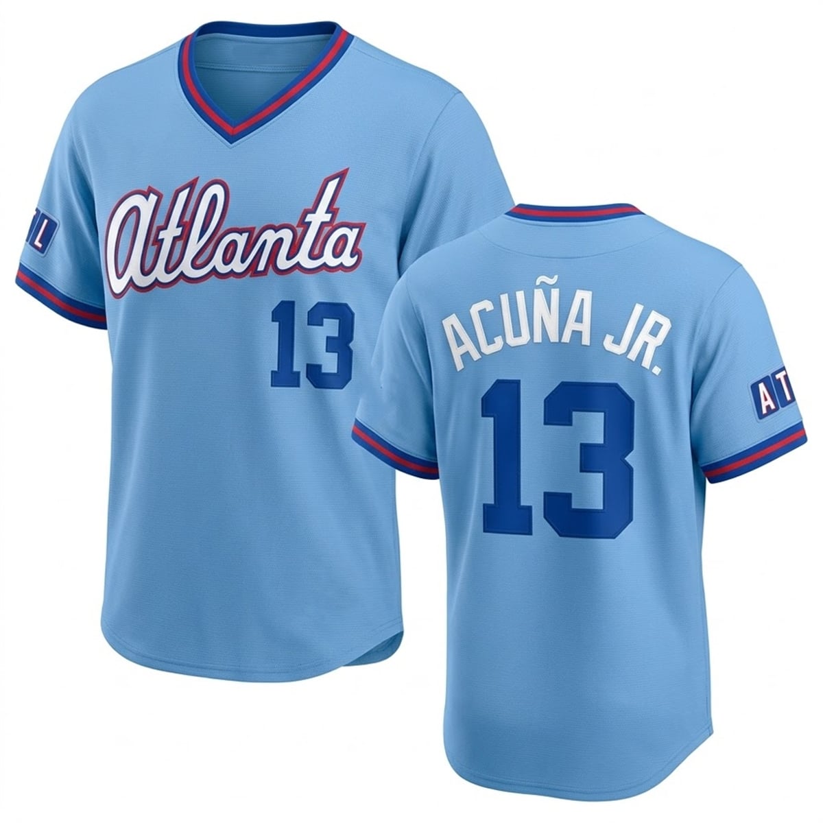 The jersey is a visual masterpiece that reimagines the team’s aesthetic identity for a modern era. The foundation of the design is a stunning powder blue hue, offering a fresh, bright alternative to the standard navy and white rotation. A classic V-neck silhouette is framed by distinctive red and royal blue striping, a motif that is seamlessly mirrored on the sleeve cuffs. Across the chest, the word “Atlanta” is styled in an elegant, sweeping retro script, colored in stark white with a contrasting red outline to ensure maximum visual impact. The back proudly displays the name “ACUÑA JR.” above the iconic number 13 in a bold, block-style typography. Completing the look is an “ATL” graphic patch on the sleeve, anchoring the piece firmly in the culture of the city.
