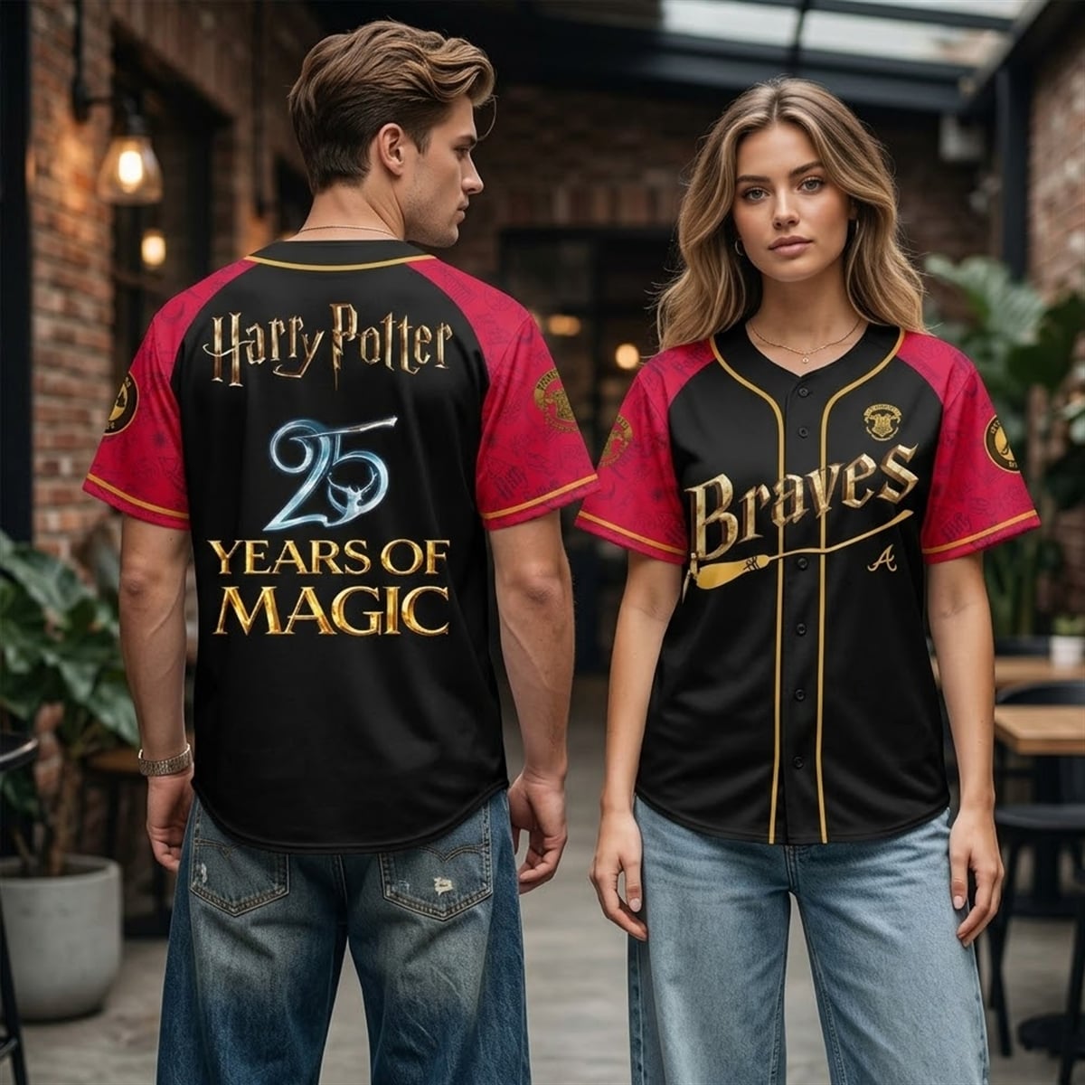 On the front, you’ll find a bold “Braves” logo, complemented by gold accents that symbolize the grandeur of the magical world. The vibrant red and pink sleeves are adorned with subtle, yet captivating, Harry Potter motifs, including the iconic “H” for Hogwarts and various wizarding symbols. On the back, the jersey features “Harry Potter” and the emblematic “25 Years of Magic“, highlighting the anniversary of J.K. Rowling’s extraordinary series. Whether you’re at a game or a magical event, this jersey effortlessly captures the magic and excitement of two worlds colliding.