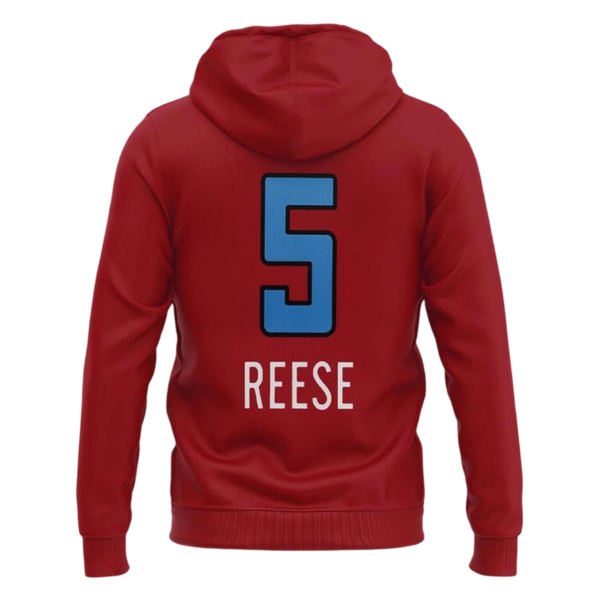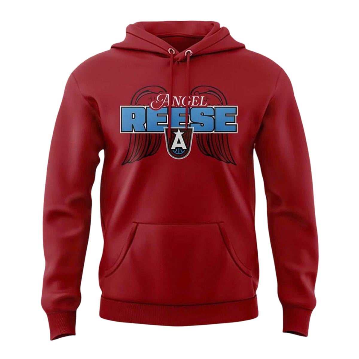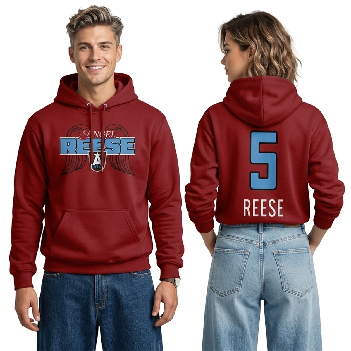 The hoodie is a masterclass in vibrant, player-driven sports fashion. The garment is anchored by a rich, deeply saturated red base that instantly commands attention. Across the chest, the word “REESE” is emblazoned in bold, block-style blue lettering with sharp white outlines, creating a striking visual contrast. Flanking the typography are meticulously illustrated angel wings, a direct nod to her first name and larger-than-life persona. Beneath the player’s name rests a stylized “A” logo, rooting the design firmly in her 2026 Atlanta journey. The back of the garment proudly displays an oversized, icy blue number “5” above her surname, ensuring her identity is unmistakable from every possible angle.