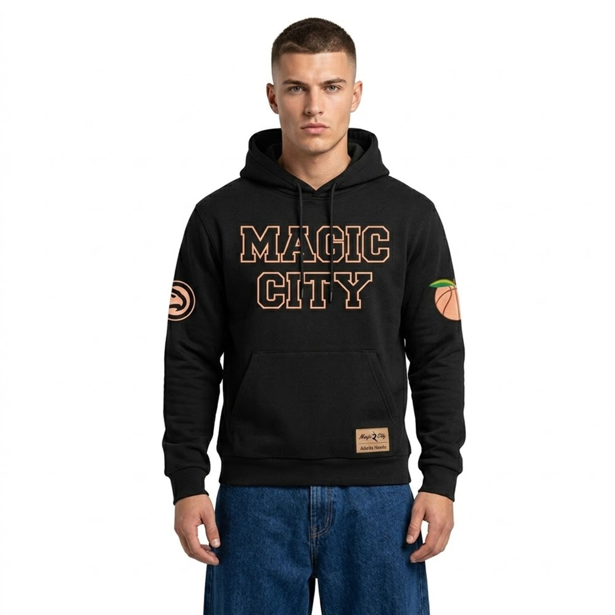 The hoodie is a visual masterpiece designed for those who understand the deep-rooted synergy between Atlanta’s sports scene and its world-famous entertainment culture. Set against a deep, midnight-black canvas, the centerpiece of this design is the bold “MAGIC CITY” lettering, styled in a distinctive collegiate outline and rendered in a vibrant peach hue.
