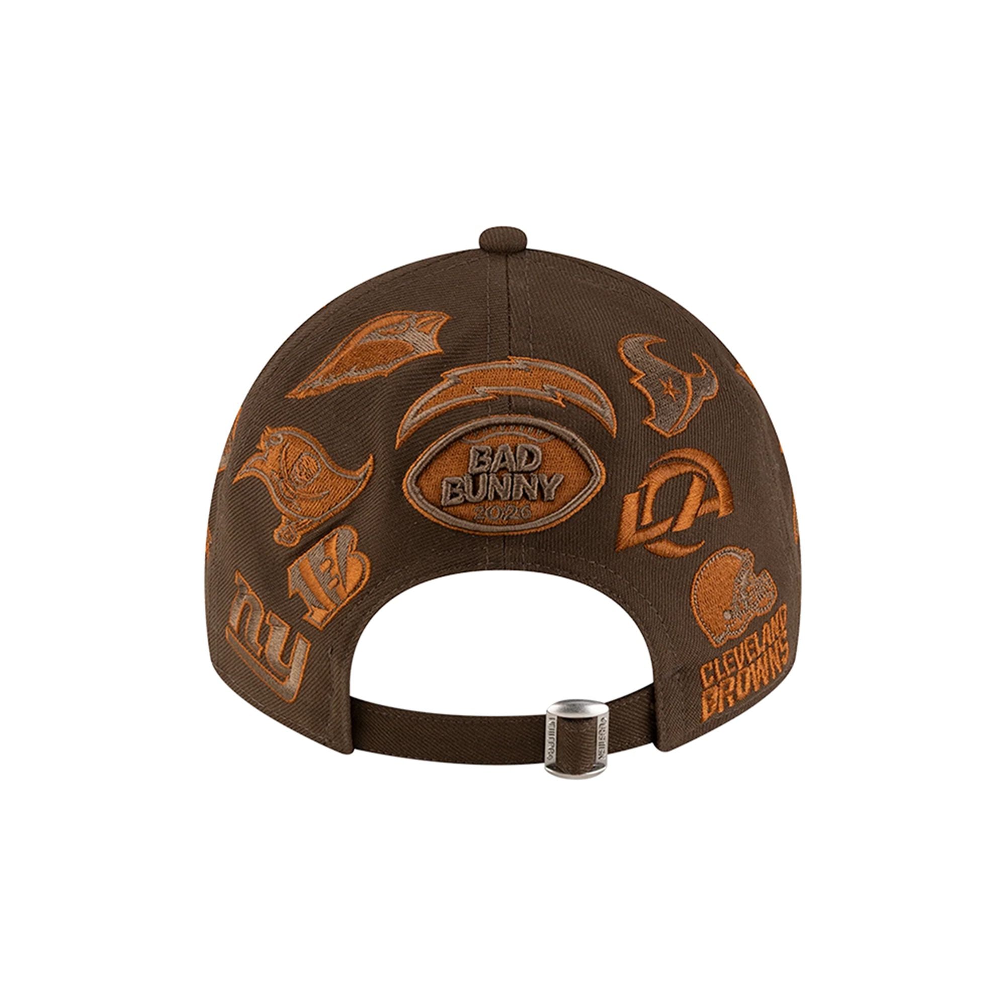 The front panels are densely packed with team insignias, creating a texture that looks almost like an abstract pattern from a distance. The chaos resolves into clarity upon closer inspection, revealing the intricate stitching of each franchise’s emblem. The back of the cap anchors the design with a football-shaped badge reading “BAD BUNNY 2026,” confirming its status as tour merchandise. The adjustable strap with a metal buckle ensures a custom fit for any head shape, maintaining the classic “dad hat” silhouette that has dominated 2020s fashion.