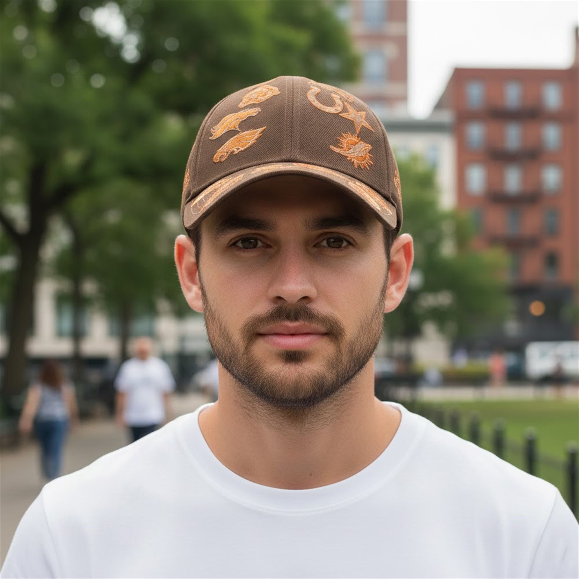 The hat is a masterclass in maximalist design executed with a minimalist palette. While most sports merchandise screams with clashing primary colors, this piece takes a sophisticated, monochromatic approach. The hat features the logos of all teams—from the Chiefs and Eagles to the Dolphins and Broncos—in stunning tonal shades of bronze, copper, and caramel against a deep, earth-tone brown base.