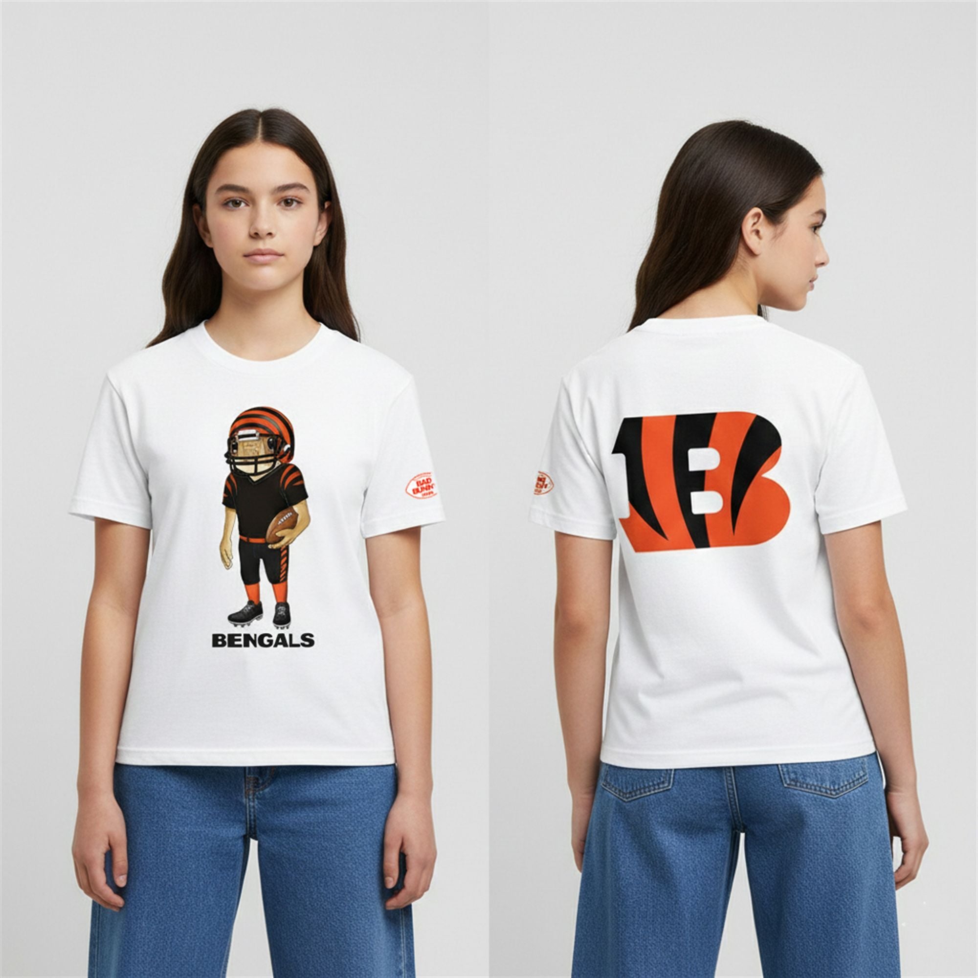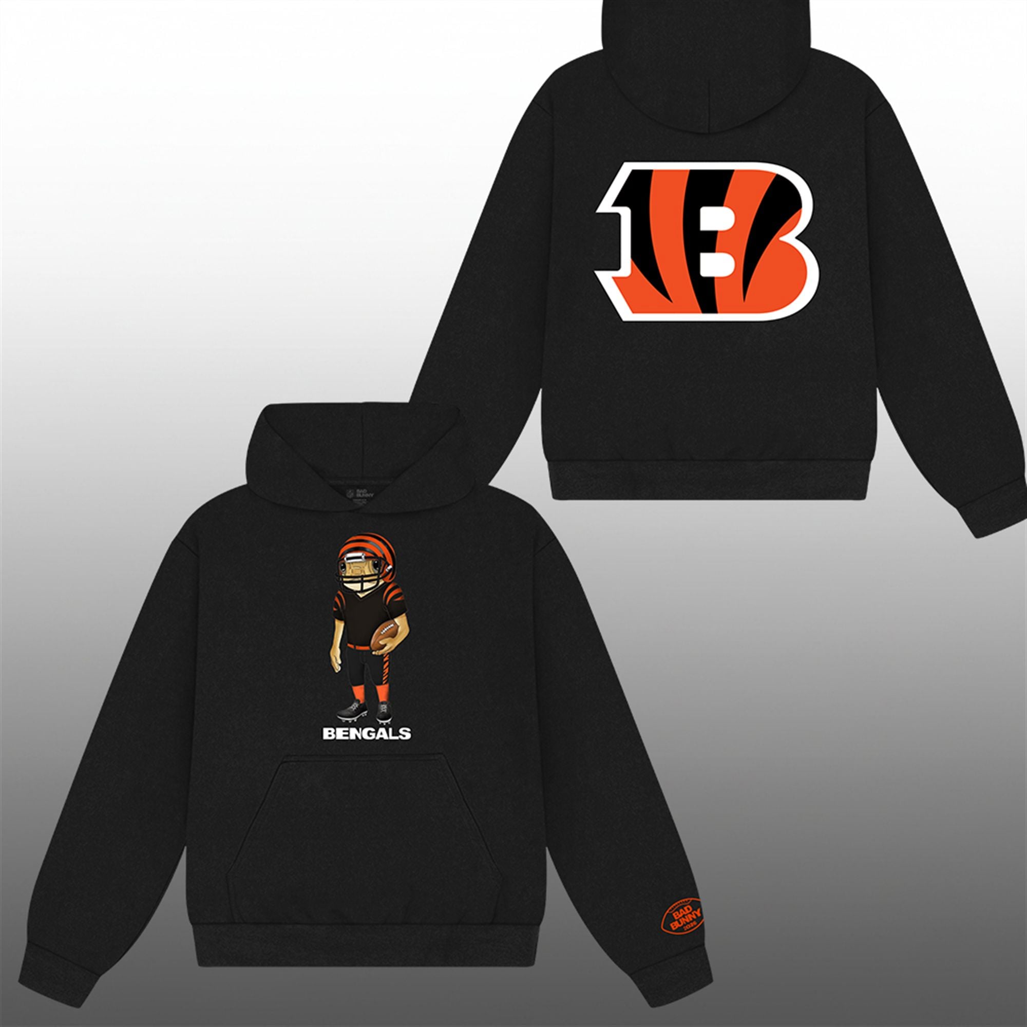 For the fan who demands more than the standard team logo, this graphic tee delivers a bold statement. The design features the viral Sapo Concho character—Benito’s symbol of Puerto Rican resilience—suited up in full Bengals gridiron gear. Complete with a striped helmet, jersey, and football, the mascot stands ready to lead the charge at Paycor Stadium. The back of the shirt anchors the design with a massive, tiger-striped Cincinnati Bengals “B” logo, ensuring your allegiance is visible from every angle. This is the standout piece of the 2026 season, bridging the gap between hardcore football fandom and high-end streetwear culture.