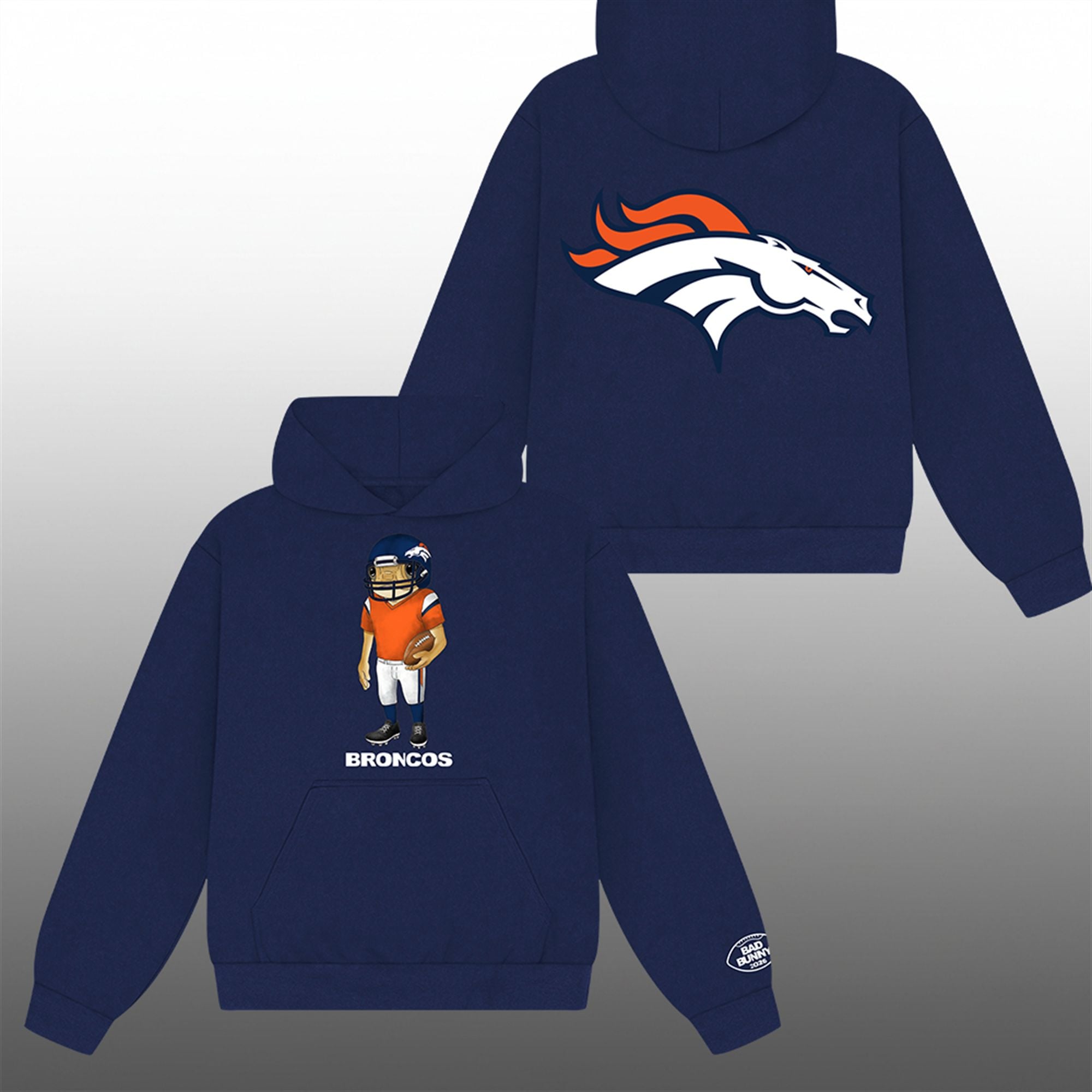 This isn’t your standard team jersey. The front of the shirt showcases the iconic “Sapo Concho“—the Puerto Rican crested toad that became the symbol of Bad Bunny’s nadie sabe lo que va a pasar mañana and DTMF era—donning a vintage-style football helmet and clutching a pigskin. The back proudly displays the classic Denver Broncos logo, anchoring the avant-garde design in deep-rooted sports tradition.