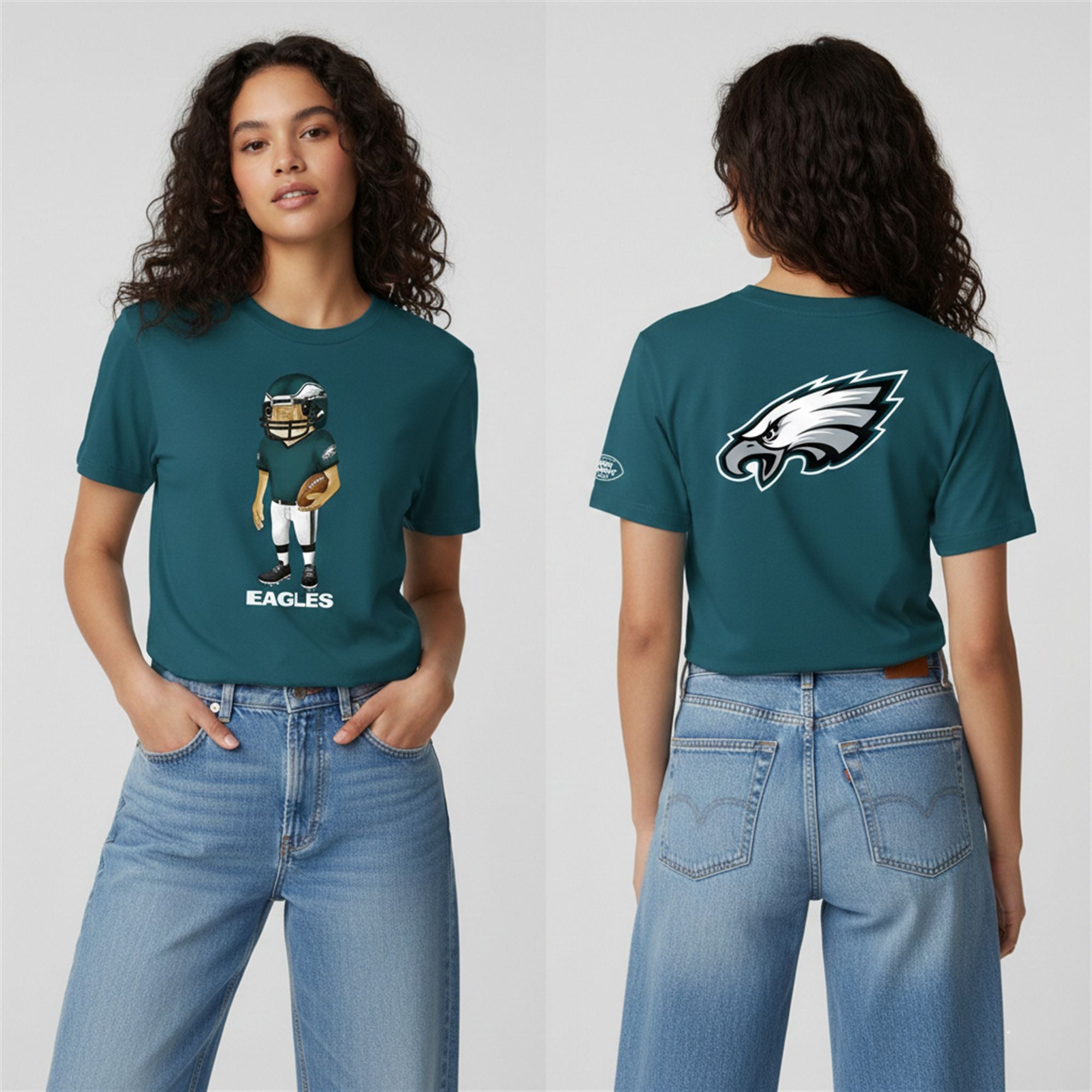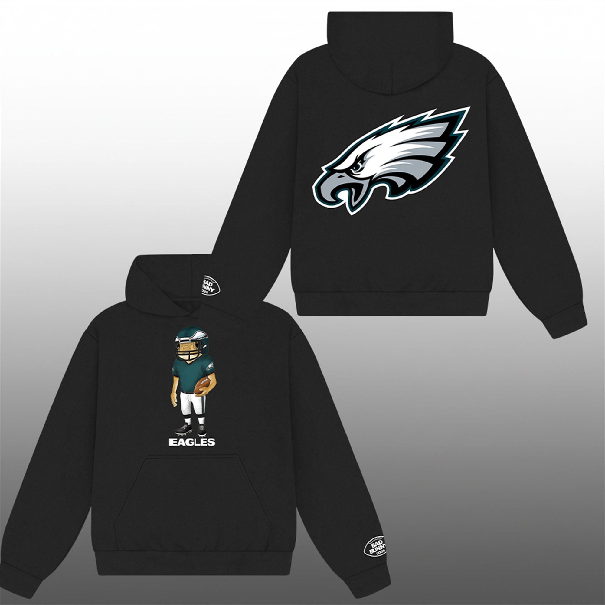 The design front and center features the iconic “Concho” character—the personification of Bad Bunny’s emotional and artistic aesthetic—suited up for battle. Donning a regulation football helmet, jersey, and cleats, the character stands ready to play, humanizing the mascot in a way that is both hilarious and endearing. On the back, the crisp, classic Eagles logo reminds everyone where your loyalty lies, creating a balanced aesthetic that looks as good at a concert as it does at a sports bar.