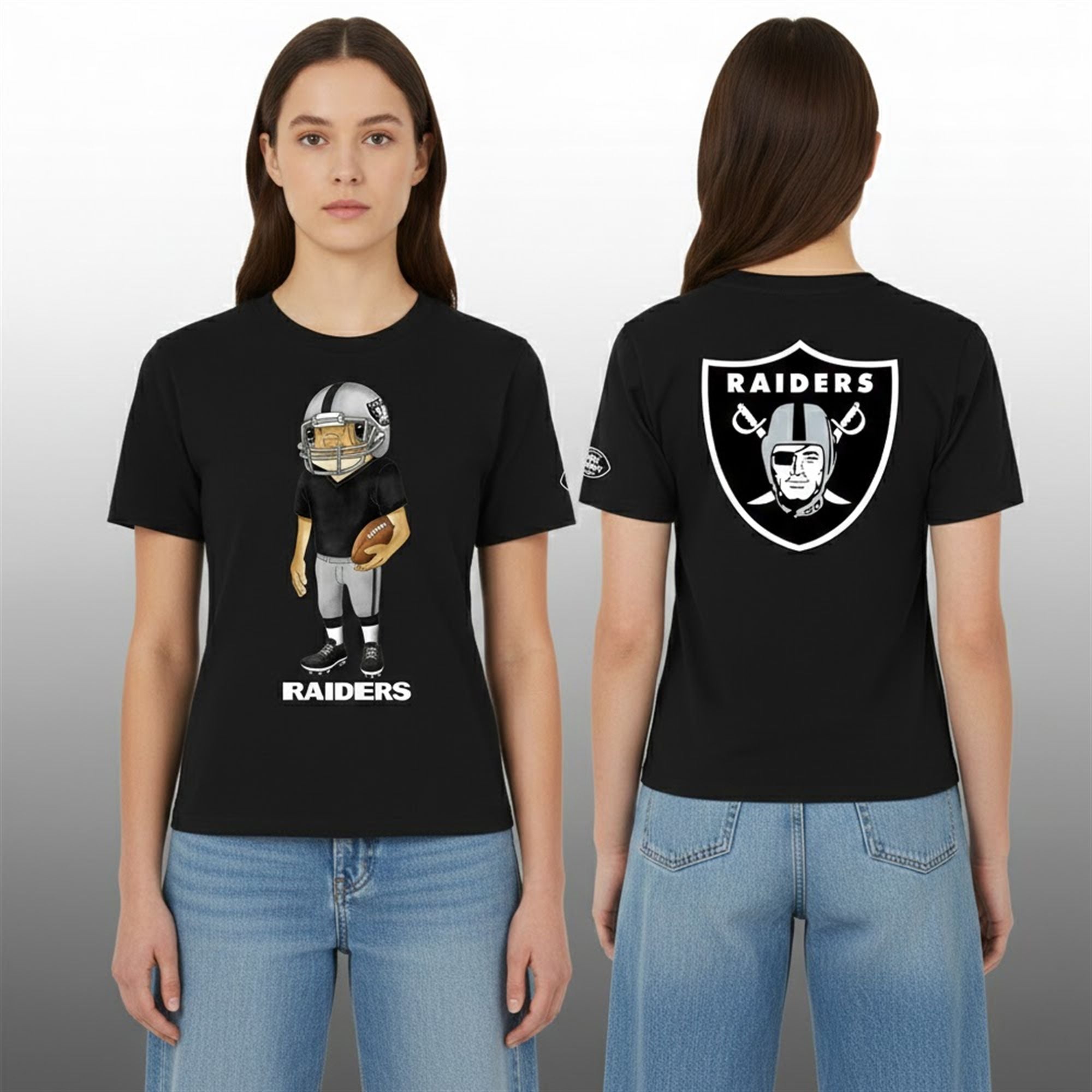 The front of the shirt features the “Concho” character—a fan-favorite mascot stylized in full Raiders game gear, complete with a helmet and football. It softens the traditional “tough guy” image of football with a playful, animated vibe that appeals to a younger, diverse demographic. On the reverse, the classic Raiders shield remains untouched, preserving the integrity and tradition of the franchise. This dual-sided design ensures that you are respected in the stands and recognized in the streets.