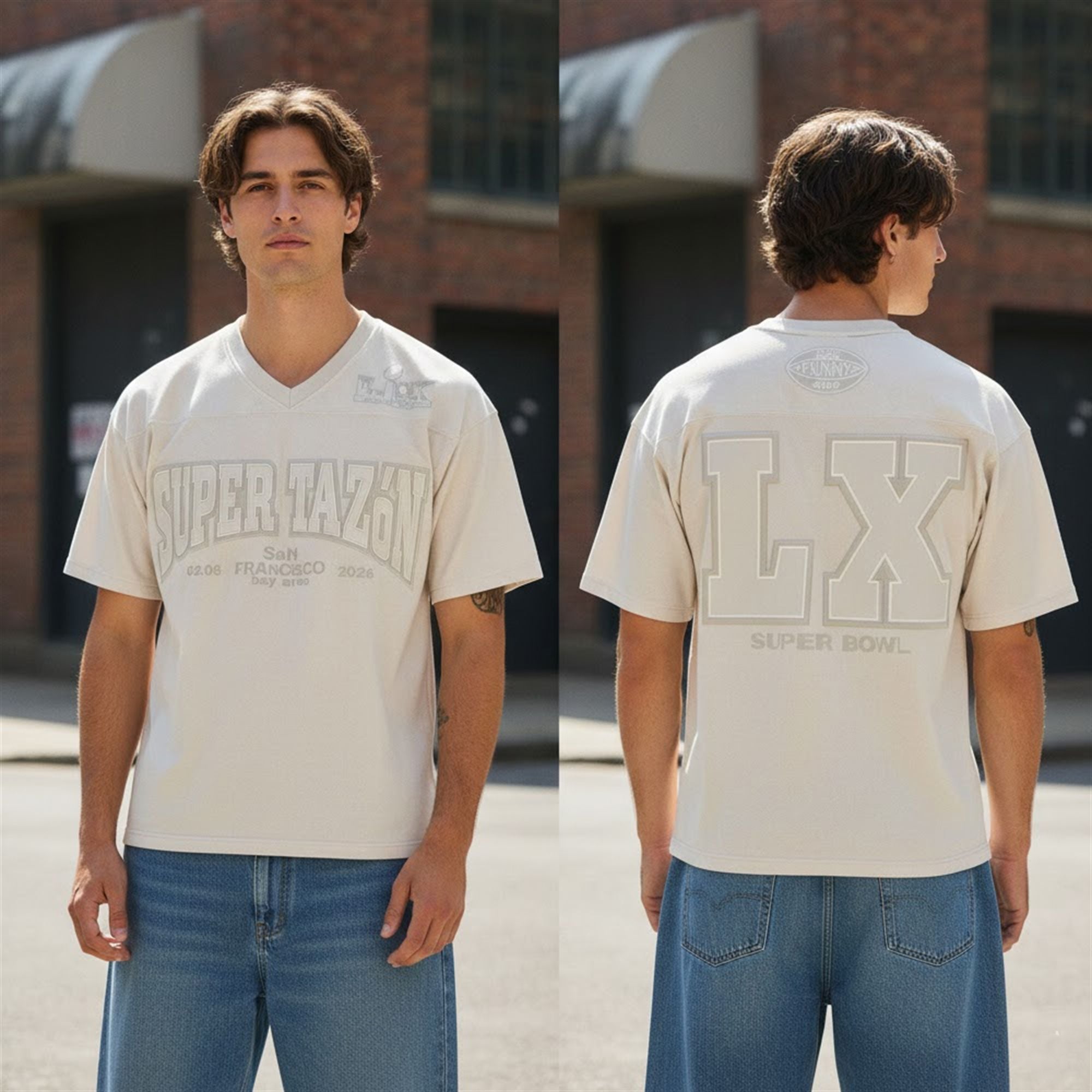 Visually, the jersey commands attention through its monochromatic sophistication. The base color is a subtle, sandy beige—a deliberate departure from the loud, primary colors typically found in merchandise. This neutral palette allows the raised, textured lettering to pop without overwhelming the eye. The front displays “SUPER TAZON” in an authoritative, collegiate-style font, arcing over the specific date “02.08″ and location “SAN FRANCISCO 2026 bay area.” This layout mirrors the tour merch aesthetic that fans have come to expect from Bad Bunny’s creative team, blending concert memorabilia vibes with athletic uniforms.