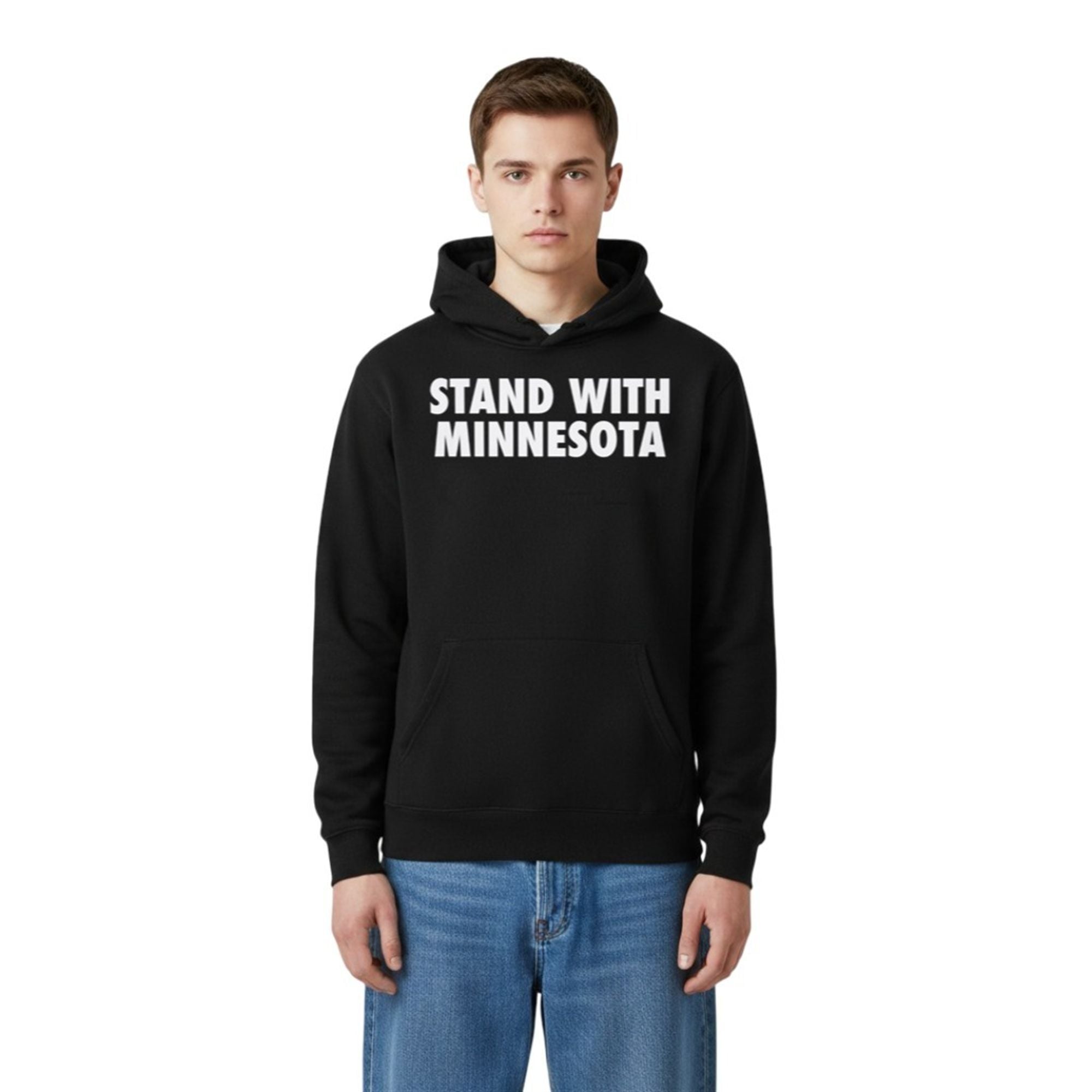 This item is designed for the modern sports enthusiast who values authenticity. The design relies on a minimalist, impactful aesthetic: a stark black canvas featuring the slogan “STAND WITH MINNESOTA” in authoritative, block-letter white text. It is a timeless look that transcends fleeting trends, focusing instead on the powerful message of unity between the franchise, the city, and the fans.