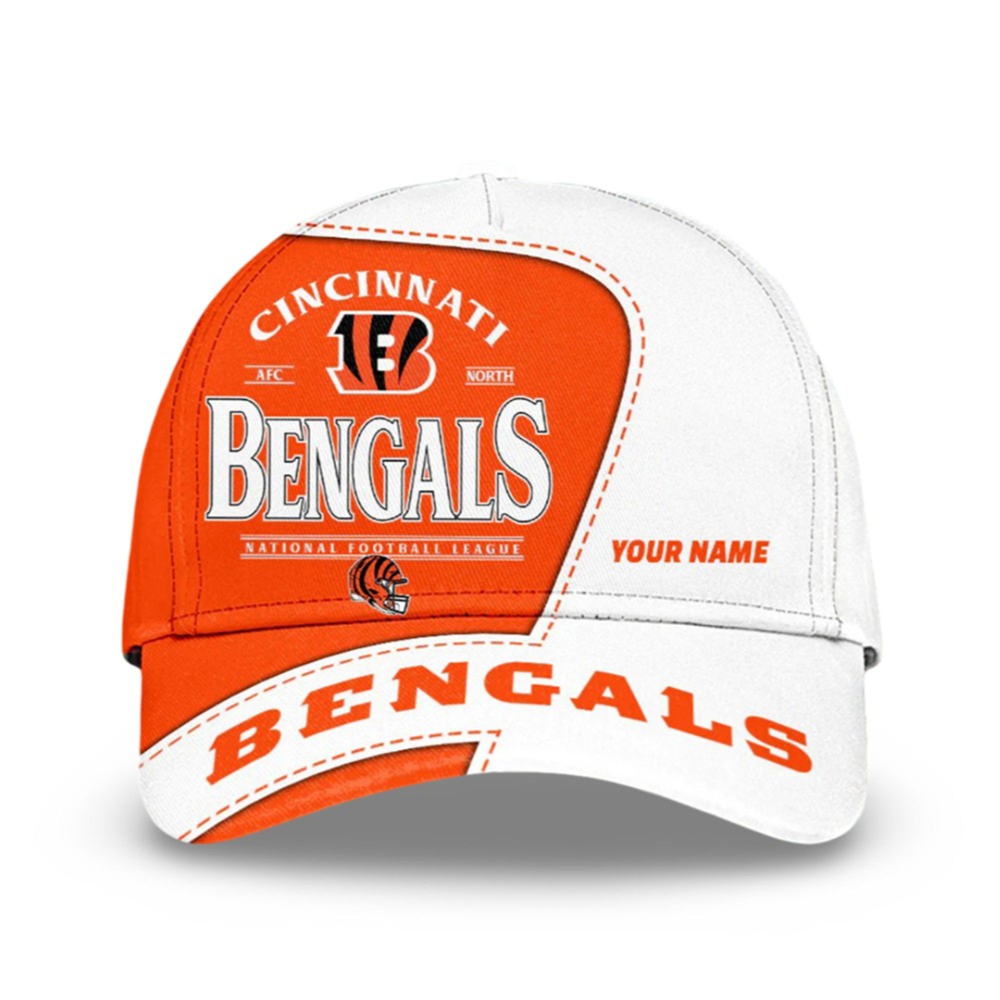 The hat is a striking piece of headwear that captures the energy of a winning season. The design features a dynamic, diagonal split: a vibrant “Bengals Orange” panel on the left housing the “B” logo and AFC North insignia, contrasted against a crisp white panel on the right reserved for your unique customization.