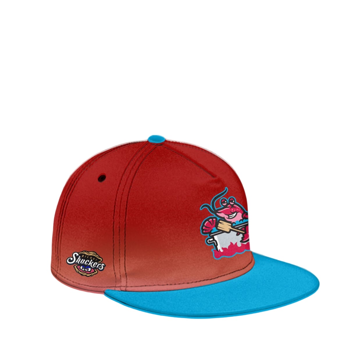 The front of the jersey proudly displays the “BILOXI MUDBUGS” wordmark in a bubbly, playful teal and pink font, accompanied by a clever graphic of a crawfish claw gripping a wooden boiling paddle. The true showstopper, however, is on the back. It features a massive, wildly entertaining illustration of a cartoon crawfish relaxing with a smile inside a boiling pot, surrounded by vibrant teal bubbles and red-hot flames. A matching cap completes the aesthetic, ensuring fans can sport the full theme from head to toe.