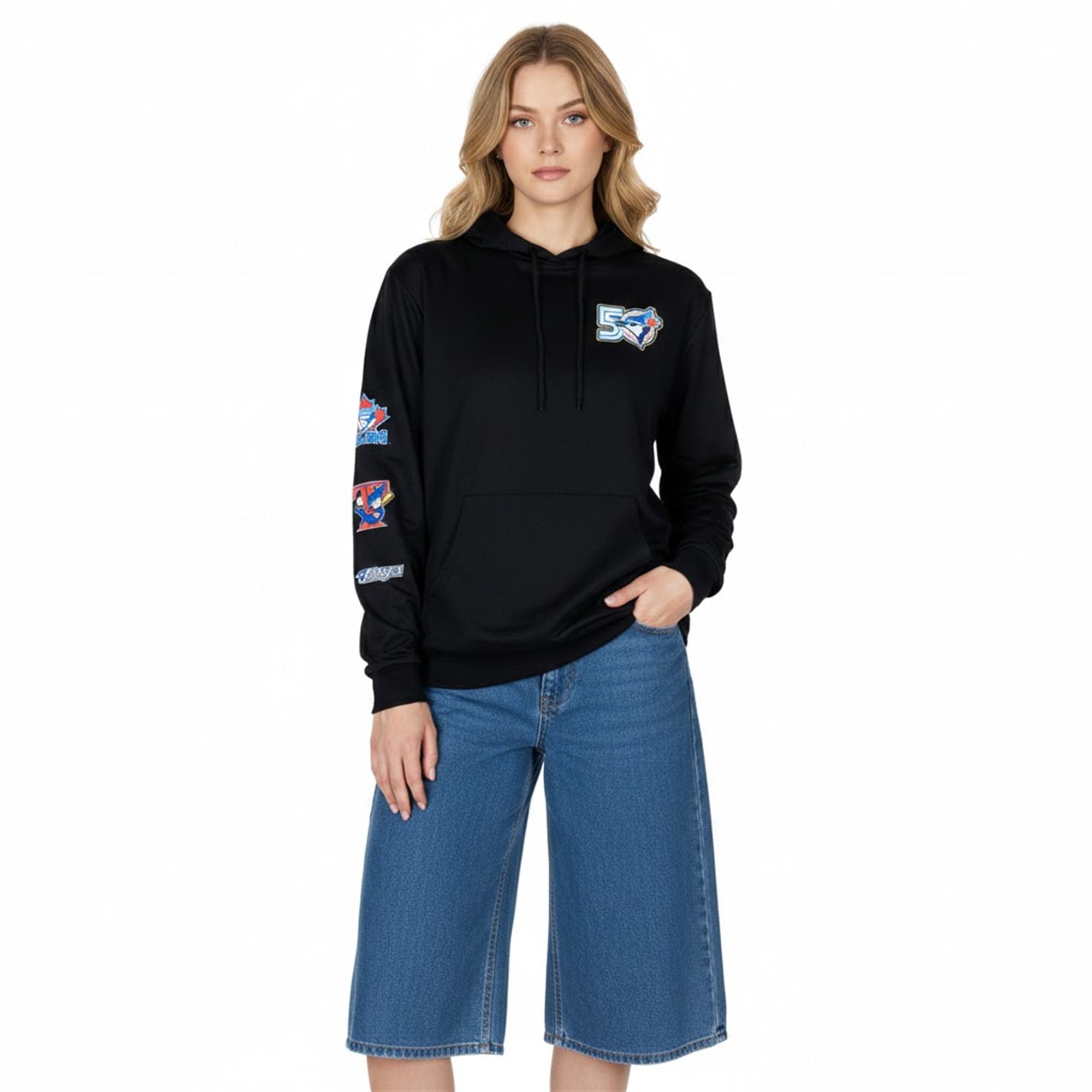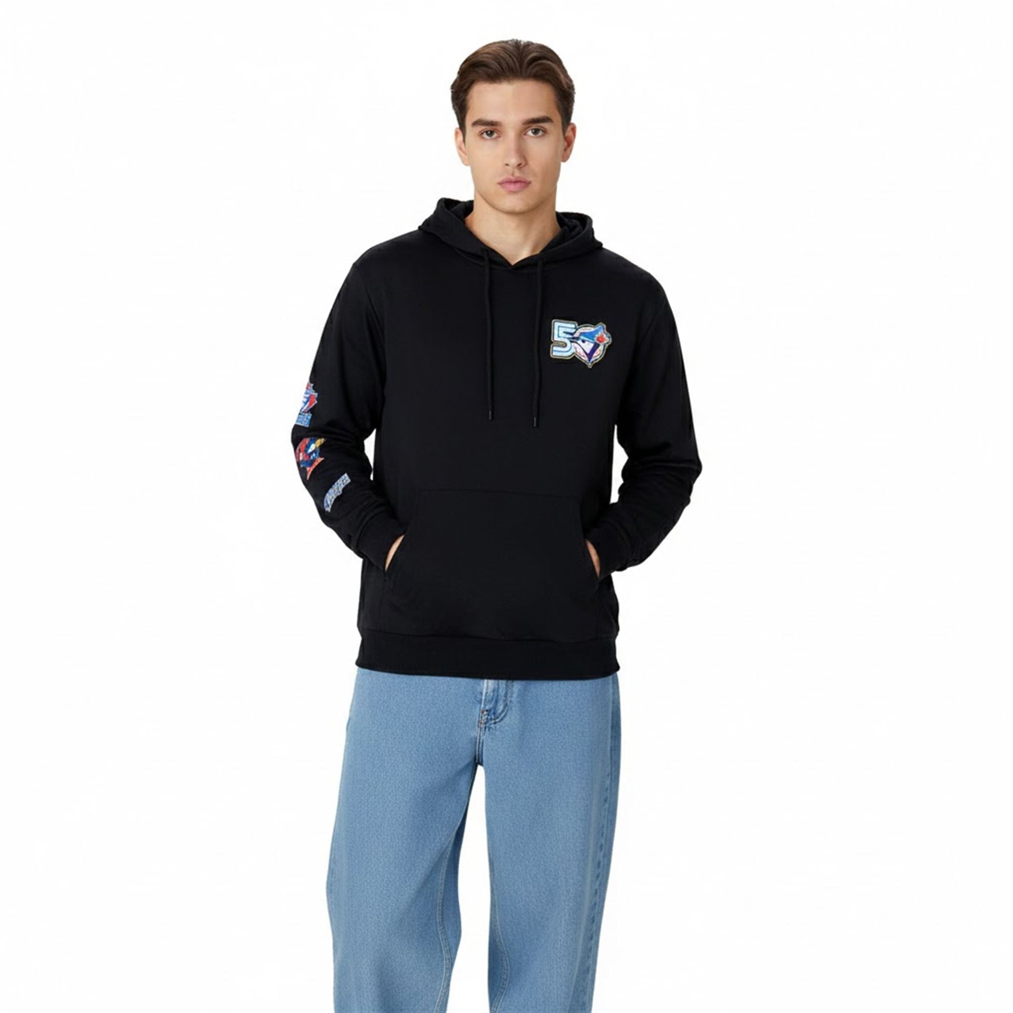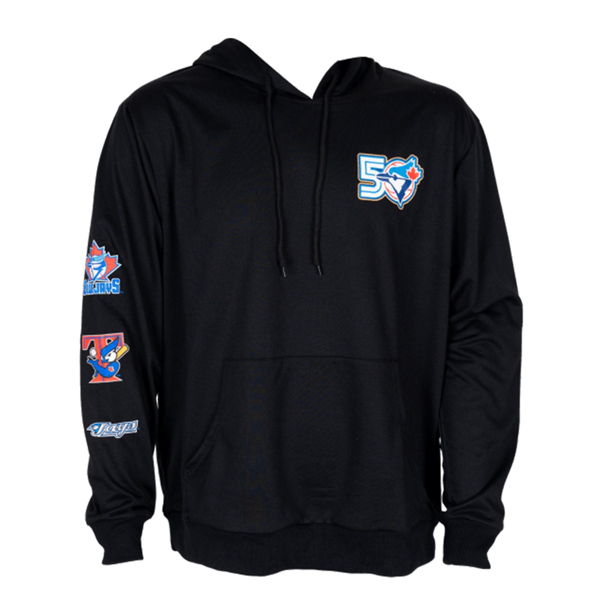 The chest piece anchors the design with a massive “50” commemorative logo, integrating the classic Blue Jay profile into the typography, symbolizing the team’s half-century permanence in the league. However, the true draw for collectors is the right sleeve. It functions as a timeline, vertically stacking the franchise’s changing identities. From the classic maple leaf backing to the “T-Bird” era and the stylized script of the mid-2000s, this garment allows you to wear the entire history of the team on your arm.
